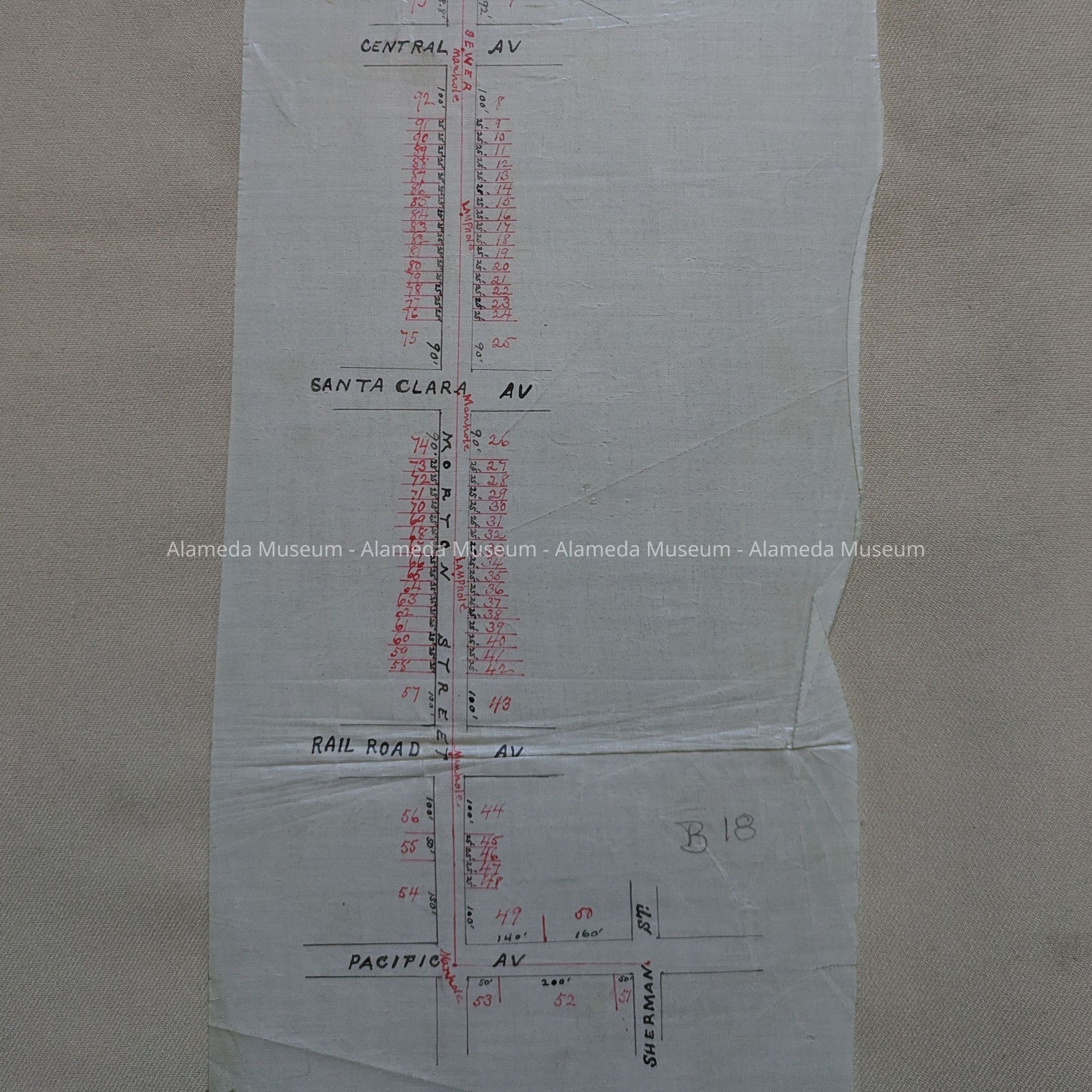 Description: A Plan, hand-drawn on off-white linen paper, with blocks marked in black ink and with property, sewer lines, manholes and lampholes in red ink. Title: ‘Diagram Morton St. sewer line, manholes and lampholes’. In pencil, ‘B18’.