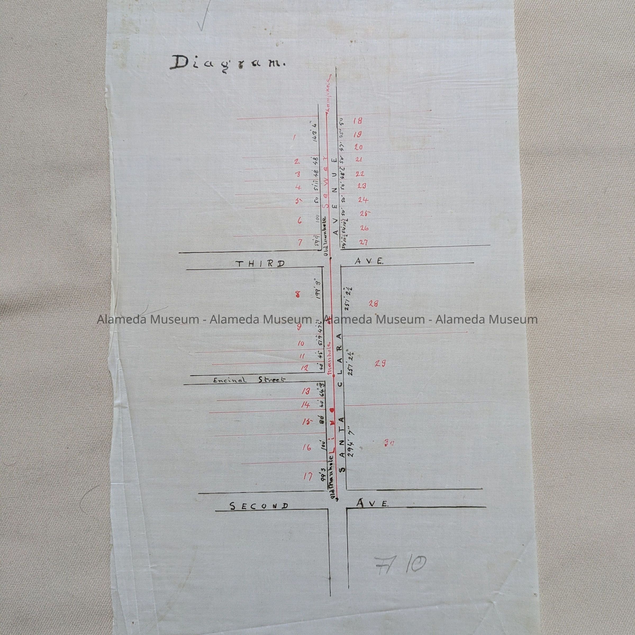 Description: A Plan, hand-drawn on off-white linen paper, with blocks marked in black ink and with property, sewer lines, manholes and lampholes in red ink. Title: ‘Diagram Santa Clara Avenue sewer line, manholes and lampholes’. In pencil, ‘A 10’.