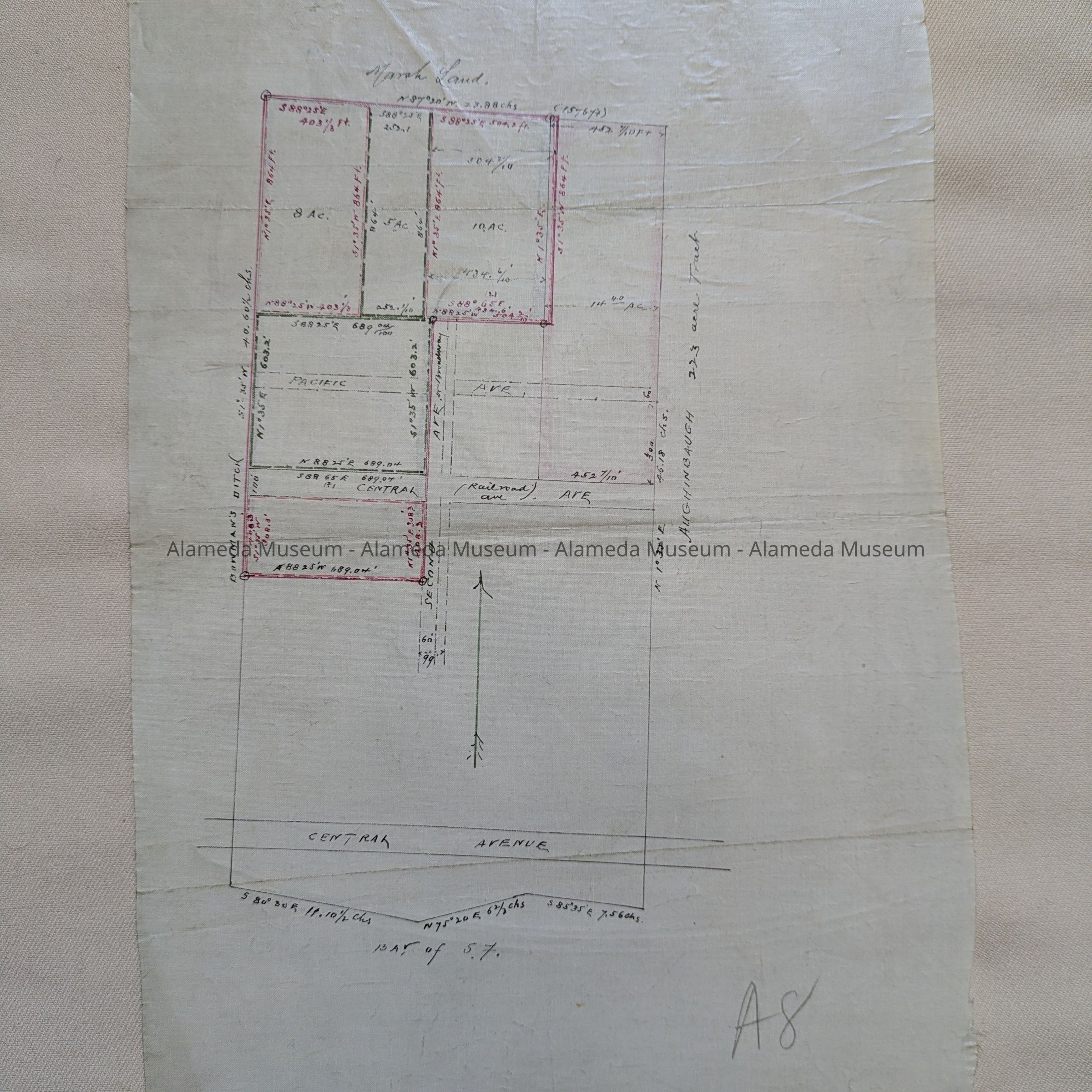 Description: A Plan, hand-drawn on off-white linen paper, with blocks marked in black ink and with property lines in red ink. Title: ‘Diagram Second Avenue property lines’. In pencil, ‘A 8’.