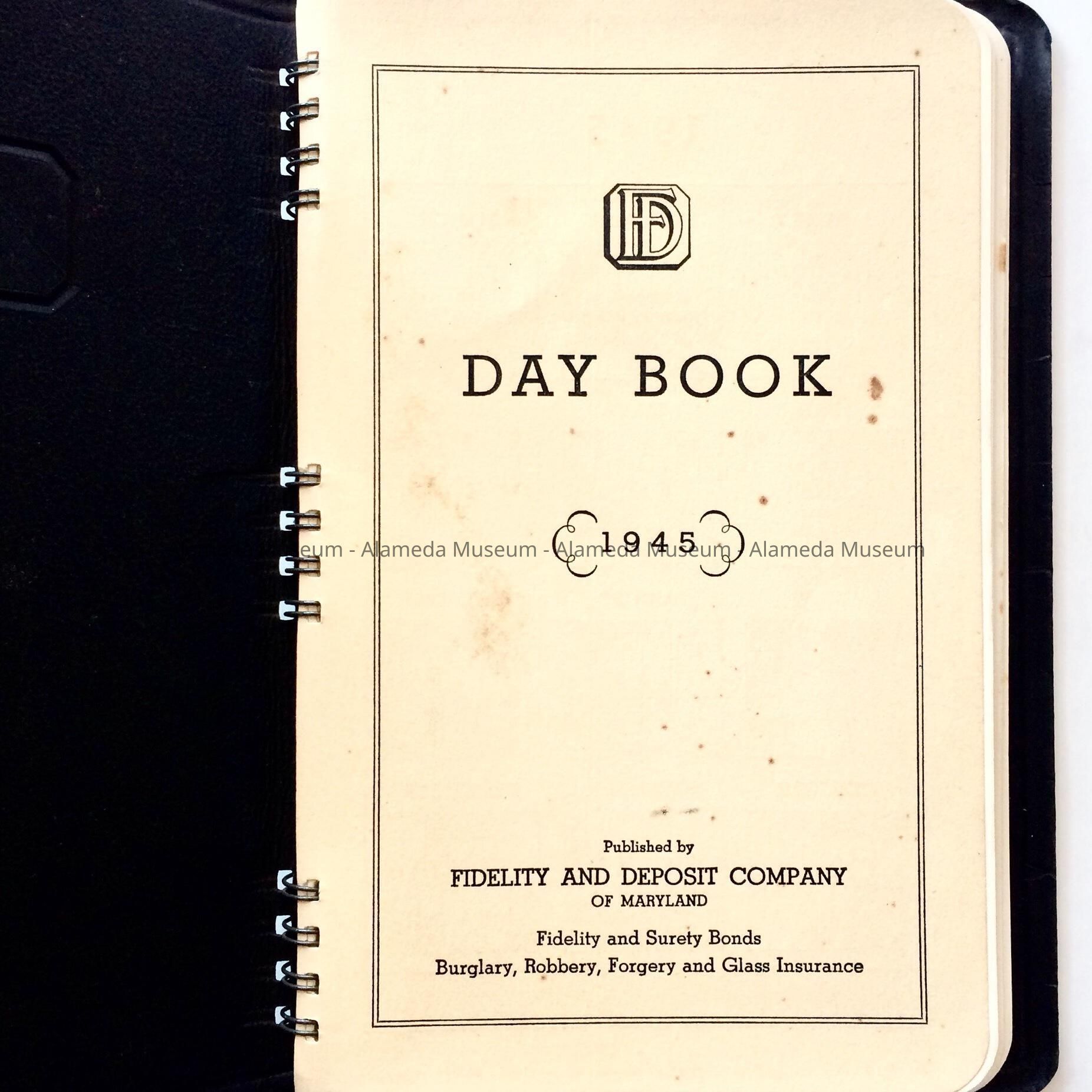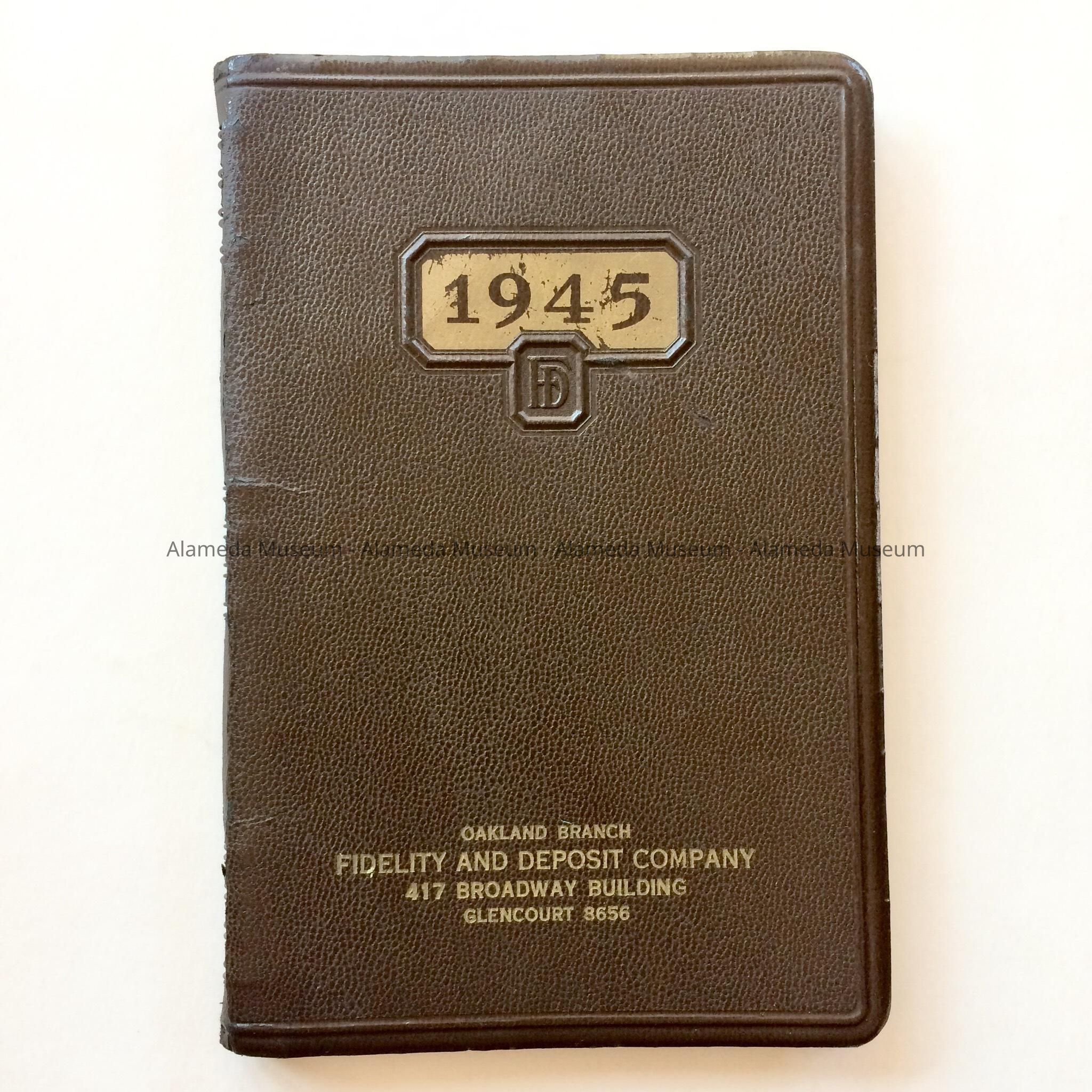 Description: A spiral-bound book with dark brown leather-look plastic cover, with caption '1945' and 'Oakland branch Fidelity and Deposit Company'. Inside, each page has space for 4 days, 2 on each side, with caption (the date) printed in black with handwritten notes.