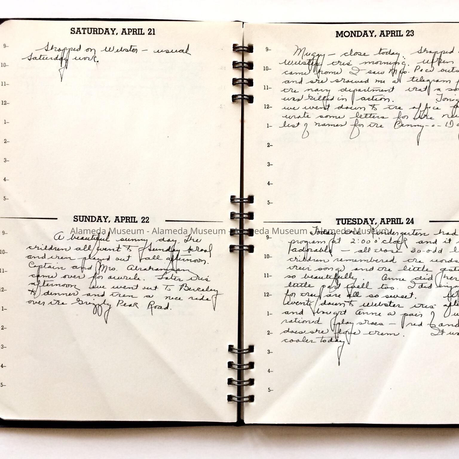 History of Object: Date book used as a diary by Marie Neville, nee Beidleman (1913-2003), of 765 Santa Clara, when she was a young mother. She was a member of the Welfare Council, attended Christ Episcopal Church, and would later be active in the Adelphian Club. Husband Blevin Frederick Neville (1904-1973) operated a real estate business at 1514 Webster Street, started by his father, Francis Rufus Neville (1870-1955), who had also been involved in the Alameda Improvement Society, and had bought the house with his wife in 1903. The younger couple had one daughter, Anne Marie Hurff (1939-1968). The house was sold in 2004.