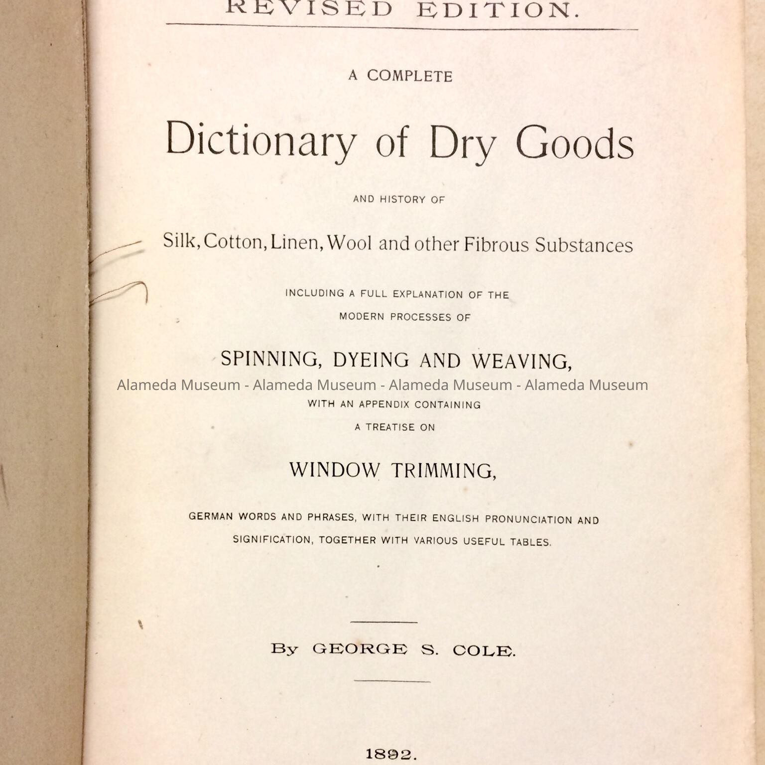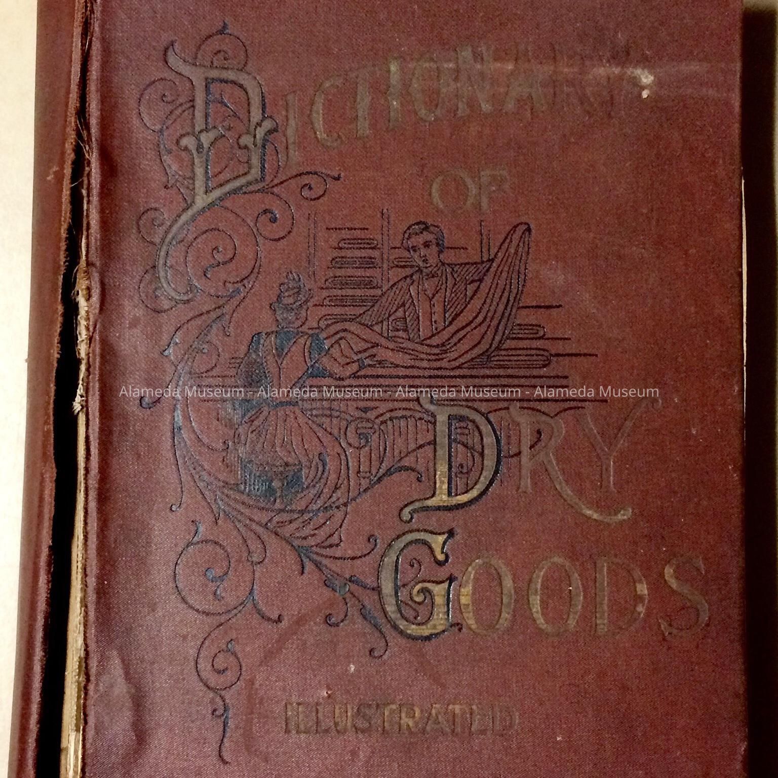 Description: Hard bound book with illustrated cover of brown colored buckram. The cover has caption: "Dictionary of Dry Goods" in gold and black colored type.
