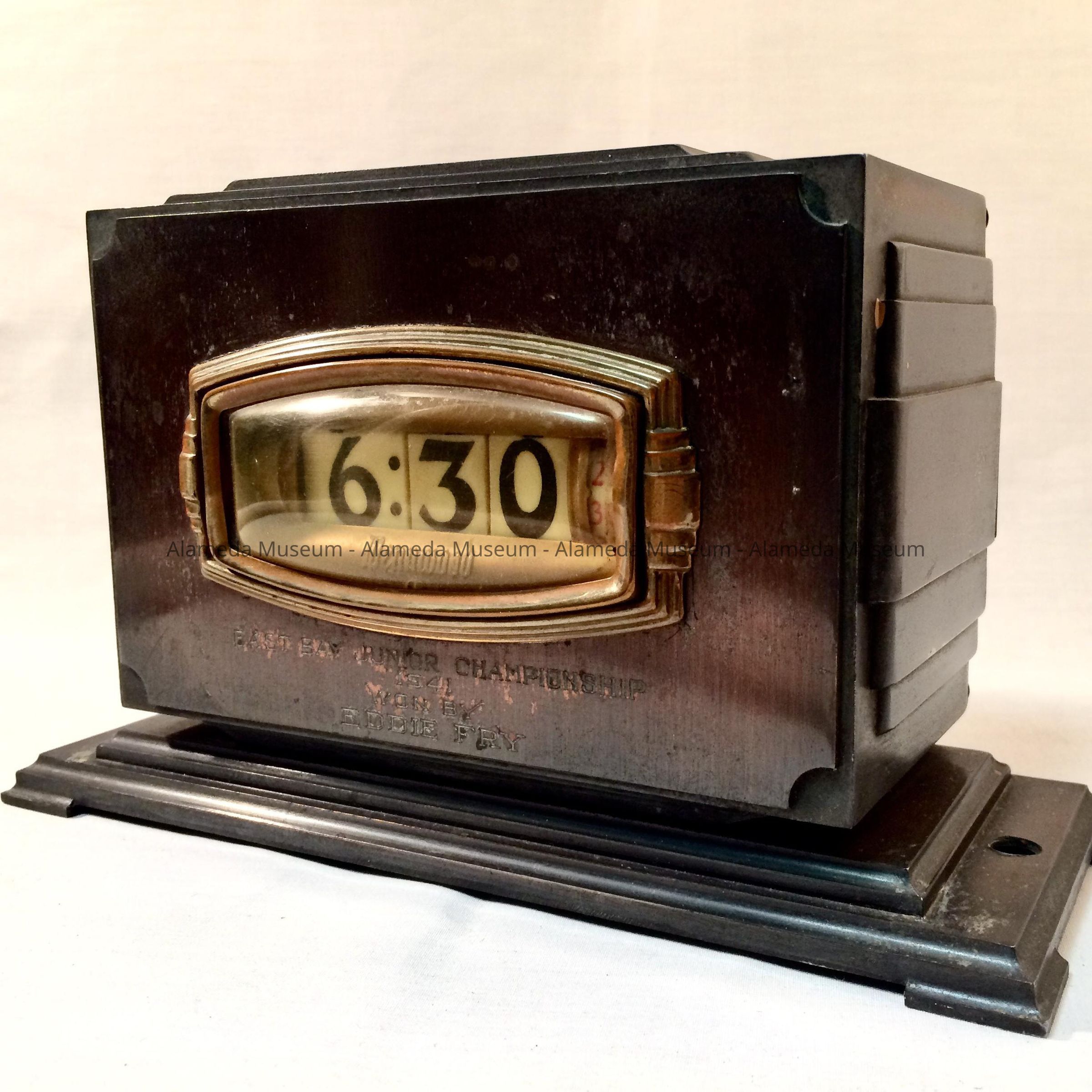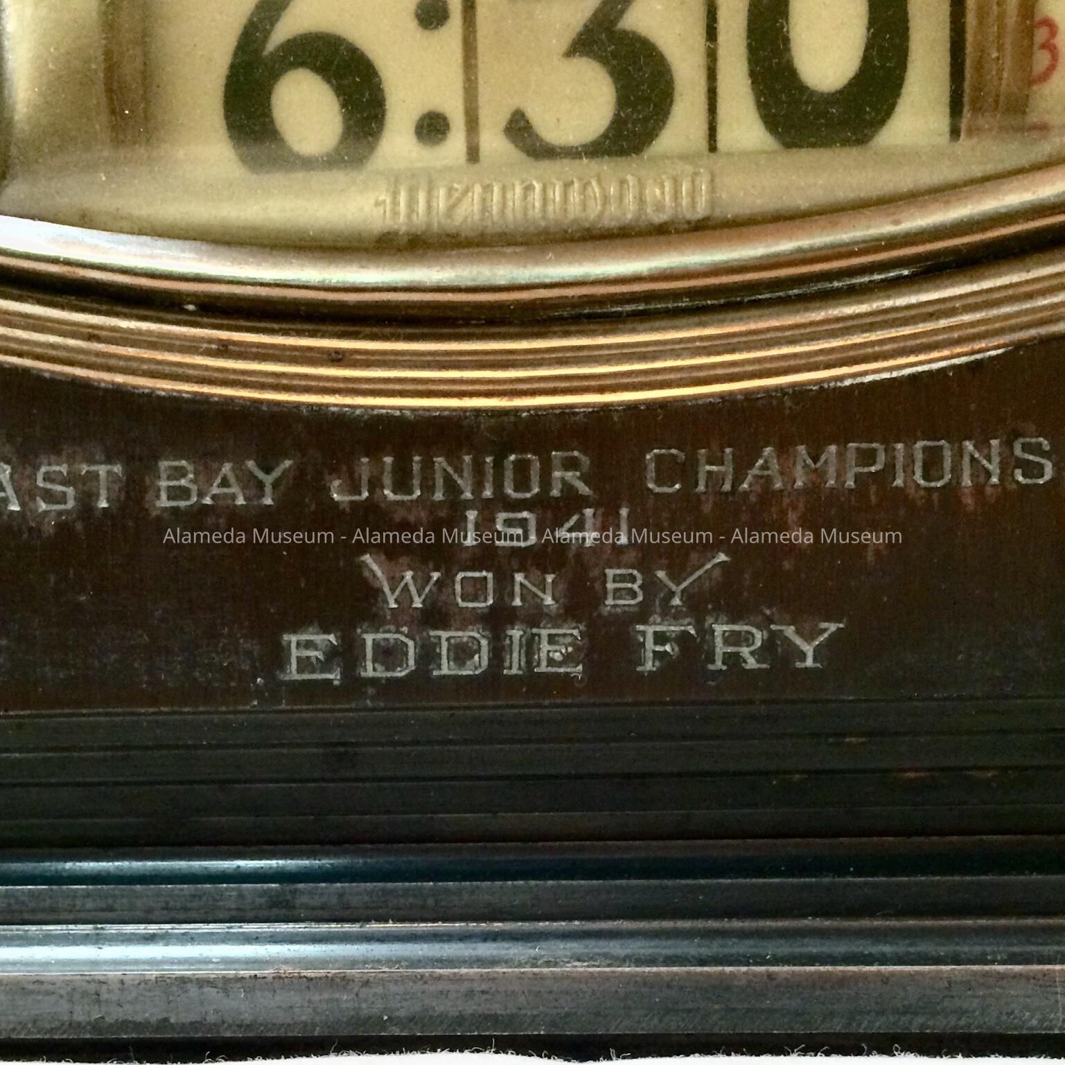 DESCRIPTION: A TROPHY IN THE FORM OF A DIGITAL CLOCK IN AN IMITATION BRONZE CASE. CASE IS MARKED, "EAST BAY JUNIOR CHAMPION, 1941." CASE IS MISSING THE STATUETTE FROM ITS TOP. THE TROPHY WAS AWARDED TO EDDIE FRY.