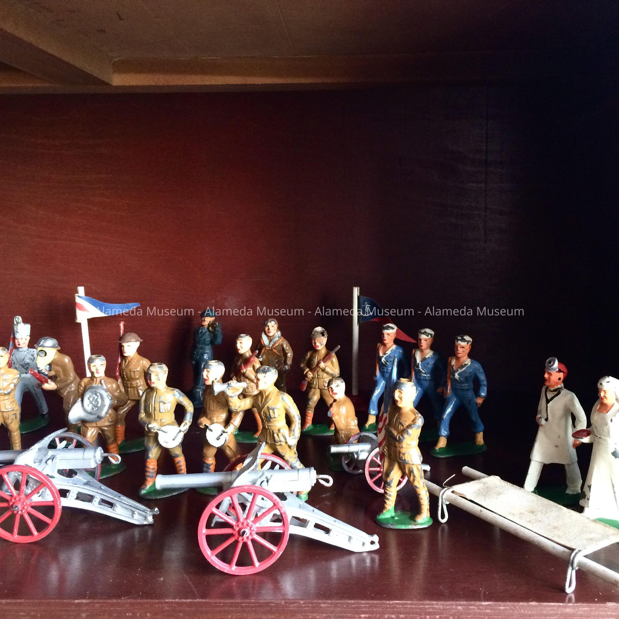 History of Objects: Tin army figurines of the Martin family of 1419 Mound Street. No manufacturer's markings were detected, but the figures are typical of the short stride (c. 1934) and long stride (c. 1937) Barclay soldiers. These would be sold in Five-and-Dime stores such as Woolworths.
