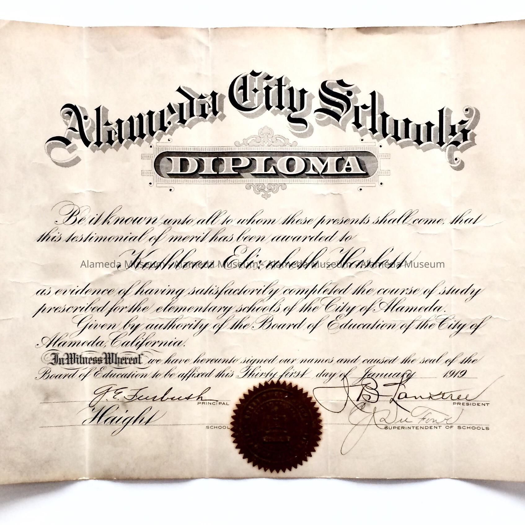 Description: Printed diploma with bold type heading "Alameda City Schools Diploma," and inscribed in elaborate handwritten script "Kathleen Elizabeth Haslett."