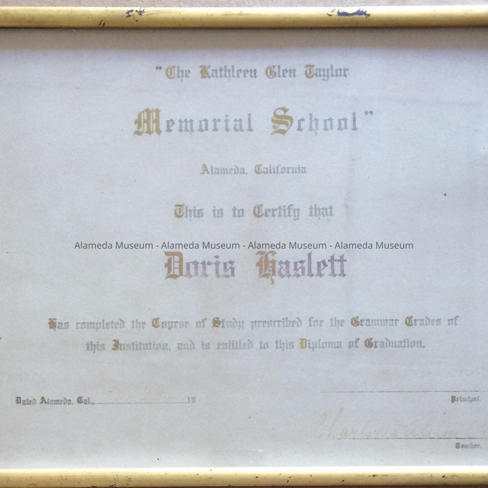 History of Object: Diploma awarded to Doris Haslett, from the Kathleen Glen Taylor Memorial School, Alameda, Calif. Date unknown.