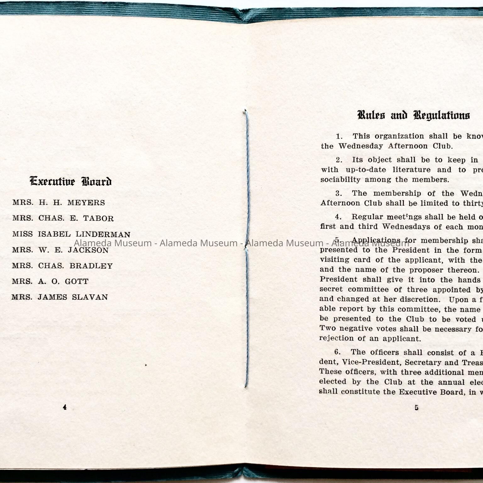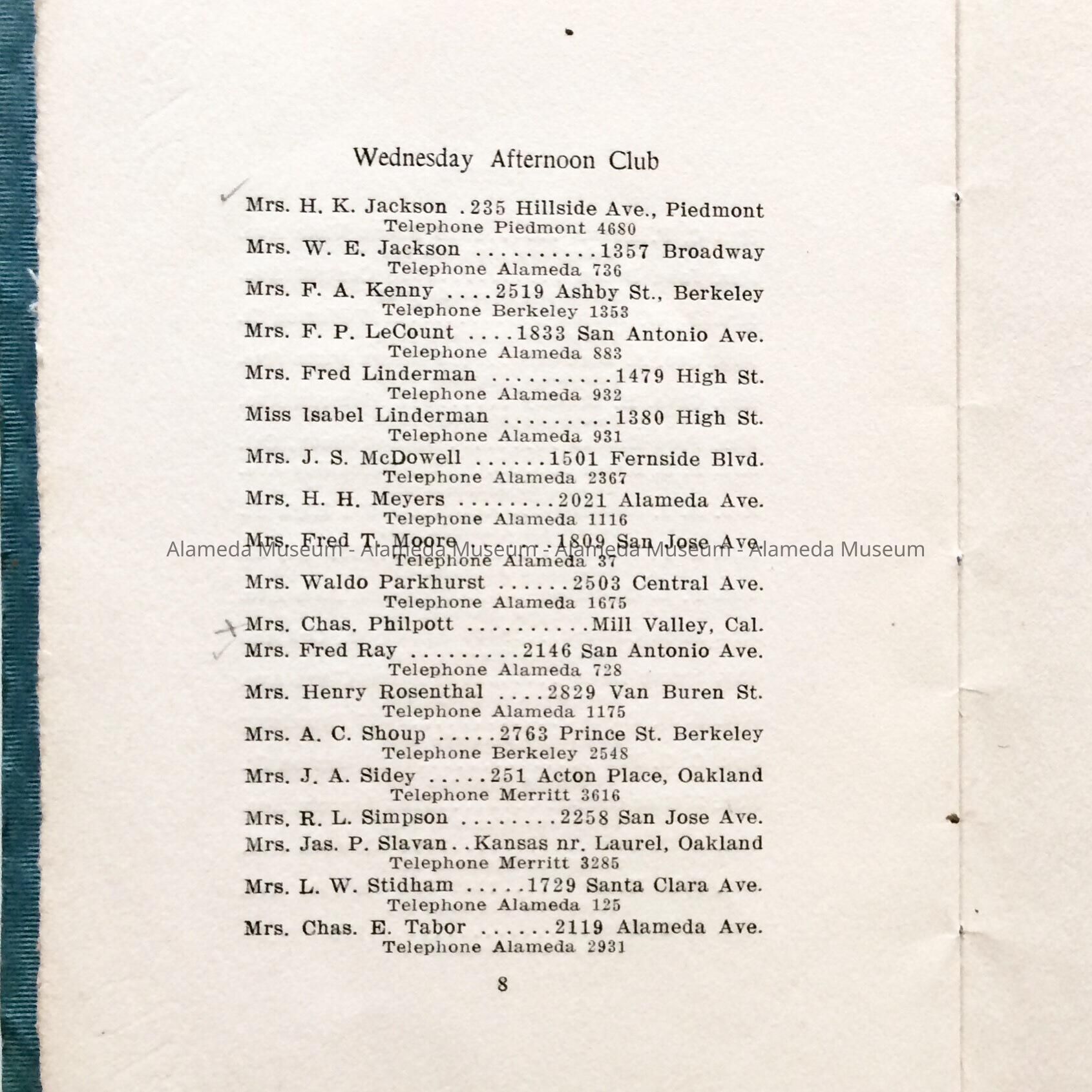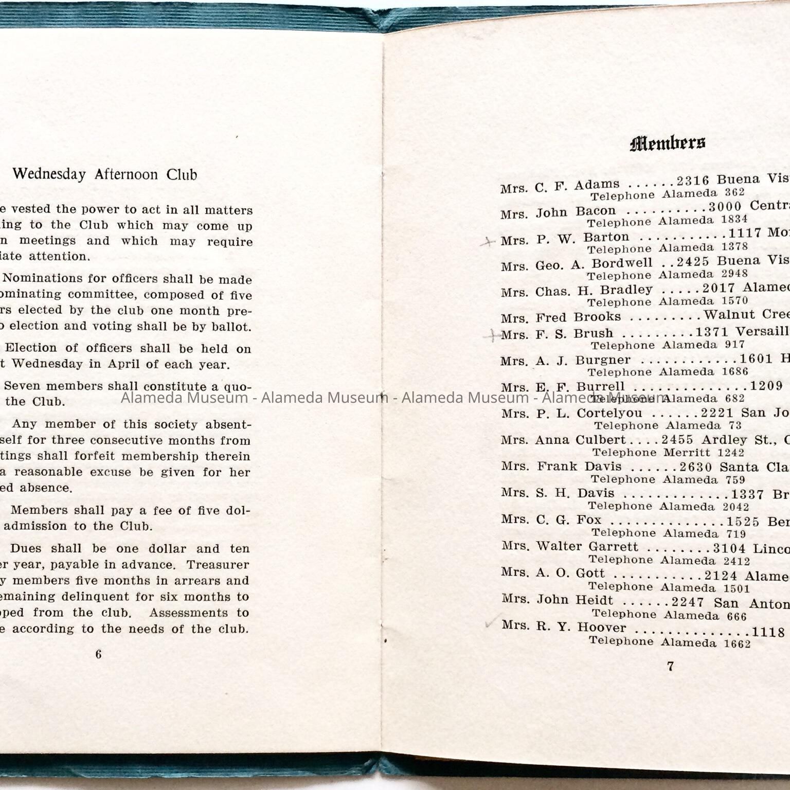 History of Object: Directory, 1912, of the social & literary club, the Wednesday Afternoon Club, organized, June, 1900, federated, May, 1903. The membership was comprised of leading ladies of the community. The president, Mrs. H. H. Meyers, was the wife a noted Alameda