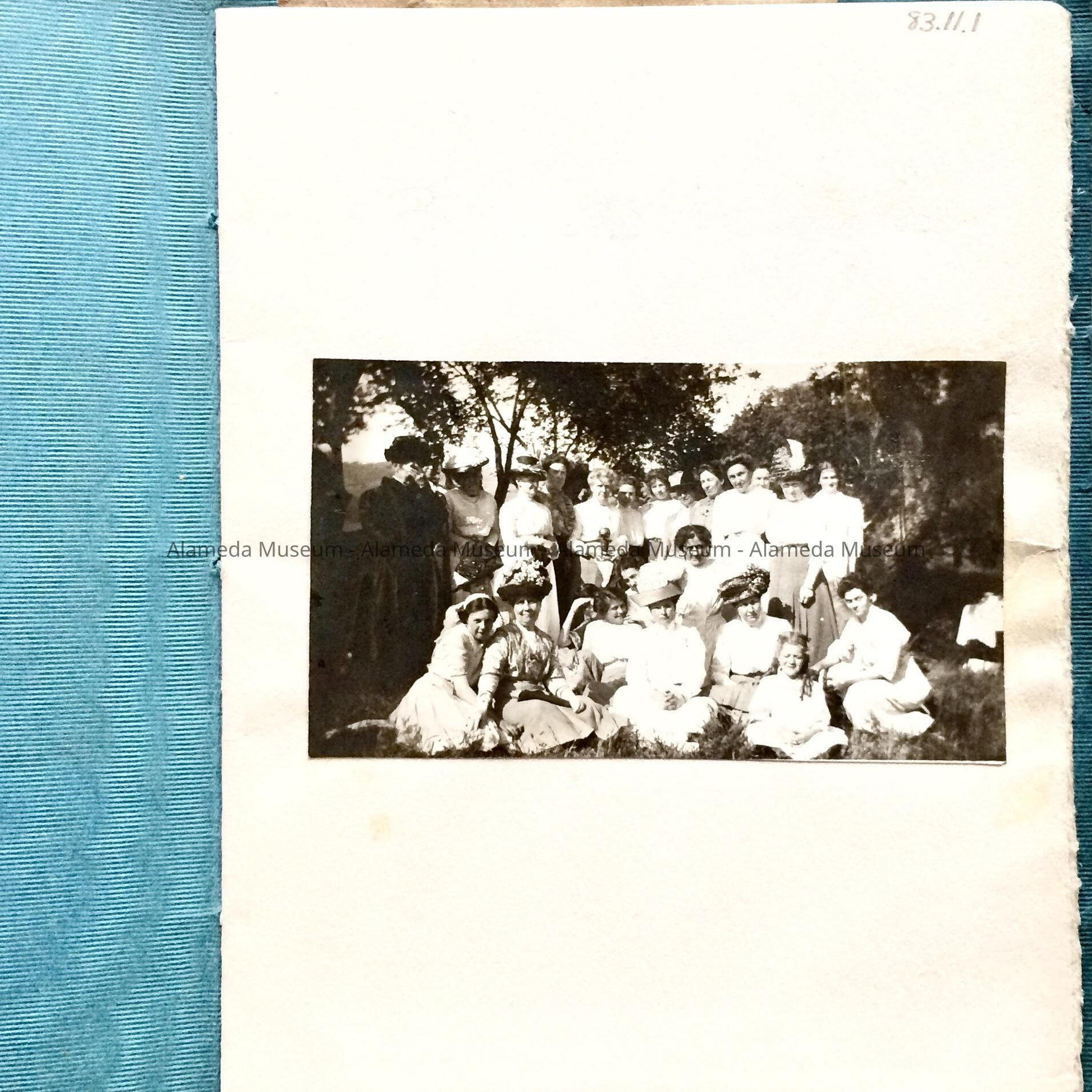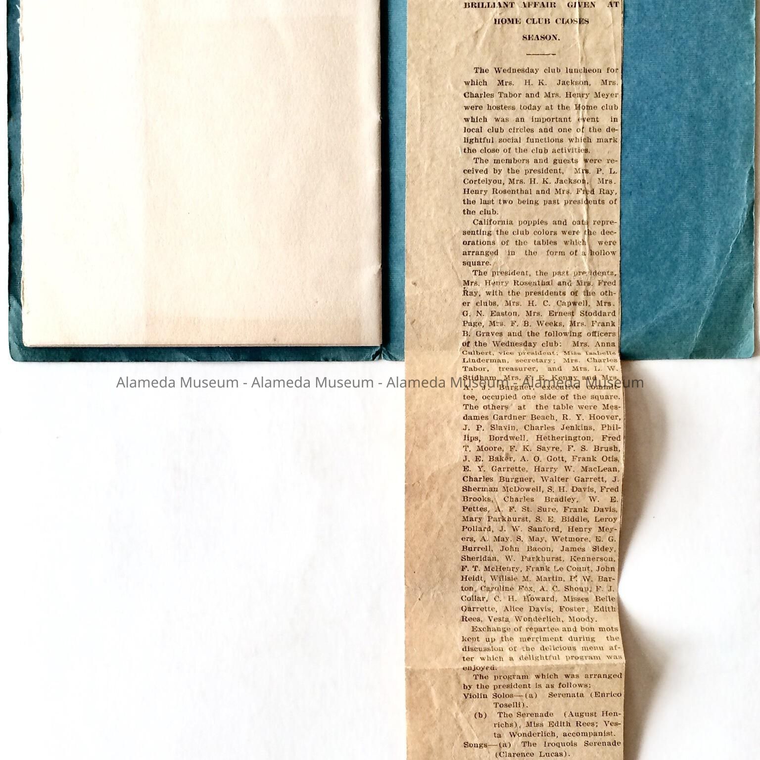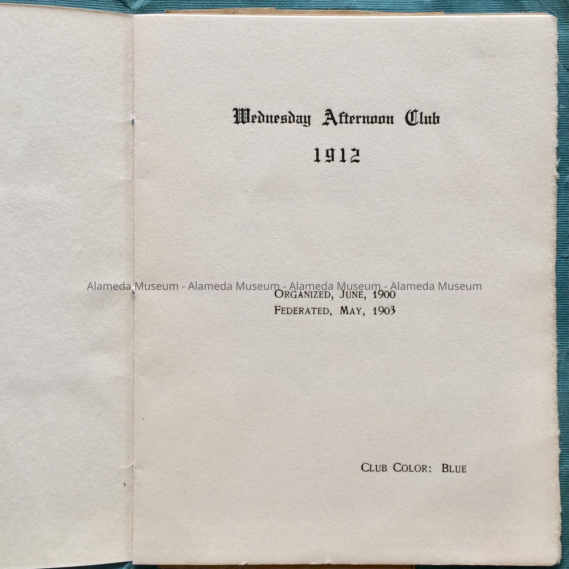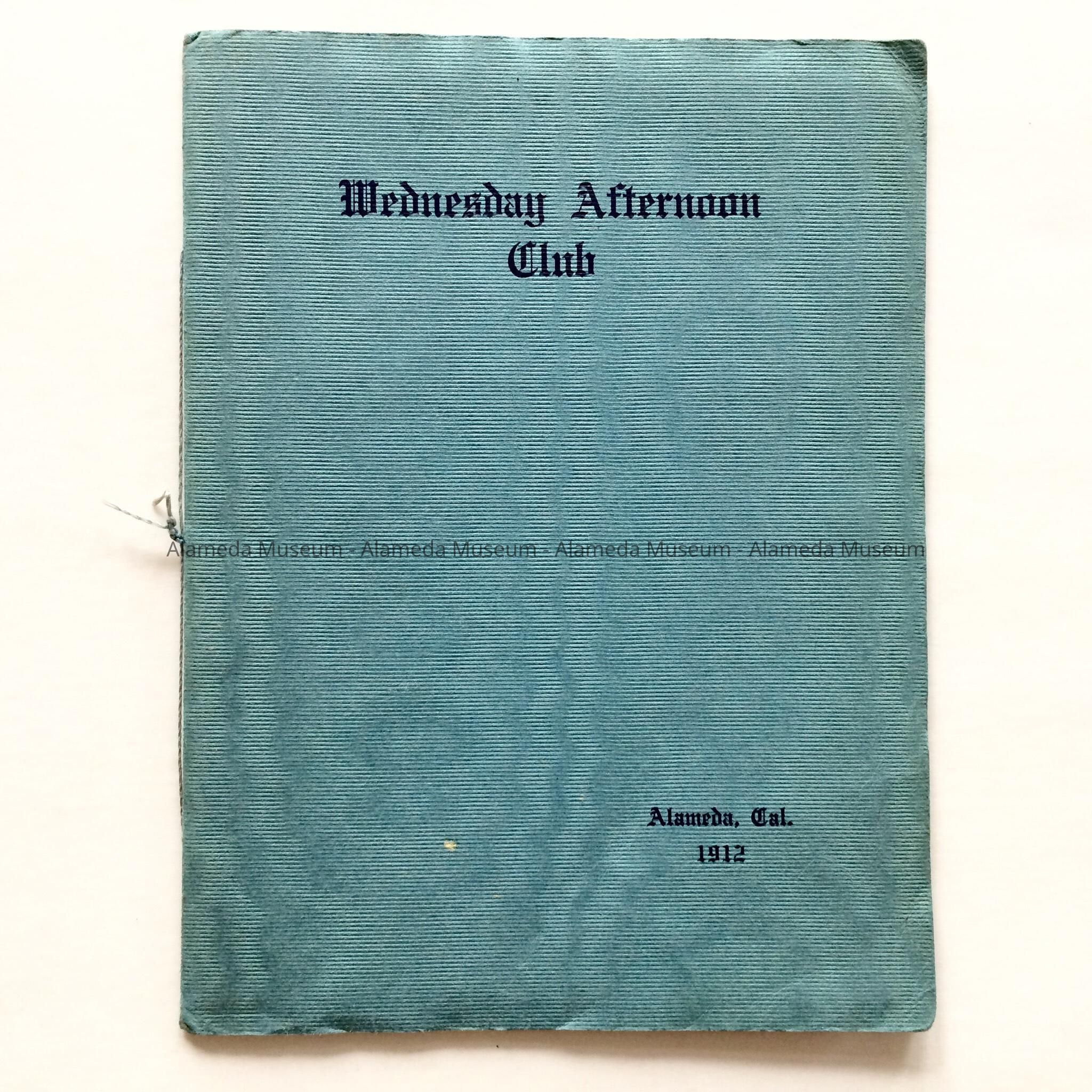 Description: Blue colored soft covered booklet (directory), with heading in dark blue type "Wednesday Afternoon Club", Alameda, Cal., 1912. The booklet contains 8 pages. A black & white photograph of the membership has been pasted to the front flyleaf of the booklet. The back inside cover has a newspaper clipping for May 11, 1911, telling of a luncheon held by the club.