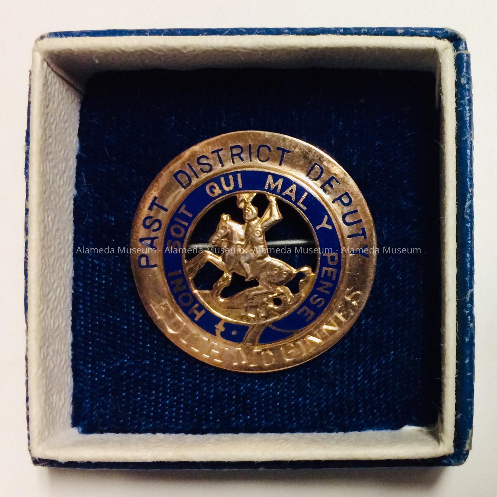 Circular 10K gold pin with incised lettering accentuated in blue "District Deputy." A band of blue enameling with the legion in gold print states "HONI SOIT QUI MAL Y PENSE" surrounds a cut-out of St. George slaying the dragon (emblem of organization) as the central design of the pin.