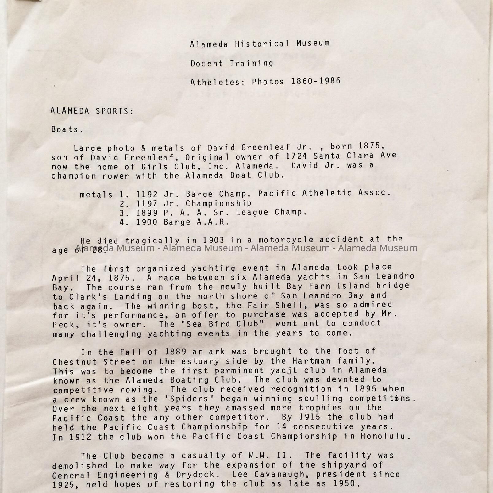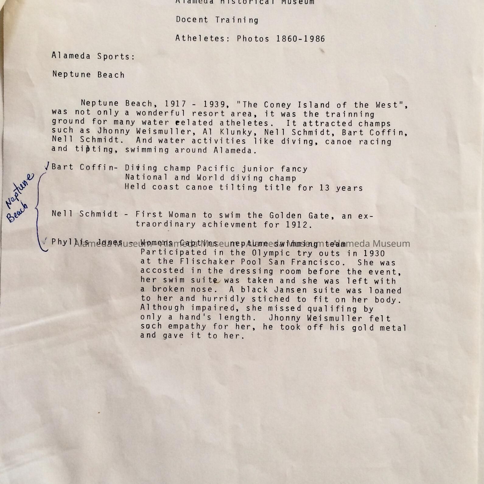 Two pages of typed information, stapled together, headed ‘Alameda Historical Museum, Docent Training, Atheletes: Photos 1860-1986’