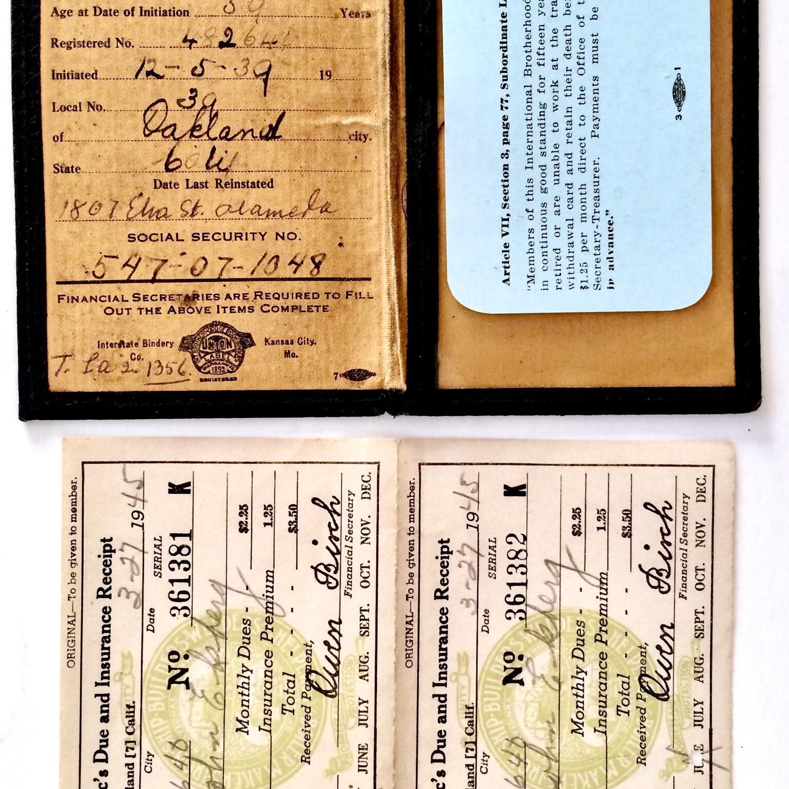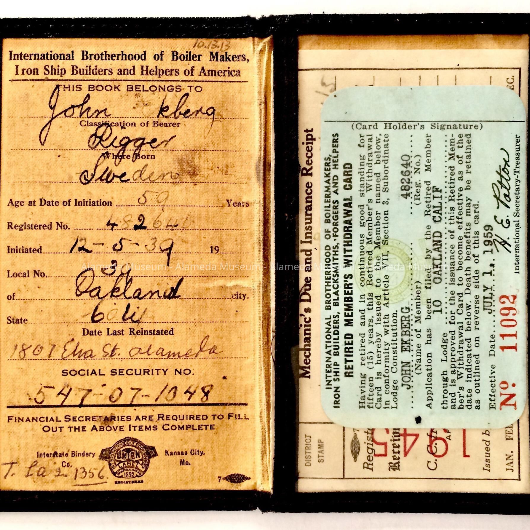 UNION-ISSUED POCKET FOLDER, STATING THAT JOHN EKBERG OF 1807 ELM STREET, ALAMEDA IS A MEMBER OF THE INTERNATIONAL BROTHERHOOD OF BOILERMAKERS AND IRON SHIPBUILDERS UNION.