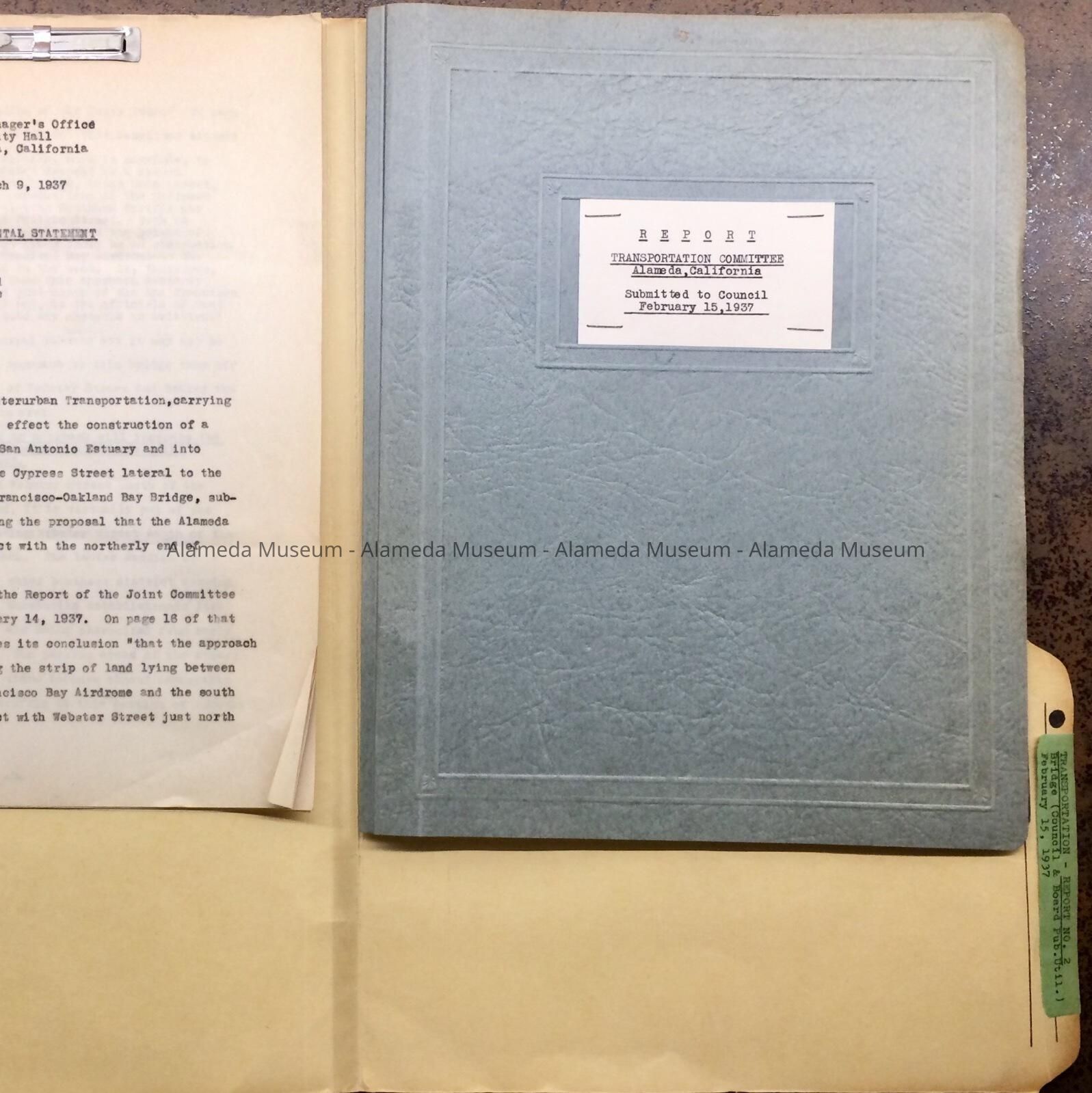 B (in leather-look, heavy paper stock folder), is titled: Report titled Transportation Committee Alameda California; Submitted to Council February 15, 1937.