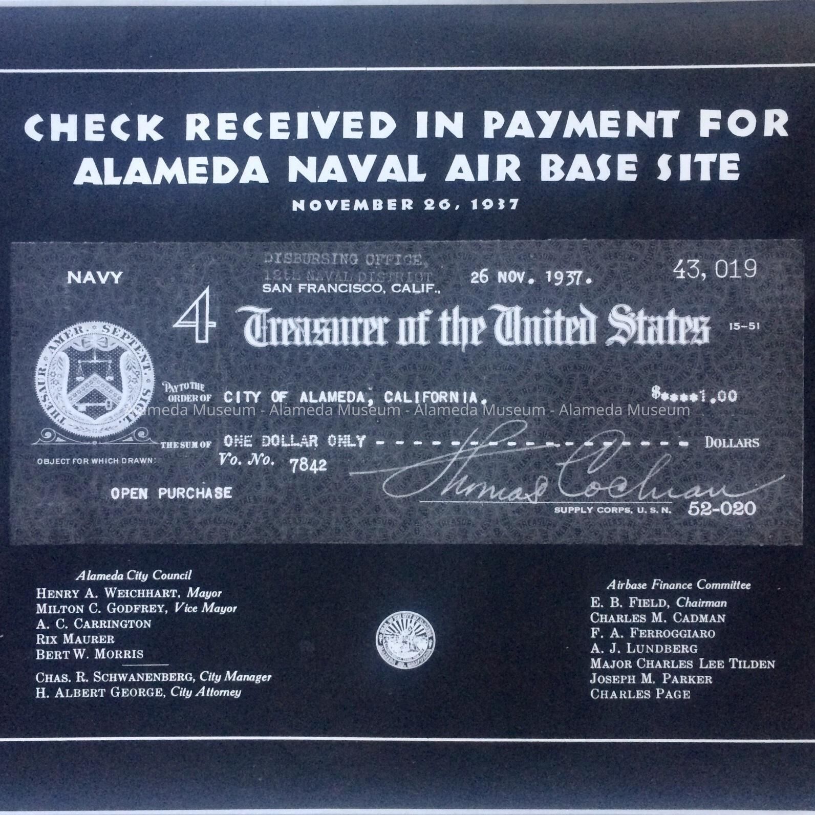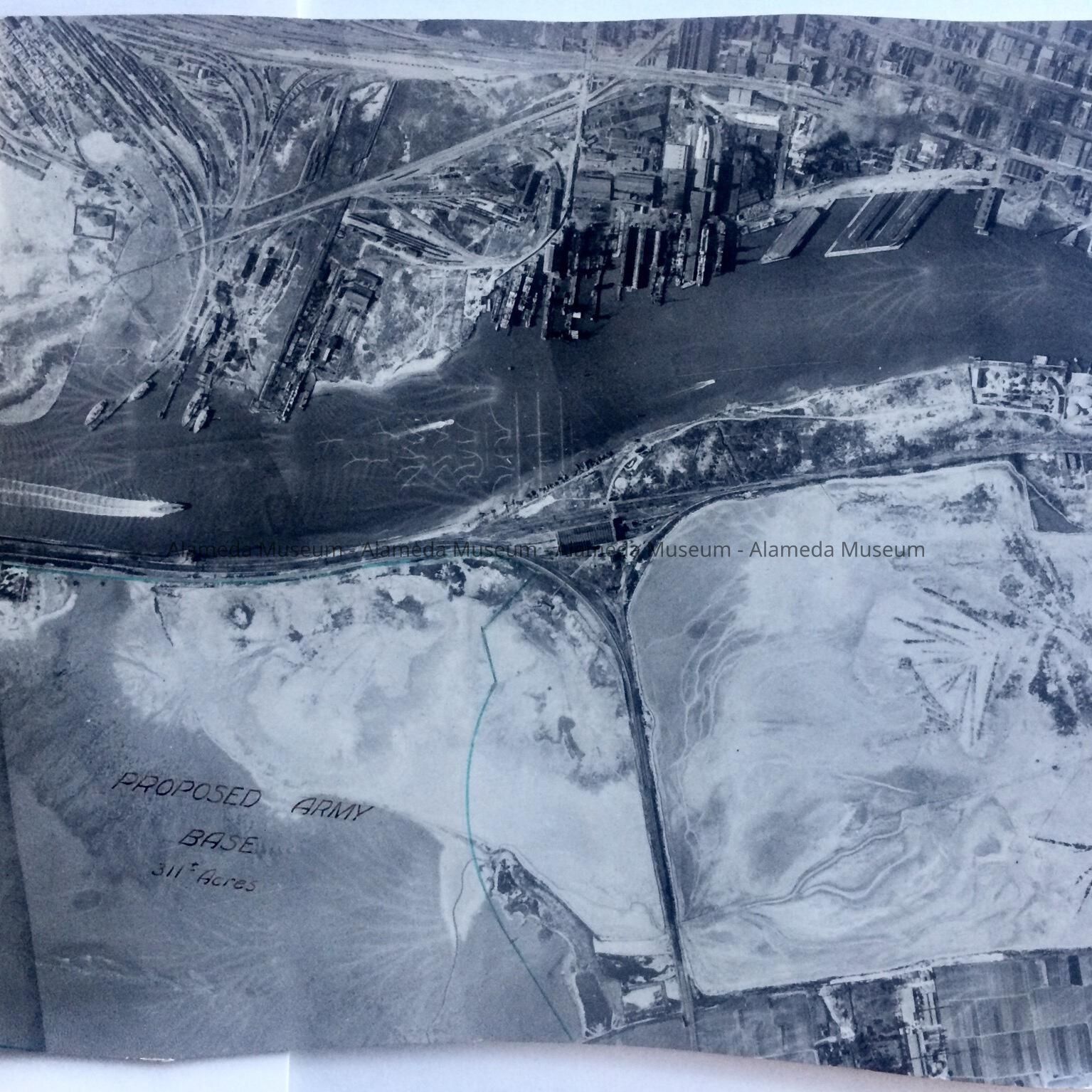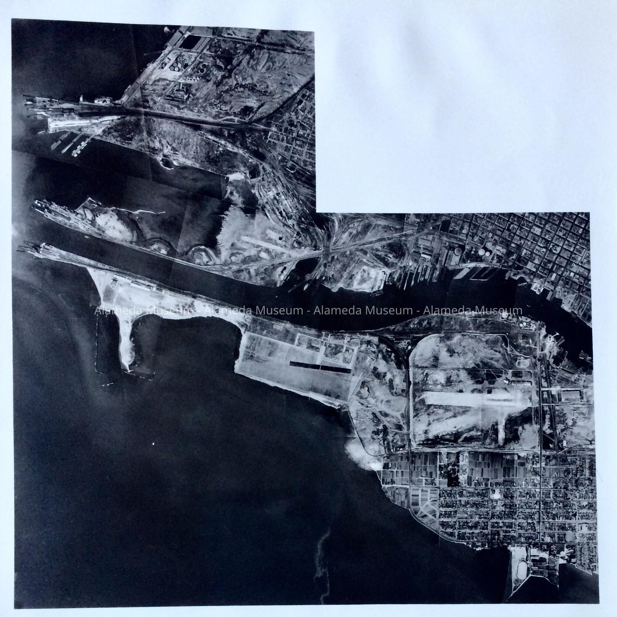 B: correspondence of City Manager Fritz (1936) and Schwanenberg (1937), and Mayors Hans W. Roebke (1936) and Henry A. Weichhart (1937), regarding the proposed Naval Air Station; includes a blueprint map showing sections leased 1927, 1928, 1929; an Aerial photo showing the Alameda Airport with breakwater line of destroyers, and a high altitude aerial photo showing the S.F. Bay Airdrome, Benton Field, and Alameda Airport (operated by Curtiss-Wright until 1933), and copies of published Acts of Congress and the House of Representatives. Also includes the apparent result of the 1930 election (Government Island - Coast Guard grant and Benton Field Army grant).