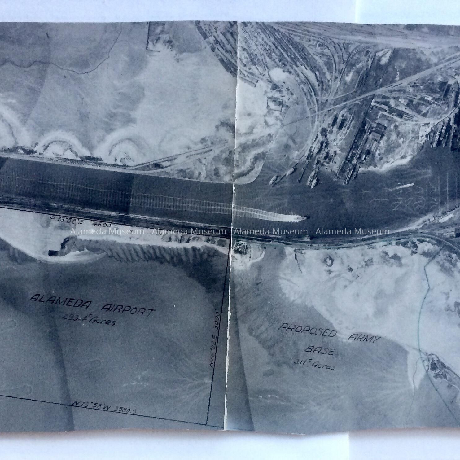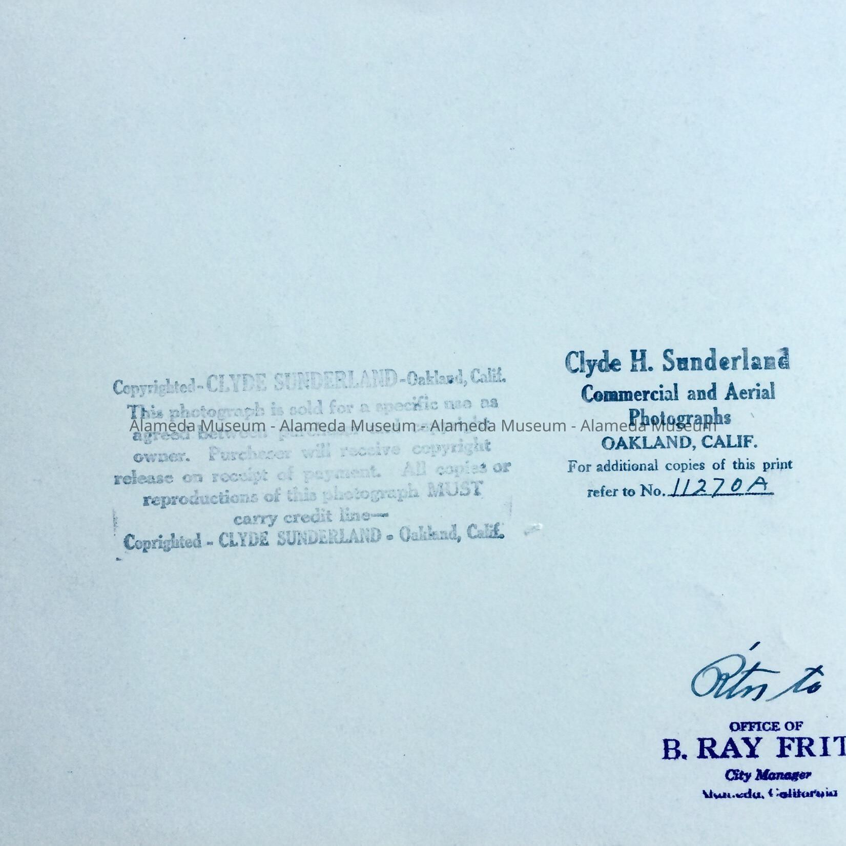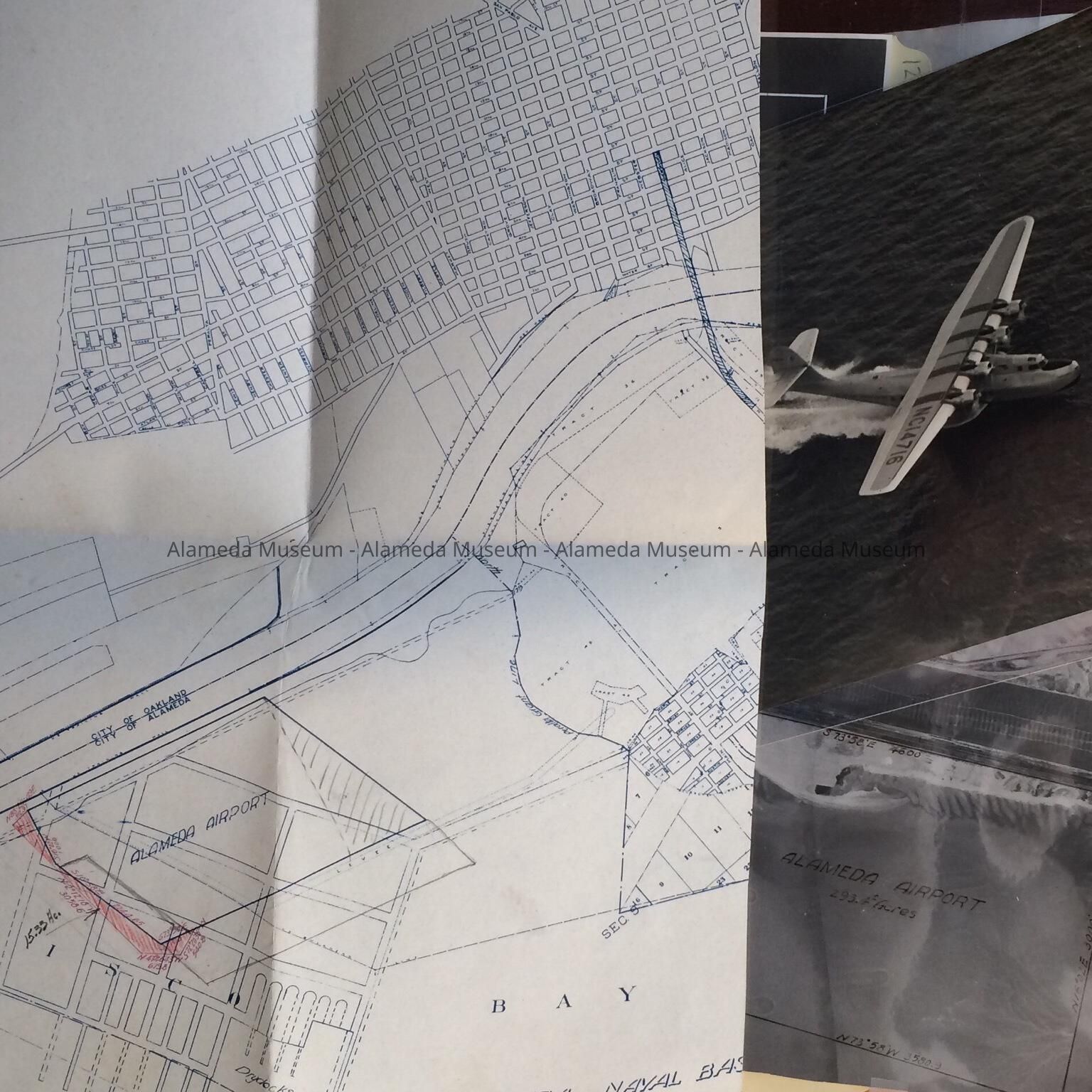 C: Includes 3 photos, one torn in half, with ‘Alameda Airport’ and ‘Proposed Army Base’ marked in by hand, and irregularly cut off lower and upper edge. Photo shows lines which appear to be from cracks in the negative. A second photo is of a check, the third of a seaplane, stamped on verso by Clyde H. Sunderland, and by office of B. Ray Fritz.