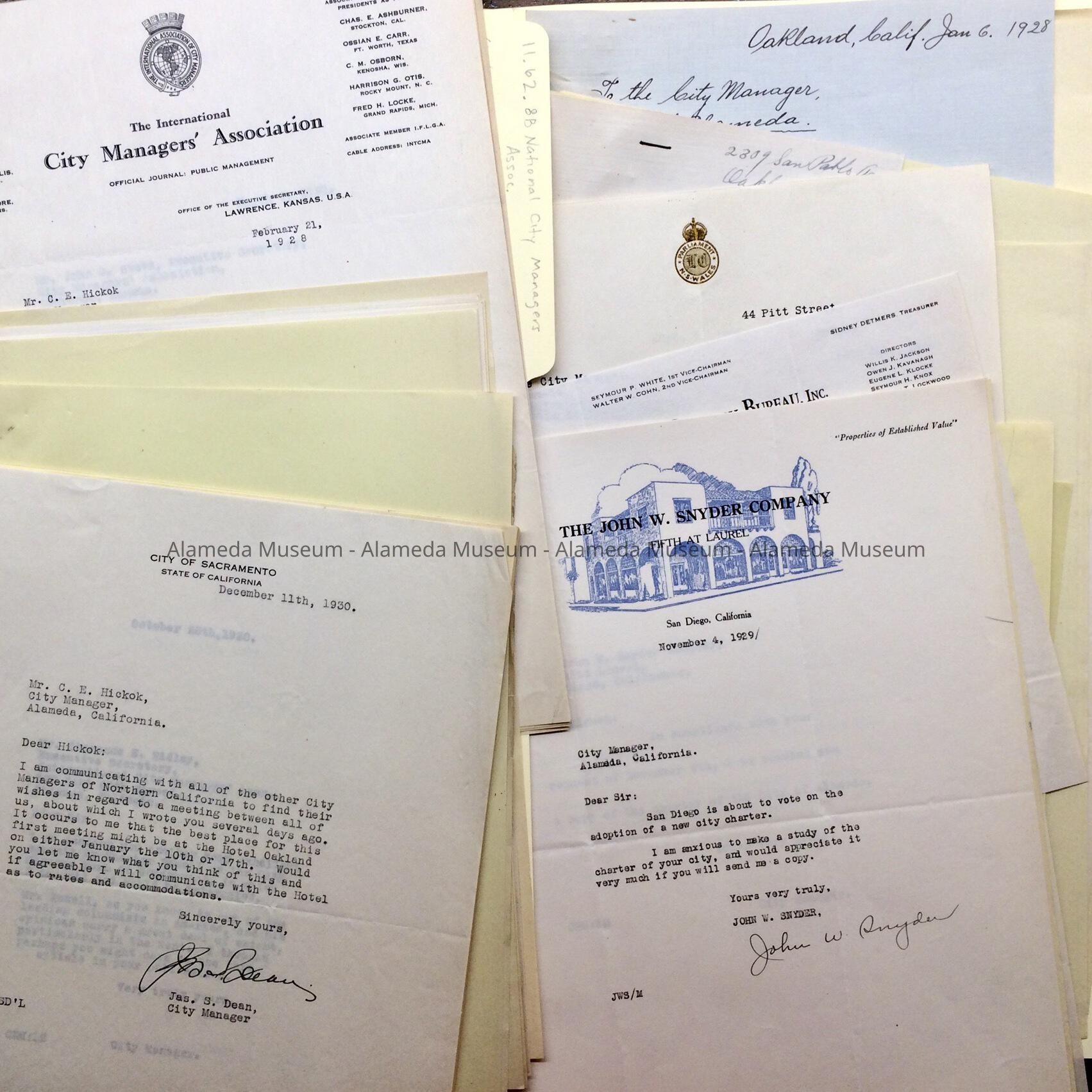 A. Folder with letters from various cities and organizations, including from Sydney, Australia, and Victoria, B.C., Canada, asking for information (or copies of the Charter) about the City Manager form of government, which was adopted for Alameda from April 16, June 1917.
