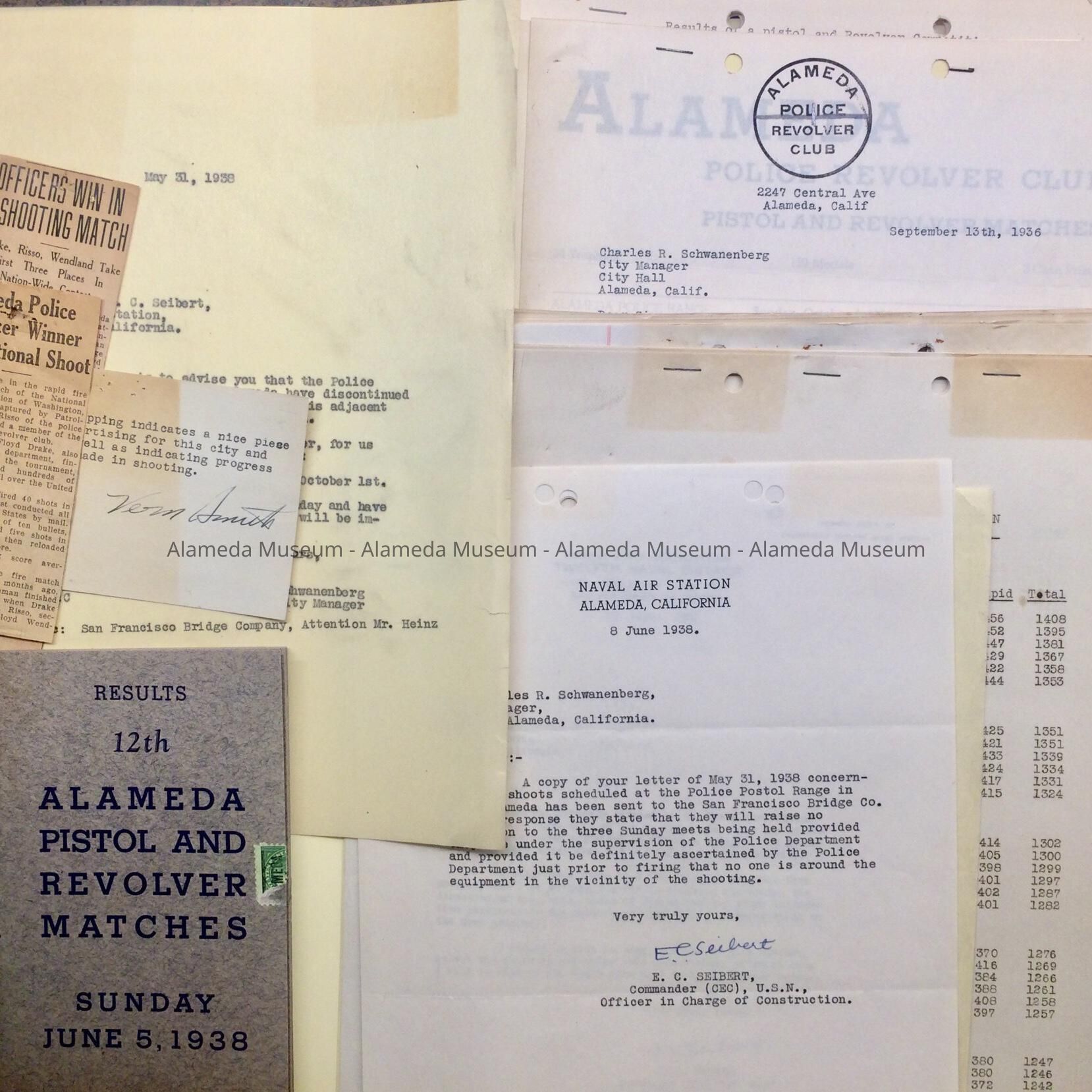 Documents found in the attic of City Hall in a folder (discarded in 2011) with tab label: ‘Pistol & Revolver Matches - Shooting Range’. Documents in this folder contain correspondence relating to the shooting range, including reports of activities of the Alameda Police Revolver Club, including results of competitions.