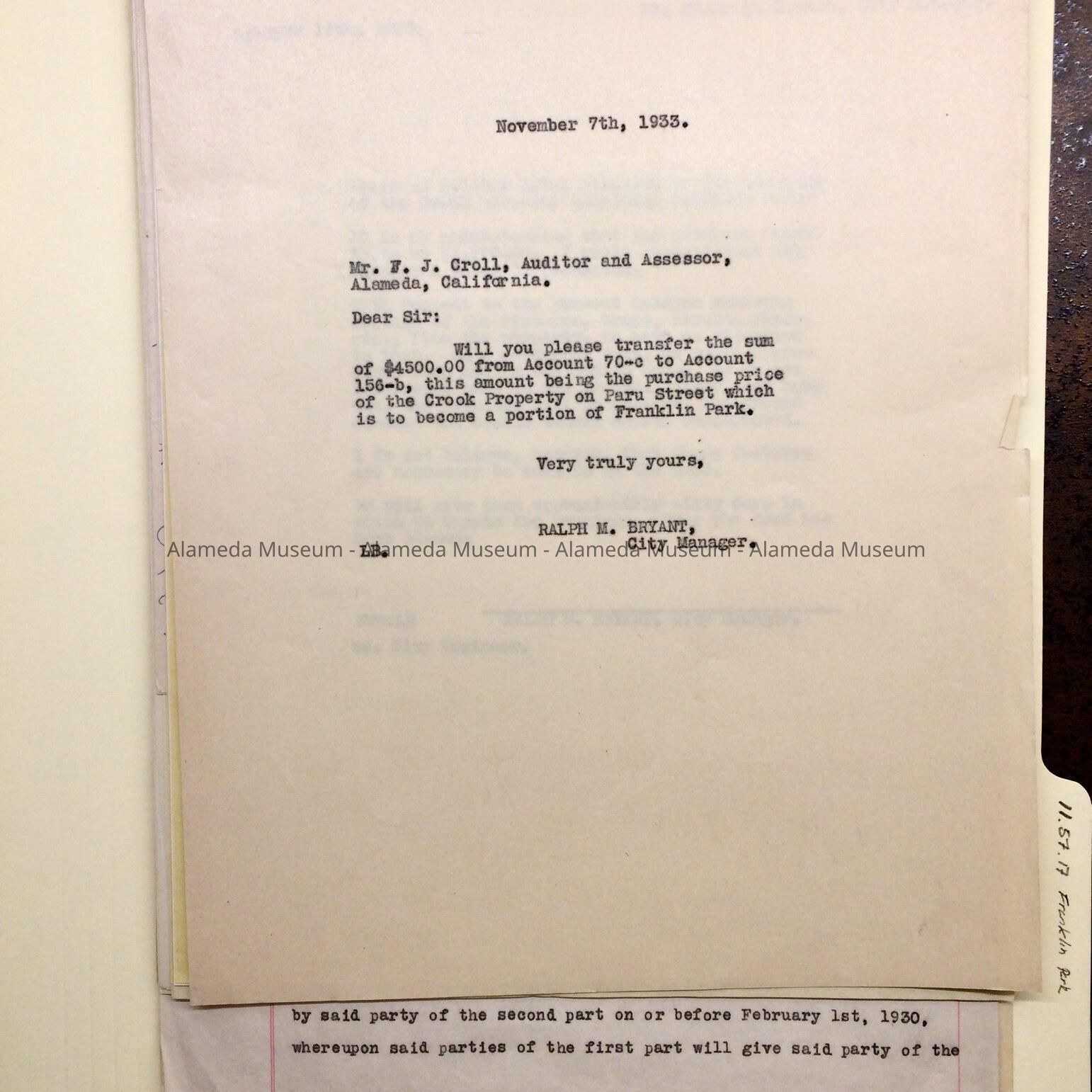 Documents found in City Hall attic during remodel in the 1990s, placed in a new folder after donation to the museum in 2011. Tab of original folder (now discarded) stated: "Acquisition of Property - Franklin Park (Crook Property). Documents regarding purchase of land from Mr. Ernest H. Crook including handwritten letter and cost estimate of improving park. City Managers C.E. Hickok (1931), Ralph M. Bryant (1933). W.E. Varcoe, City Clerk, H. Albert George, City Attorney (1933).