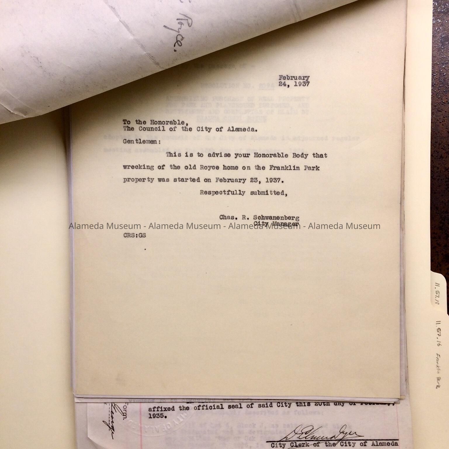 Documents found in City Hall attic during remodel in the 1990s, placed in a new folder after donation to the museum in 2011. Tab of original folder (now discarded) stated: Acquisition & Property - Franklin Park (Royce - Pye Property). Included are documents authorizing purchase of land from Bianca Conti Royce, signature included, and construction of Franklin Park. Includes blueprint of park design.