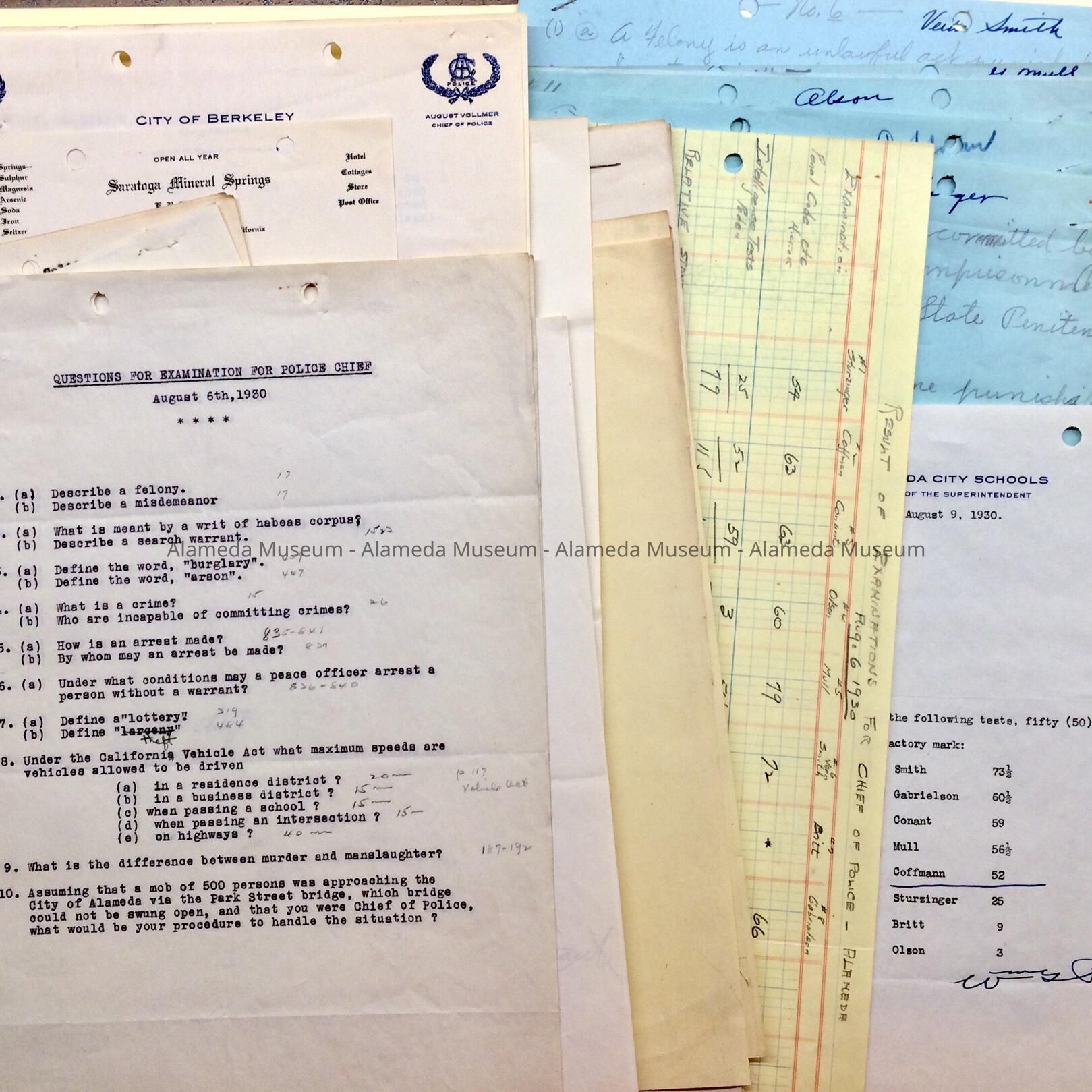 Documents originally were in a folder, discarded in 2011, with a green label on the tab stating: “Police Department: Chief of Police - August 1930”. Documents pertain to the applications and examinations for Police Chief after resignation of Chief William H. Wahmuth; handwritten and typed results suggest Vern Smith came out ahead; his initial application letter is not in this folder. City Manager, C. E. Hickok.