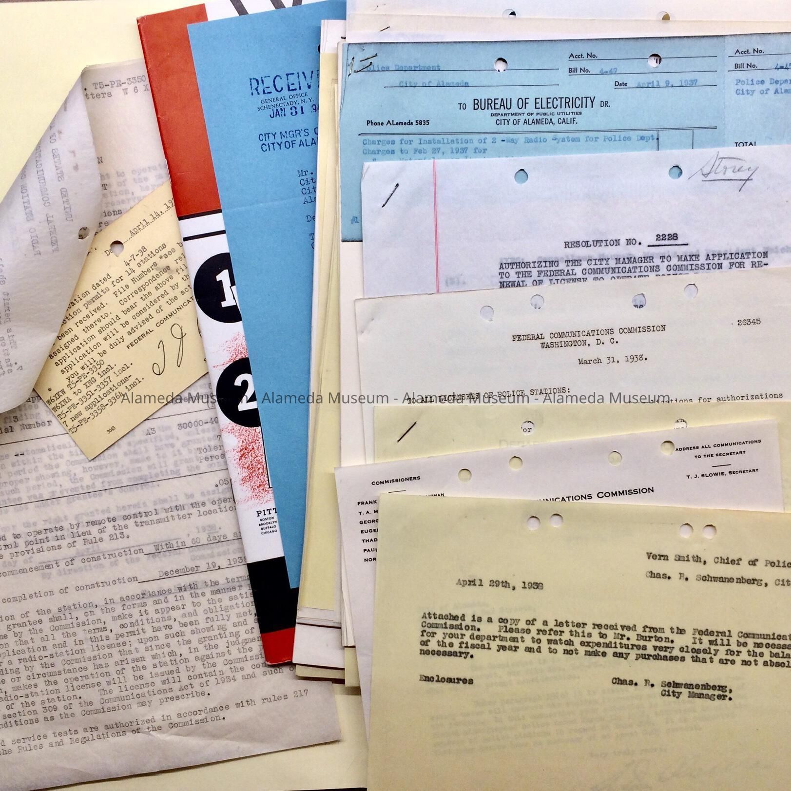 Documents originally were in a folder with a green label on the tab stating: “Police Department - Radio System”. Documents include an Experimental Radio Station Construction Permit, 1938, corner Santa Clara & Oak, conform the 1934 Communications Act; and approval for 14 stations, including cars; and preliminary correspondence, bills, decisions, and brochures. City Manager Chas. R. Schwanenberg.