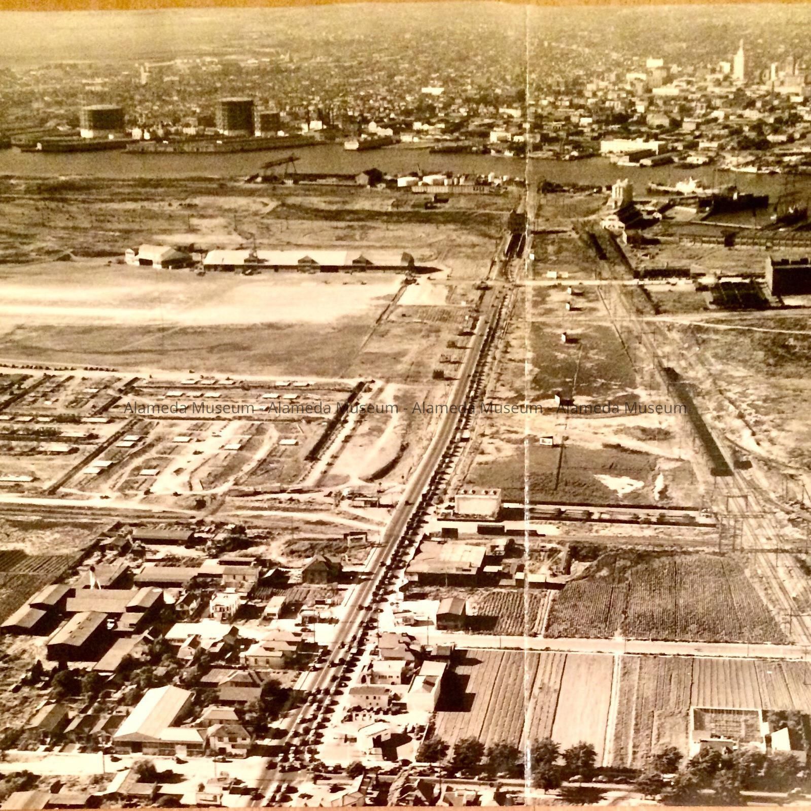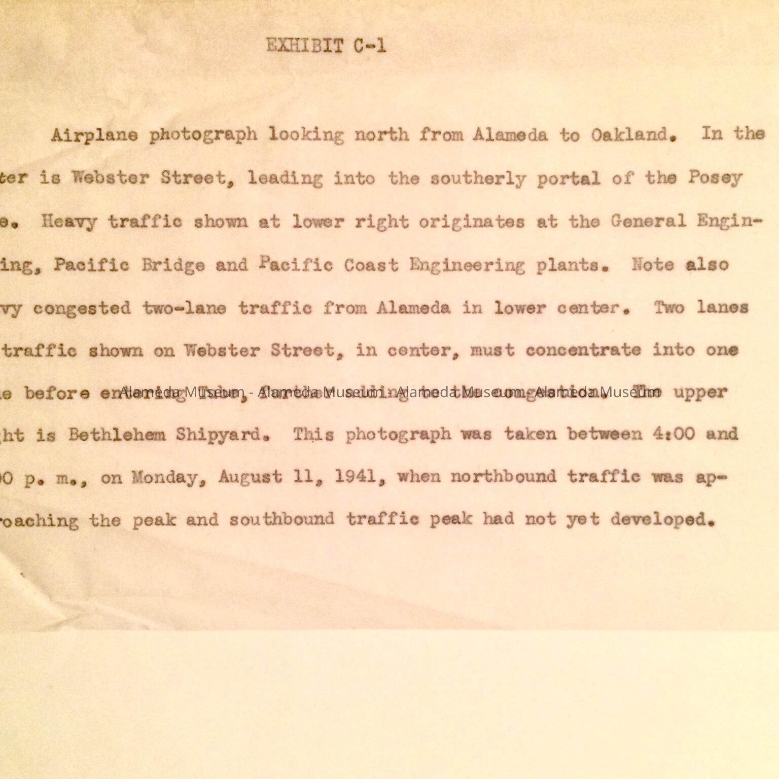 Includes photographs and a newspaper clipping detailing congestion and accidents, and an enlarged 1941 aerial view of Webster St., taken between 4pm and 5pm, showing bumper-to-bumper traffic, also the Bethlehem Shipyard, the General Engineering, Pacific Bridge, and Pacific Coast Engineering plants, various railroad tracks, the remnants of the San Francisco Bay Airdrome, and crops.