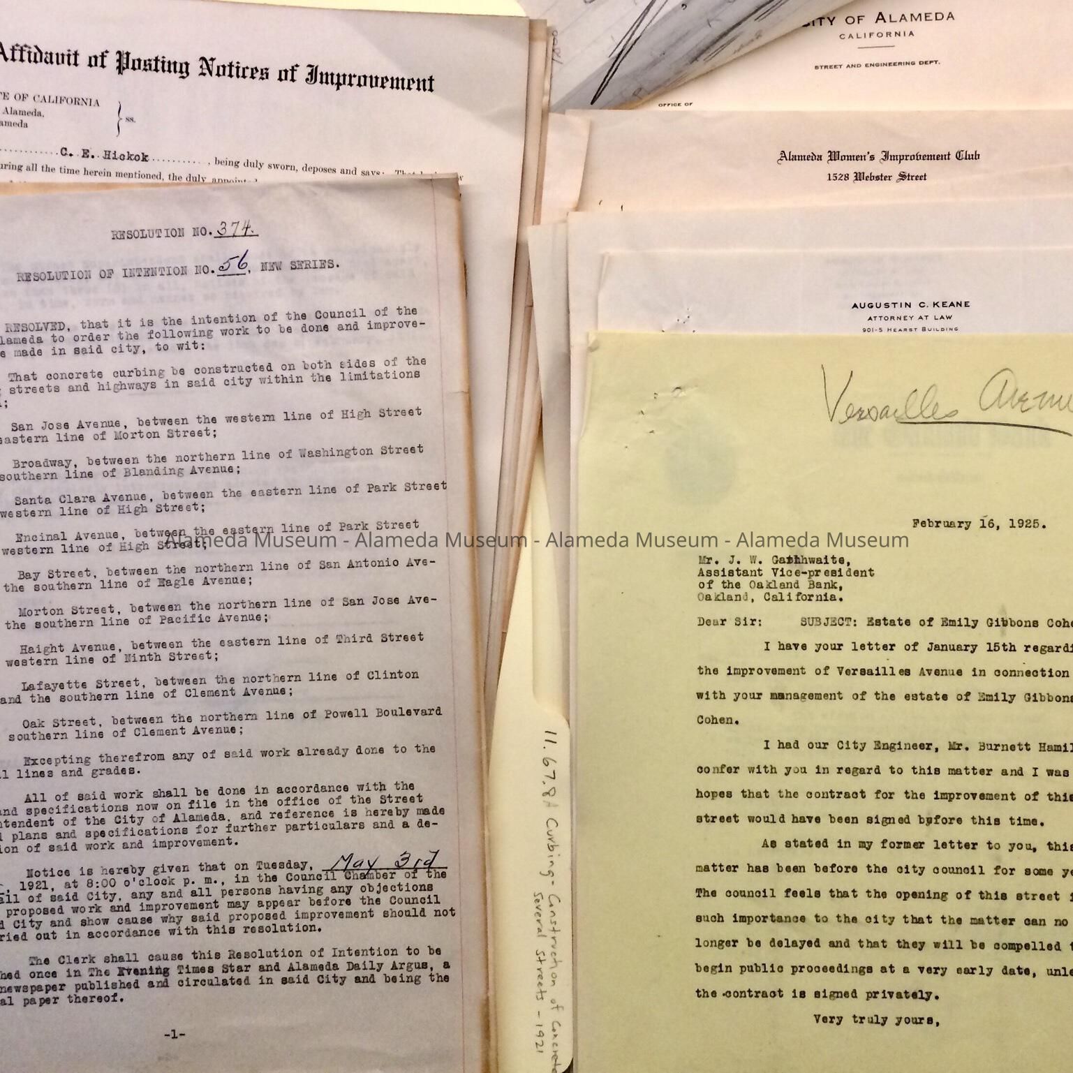 B. 1921-1925, documents reflecting the decision to improve Versailles Ave., which ran into a snag because of difficulties in handling the Estate of Emily Gibbons Cohen, resulting ultimately in threats for public domain action.