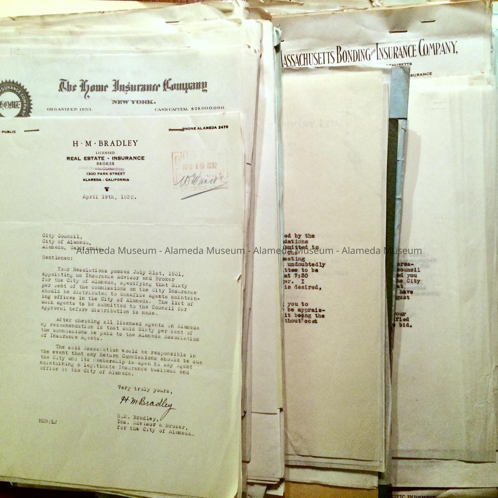 History of Object: Folder with documents found in the attic of City Hall in the 1990s. Documents pertain to the need to carry liability insurance as a result of an act of ‘Legislature’; documents include a list of all cars, and bids for taking on insurance for the City, and correspondence relating to those bids. H. M. Bradley was selected for the appointment as Insurance Advisor and Broker for the City.