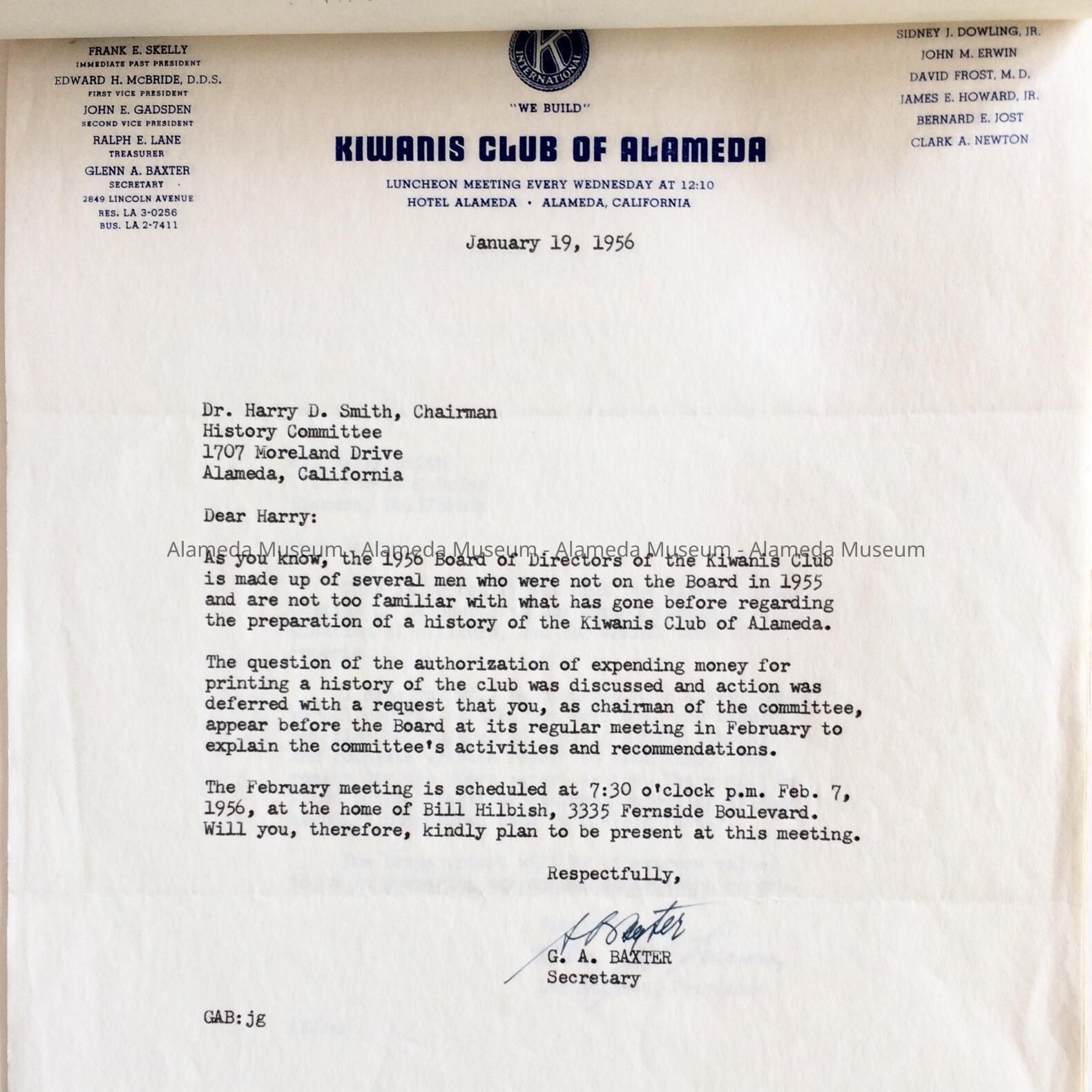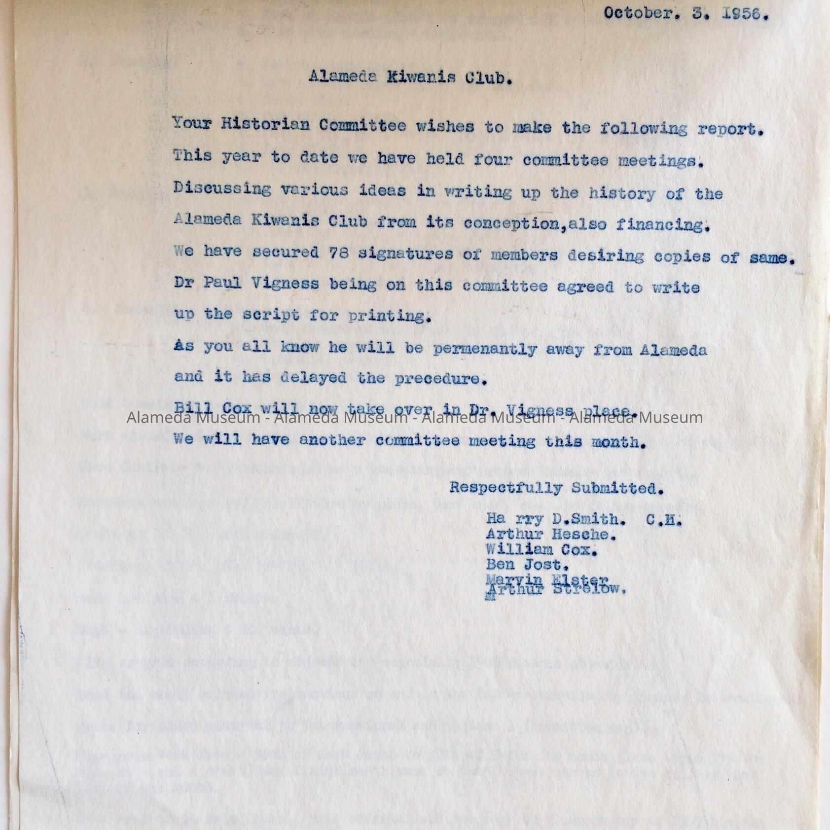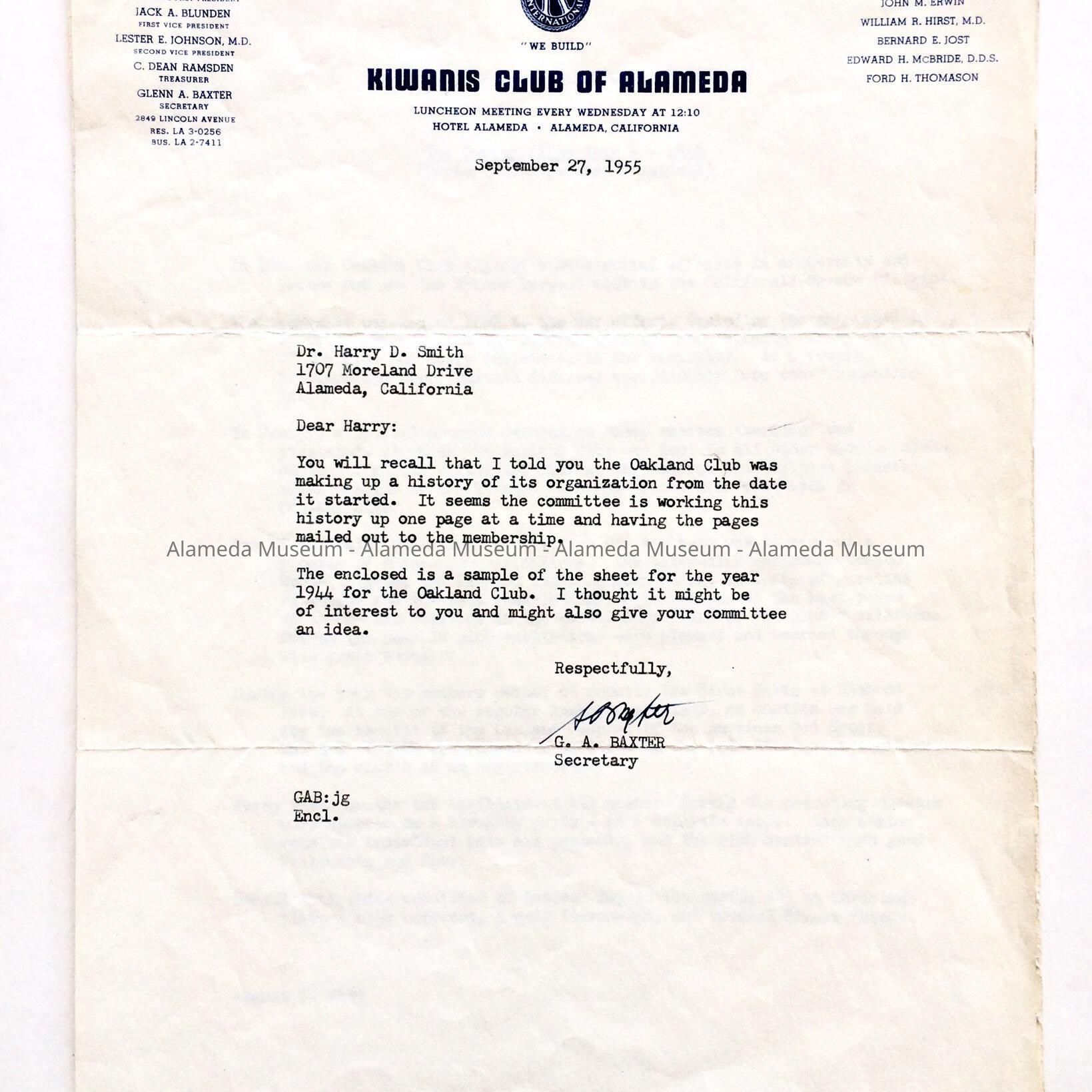 History: Correspondence and related information addressed to Dr. Harry D. Smith concerning compiling of information etc. pursuant to publishing the booklet "A Brief History of the Alameda Kiwanis Club 1958" (00.63.1).