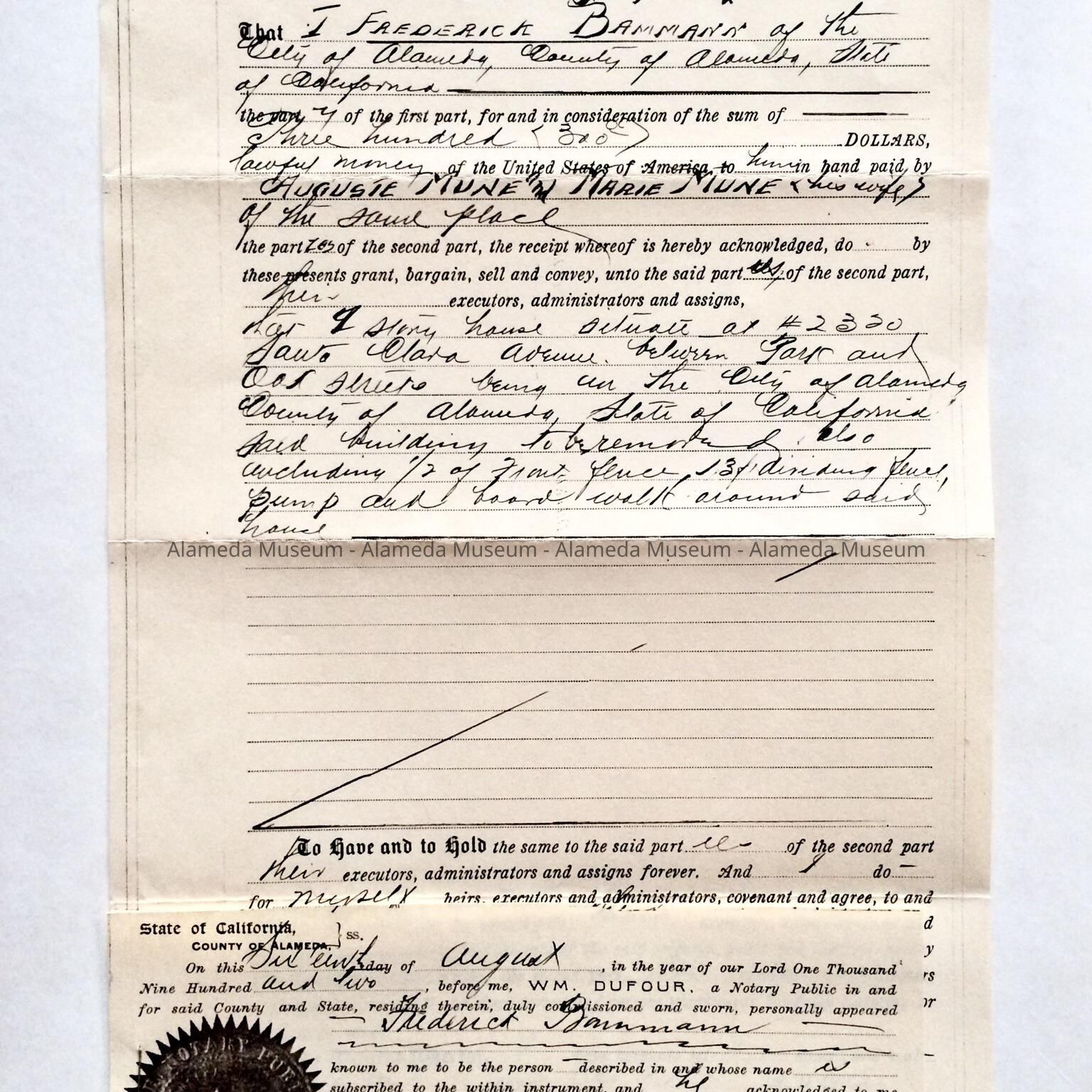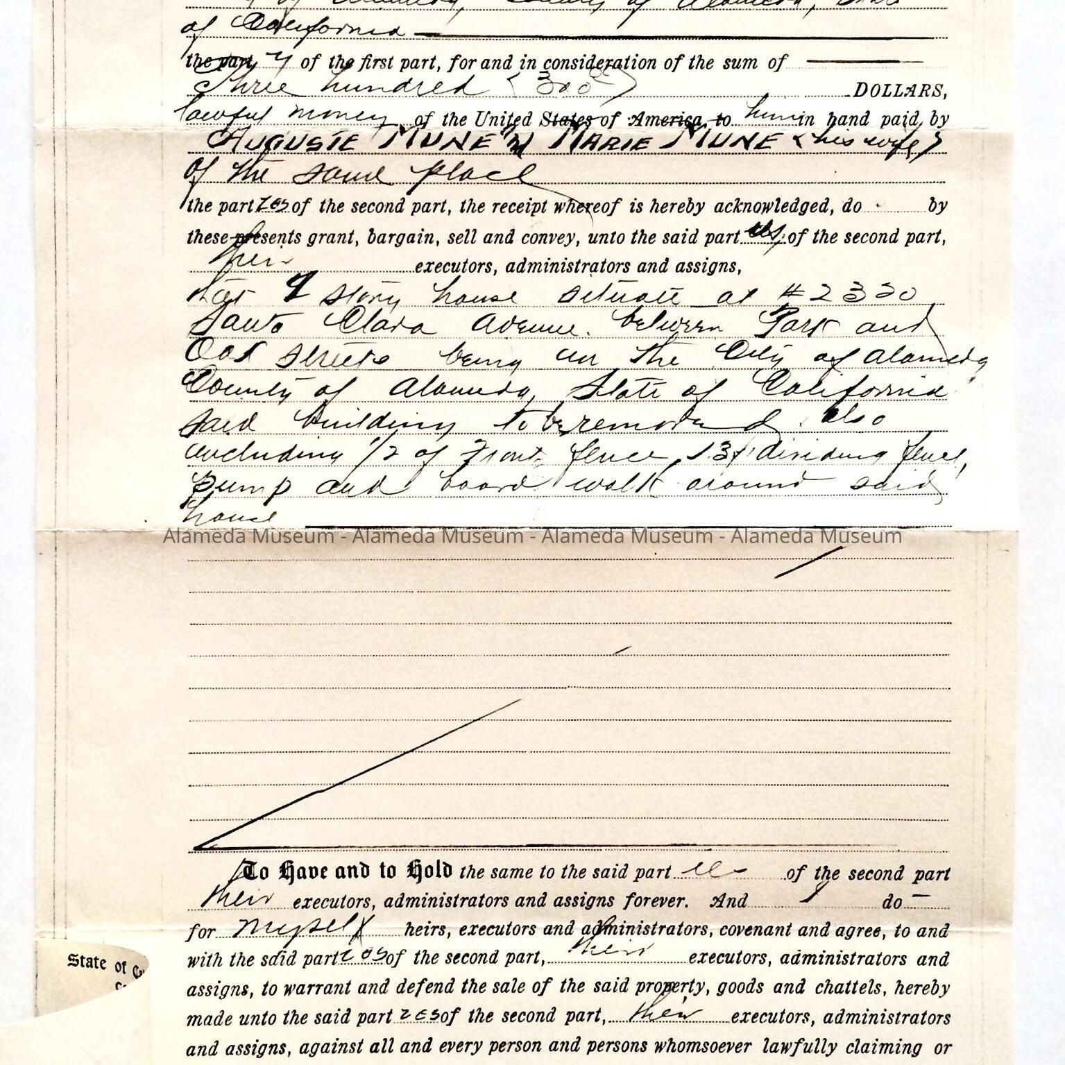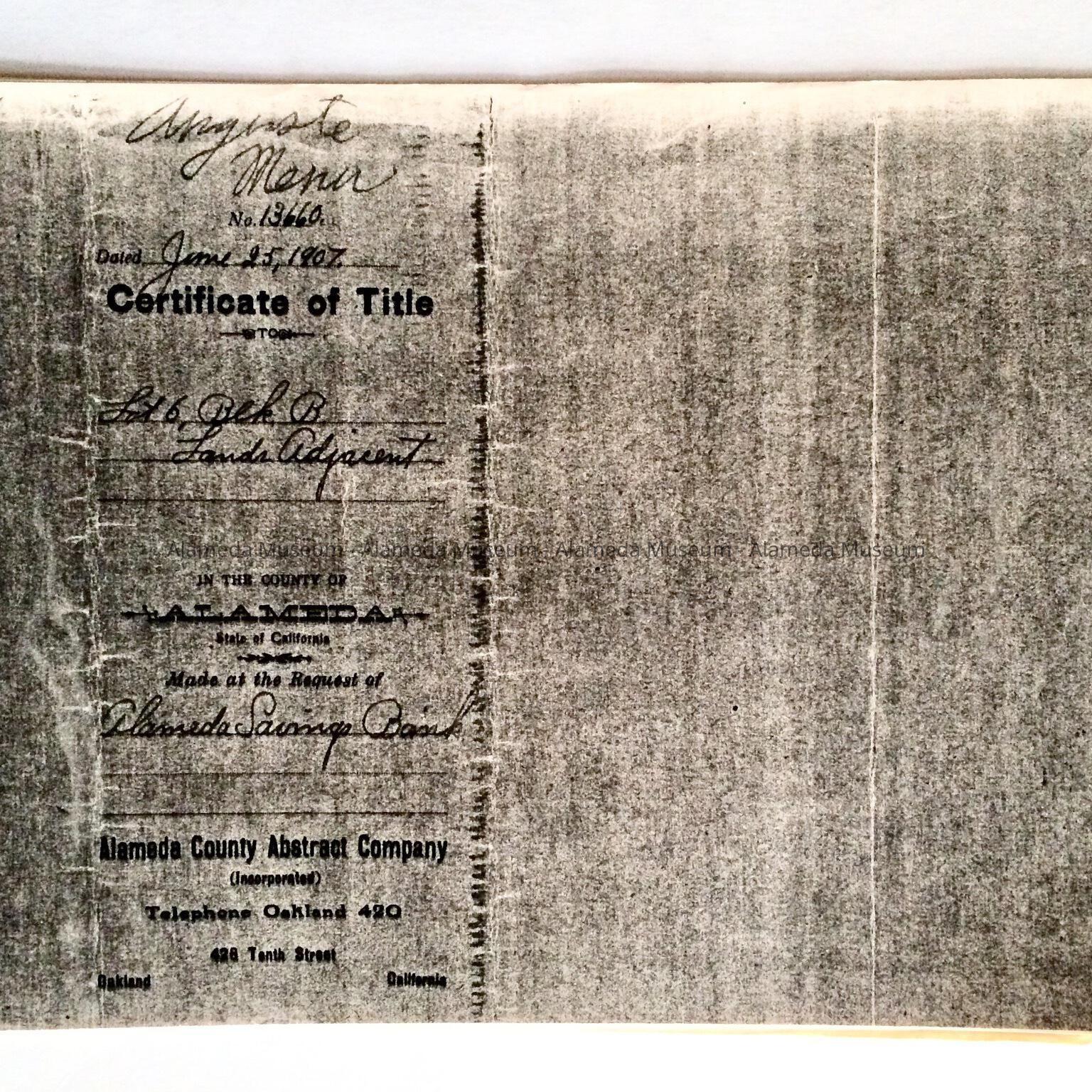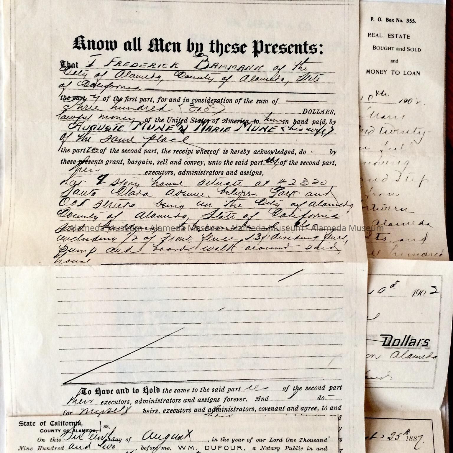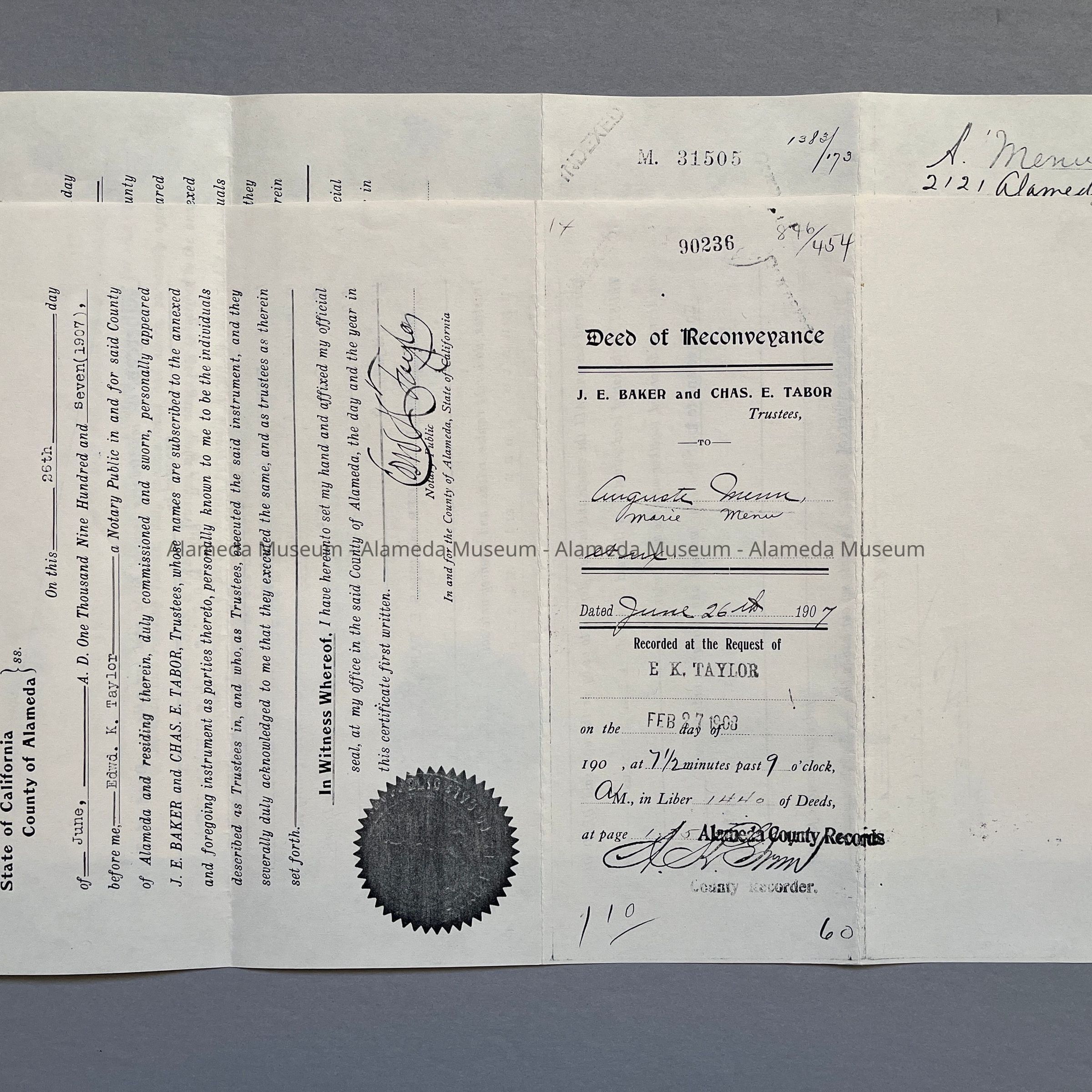 Deeds, Bill of Sale, Certificate of Title, etc. concerning 2121 Alameda Avenue. This early residence from the twenty-three hundred block of Santa Clara Avenue was built in 1902 for the Menu family. Included are deeds to the property on Alameda Avenue, dated 1907, including the Bill of Sale of the house which was 2320 Santa Clara Avenue and subsequently moved in 1902 to 2121 Alameda Avenue.
