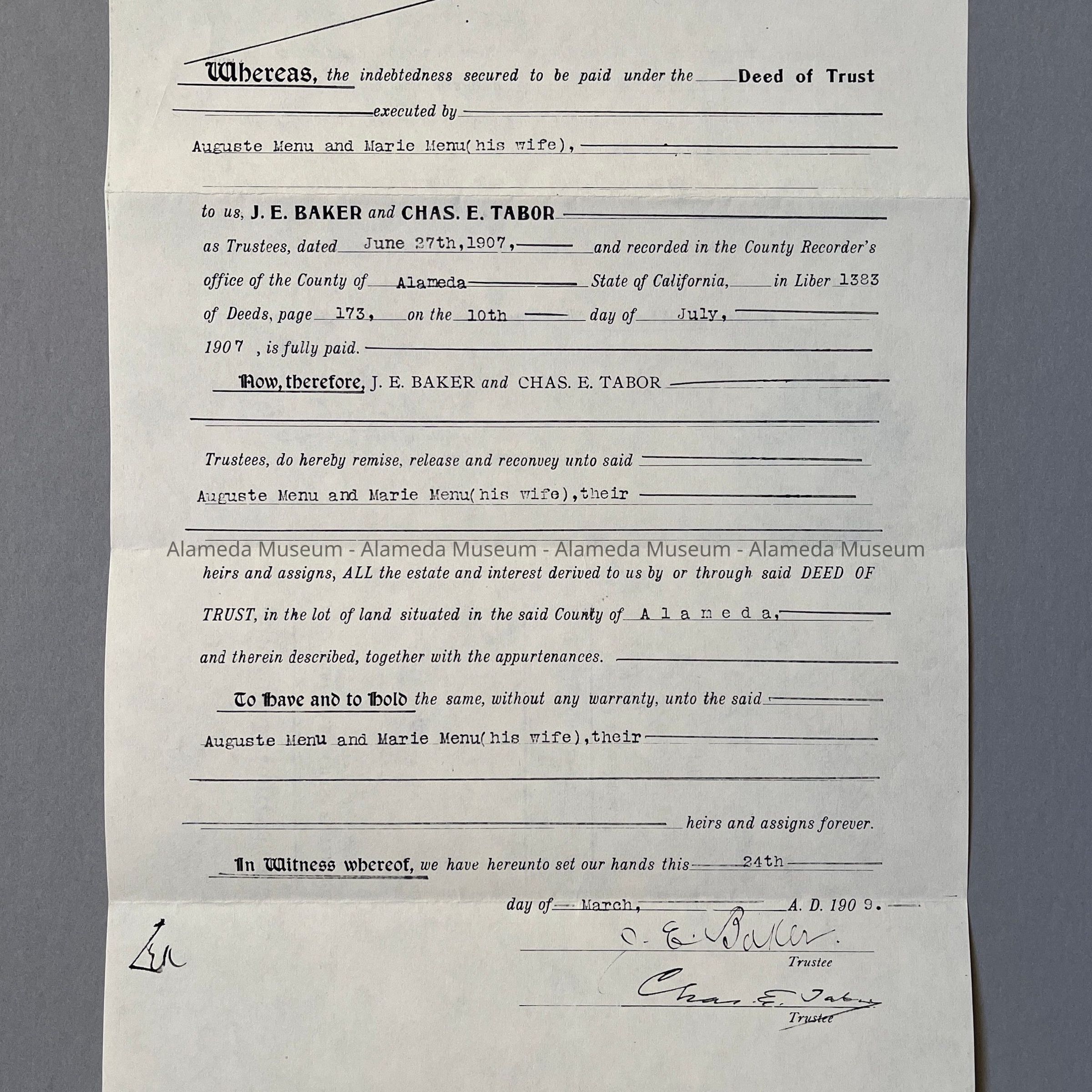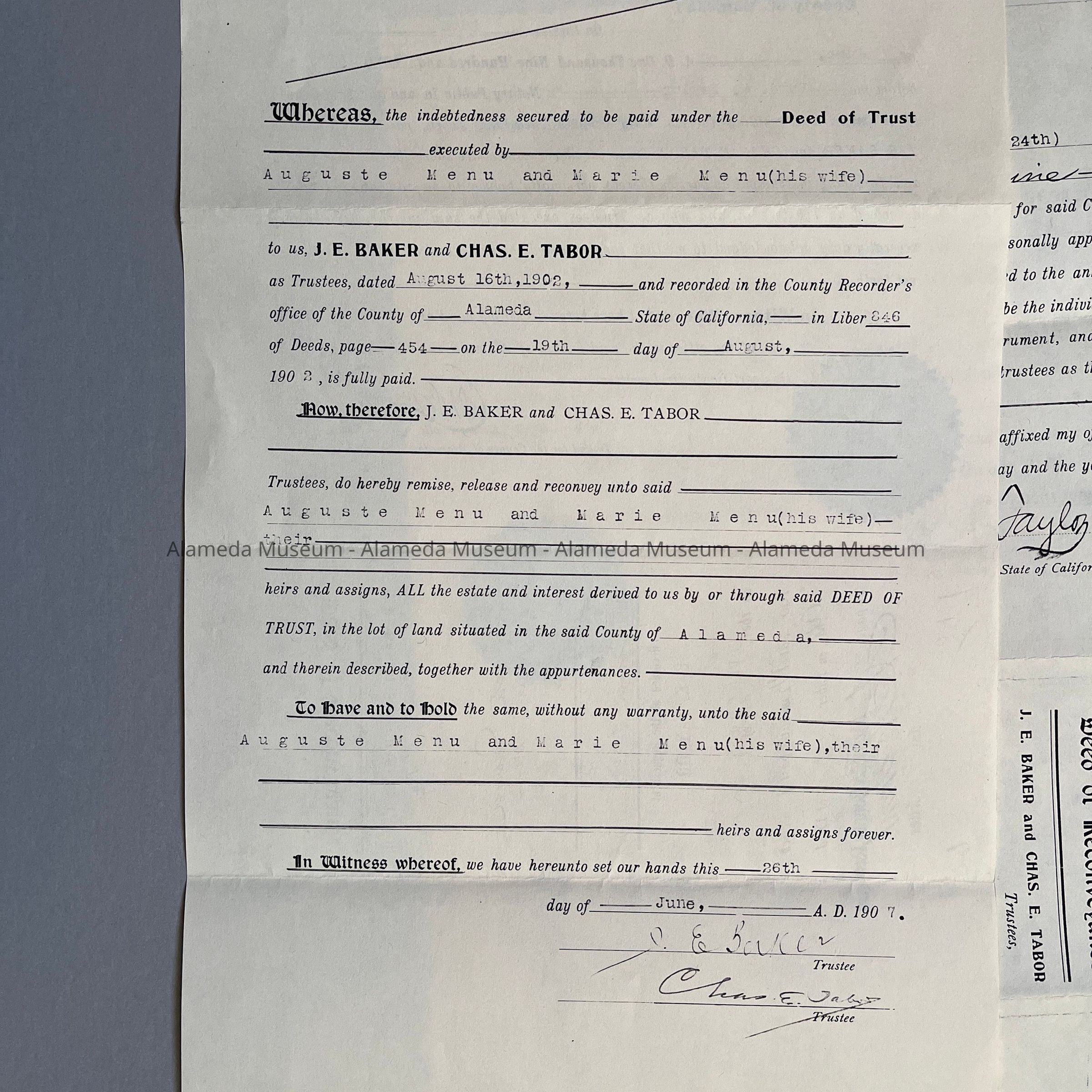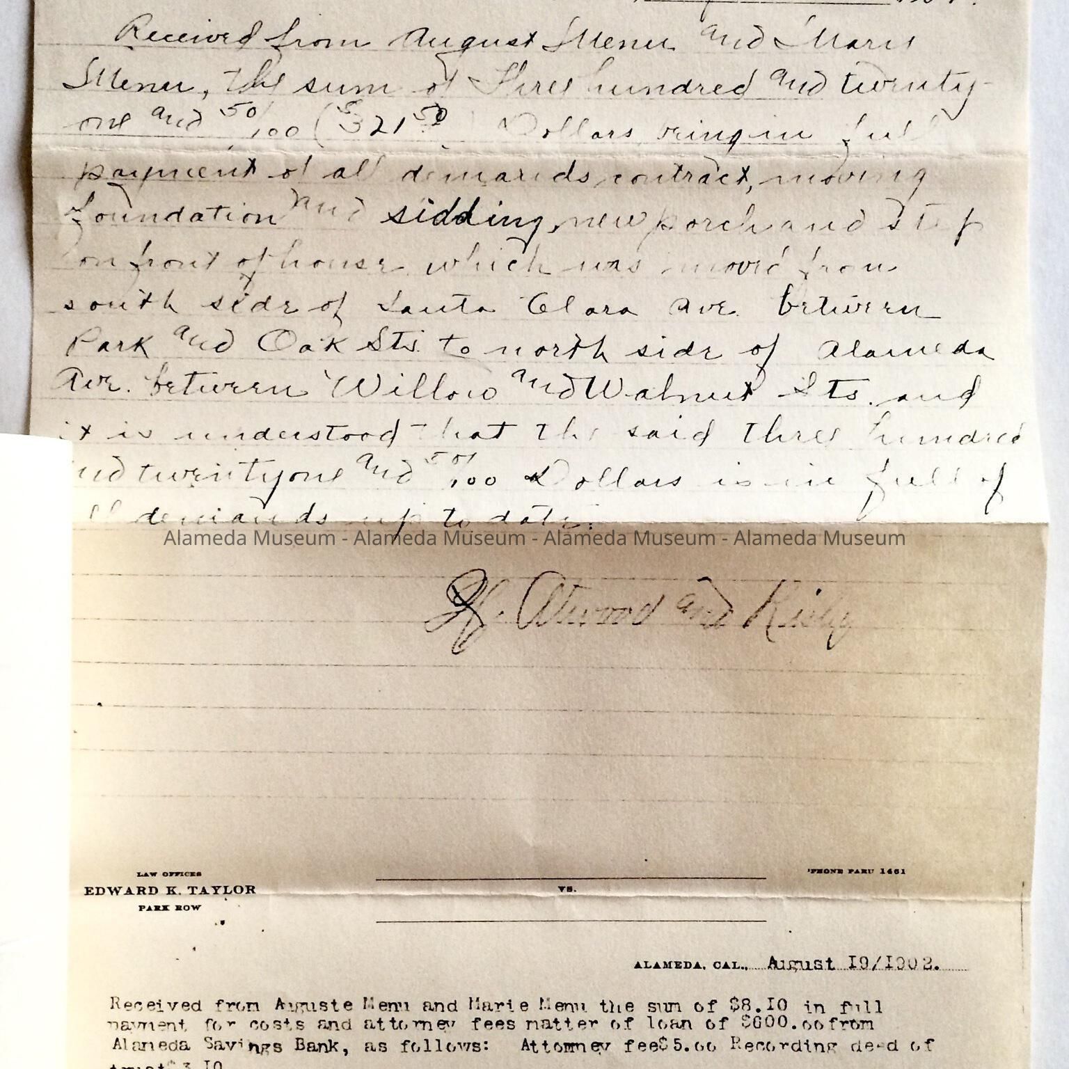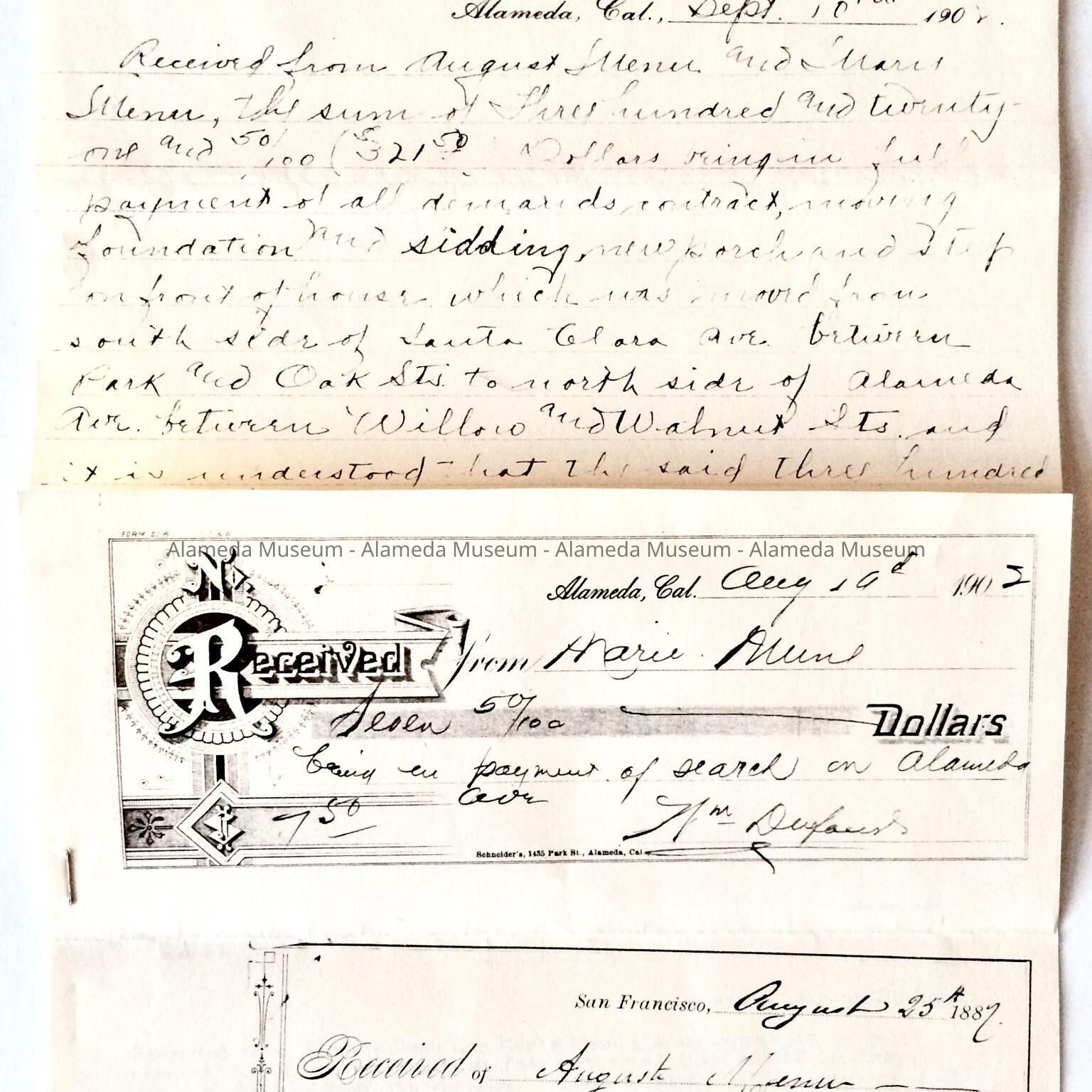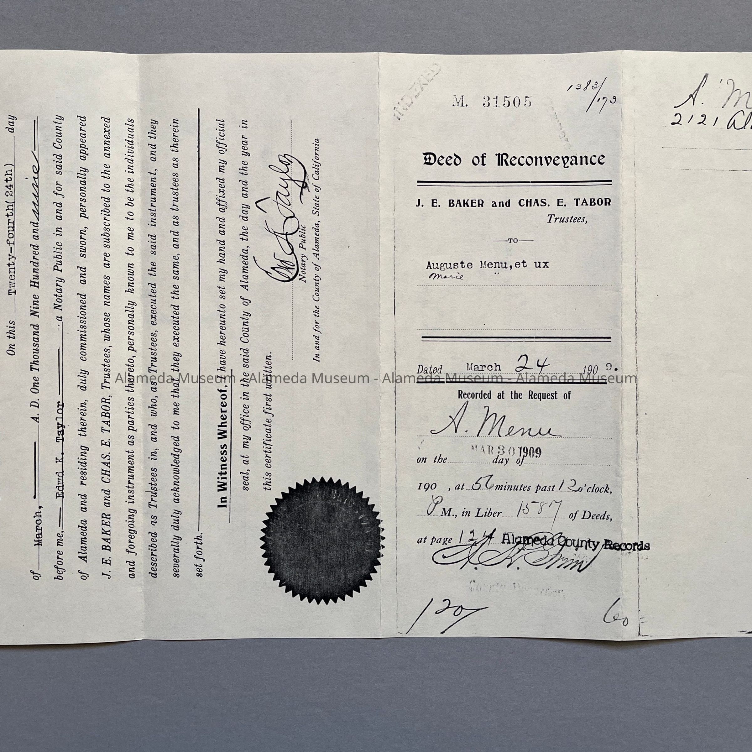 Deeds, Bill of Sale, Certificate of Title, etc. concerning 2121 Alameda Avenue. This early residence from the twenty-three hundred block of Santa Clara Avenue was built in 1902 for the Menu family. Included are deeds to the property on Alameda Avenue, dated 1907, including the Bill of Sale of the house which was 2320 Santa Clara Avenue and subsequently moved in 1902 to 2121 Alameda Avenue.