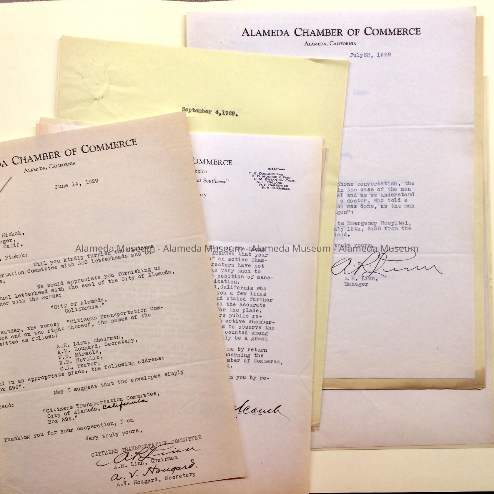 Description: Acid-free legal size file folder with documents, all from or to a Chamber of Commerce, not all in Alameda, but all to or from City Manager Hickok. Also includes a letter from the Chamber of Commerce, originally in a separate folder, with a request for stationery for the ‘Citizens Transportation Committee’, with a list of members.