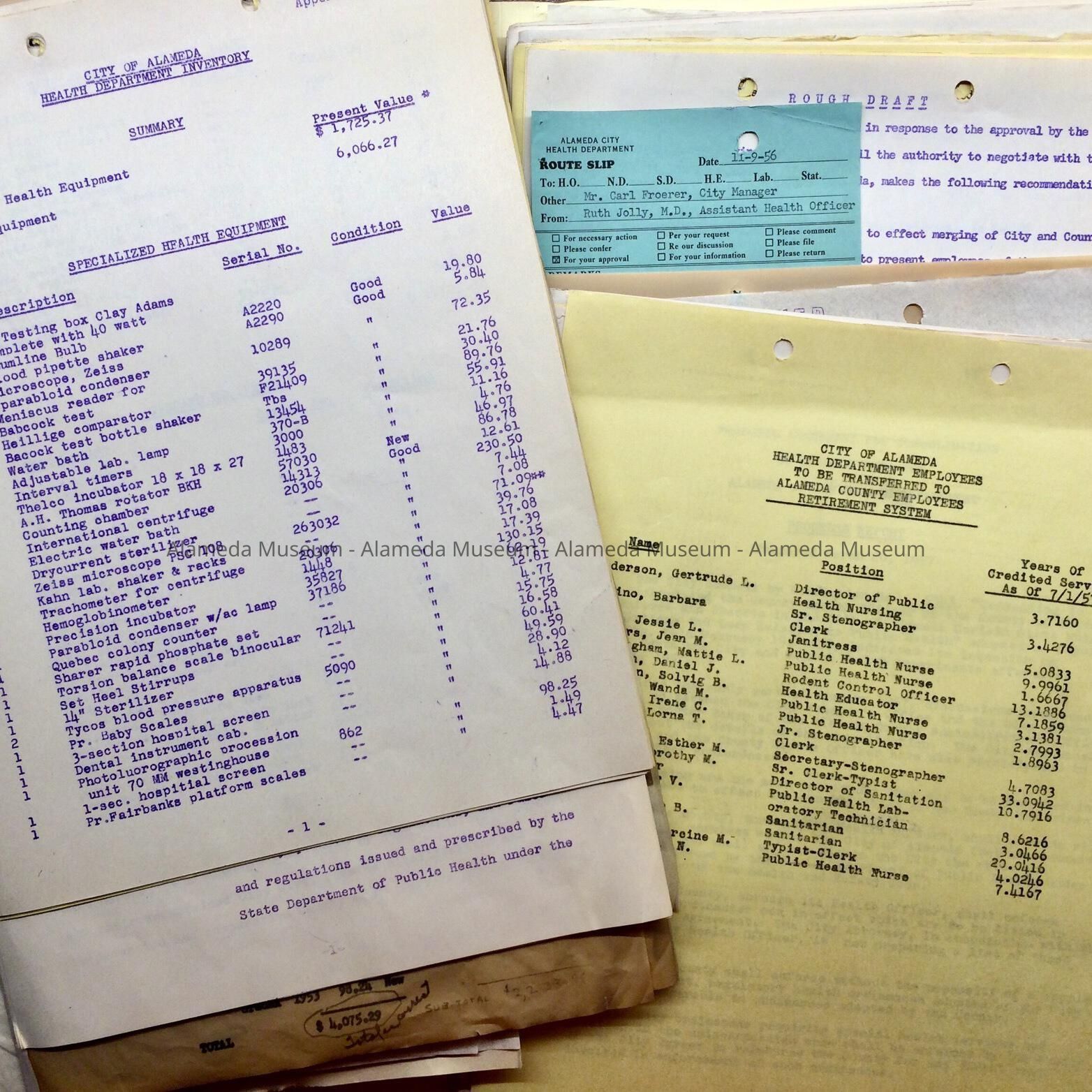 Documents found in the attic of City Hall, prior to renovations. These documents were originally in a folder (discarded in 2011) with a green label on the tab stating: "Health - 1957 - Consolidation of Alameda Health Department with County of Alameda”.