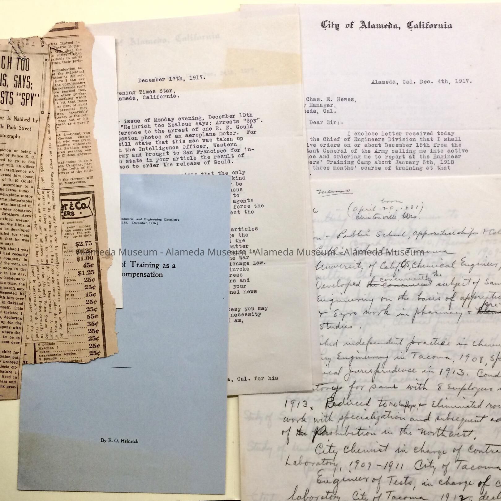 Documents found in the attic of City Hall prior to renovations in the 1990s, placed in a new folder in 2020. Notes left from accession in 2011 indicate the original file folder (now discarded), once stated ‘Heinrich’ on the crumbling tab, but this had broken off. Documents pertain to E. O. Heinrich, who was Chief of Police in 1917-1918 (upon retirement of John Conrad). Includes newspaper clippings, including overzealous arrests of spies, a publication written by Heinrich, ‘Capitalization of Training as a Basis for Compensation’, and requests to attend a training camp.