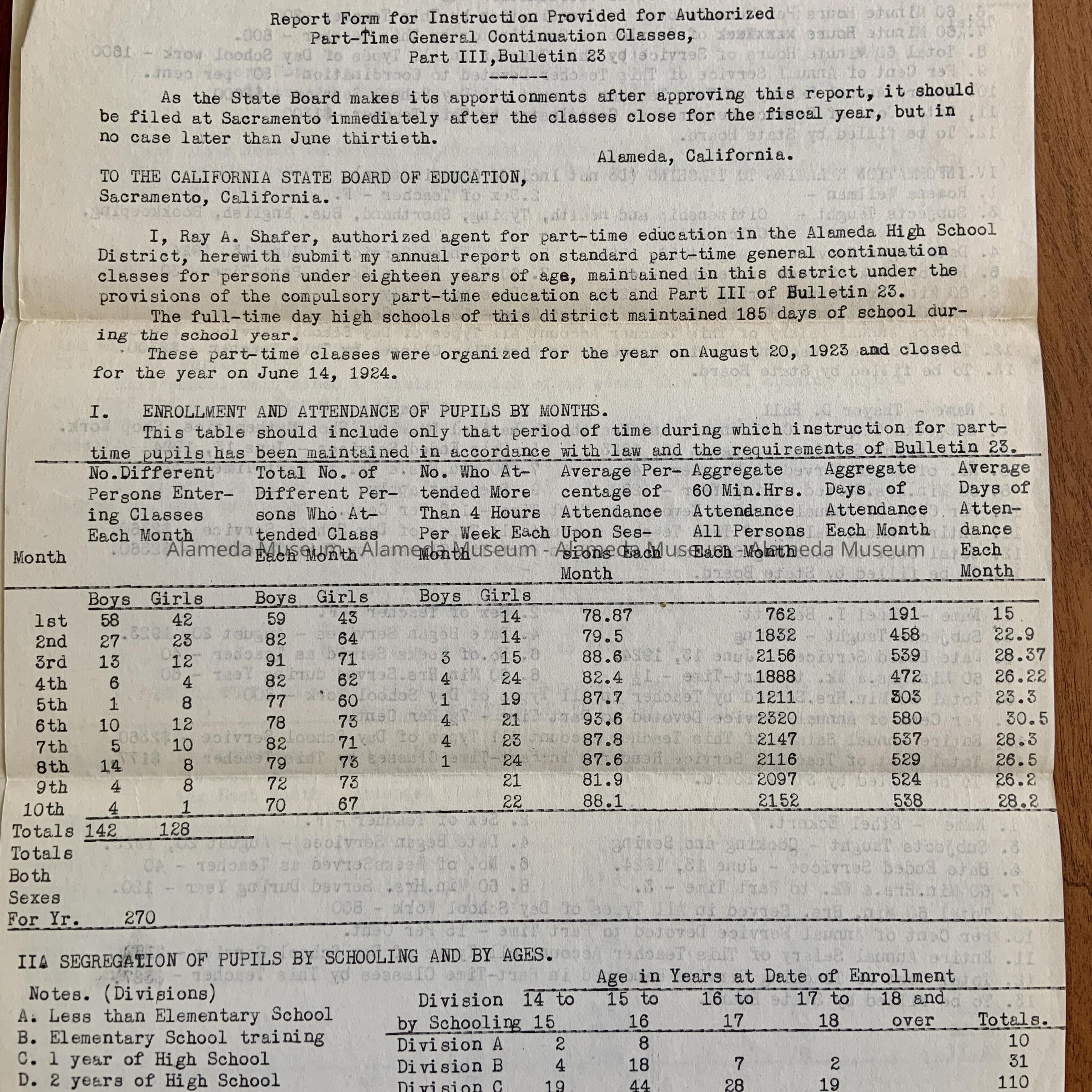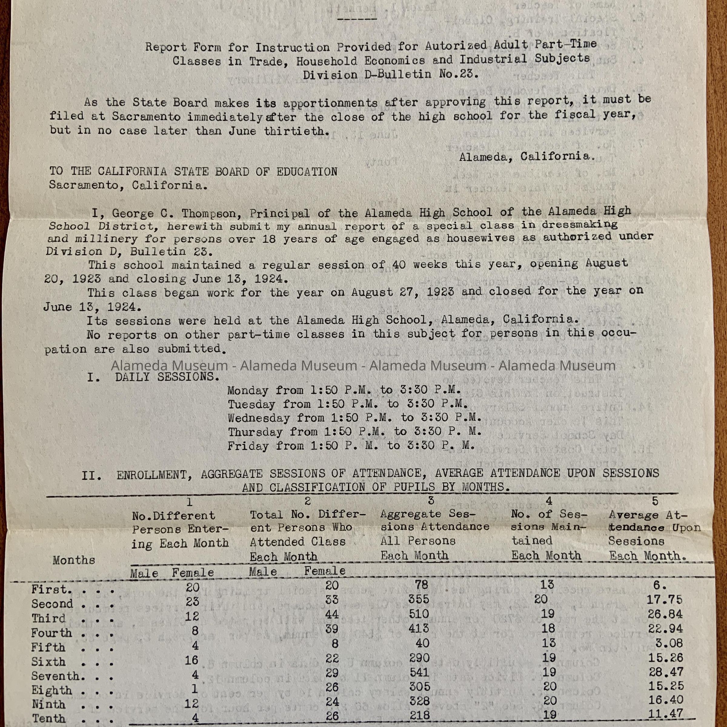 G. Copy of typed statements for the California Board of Education, Department of Vocational Education, titled ‘Report Form for Instruction Provided for Authorized Part-time General Continuation Classes.’ Appears to be enrollment statistics for vocational classes, one form submitted by R. A. Shafer - agent for part-time education, the other by George C. Thompson, principal, both for the Alameda High School, 1923.