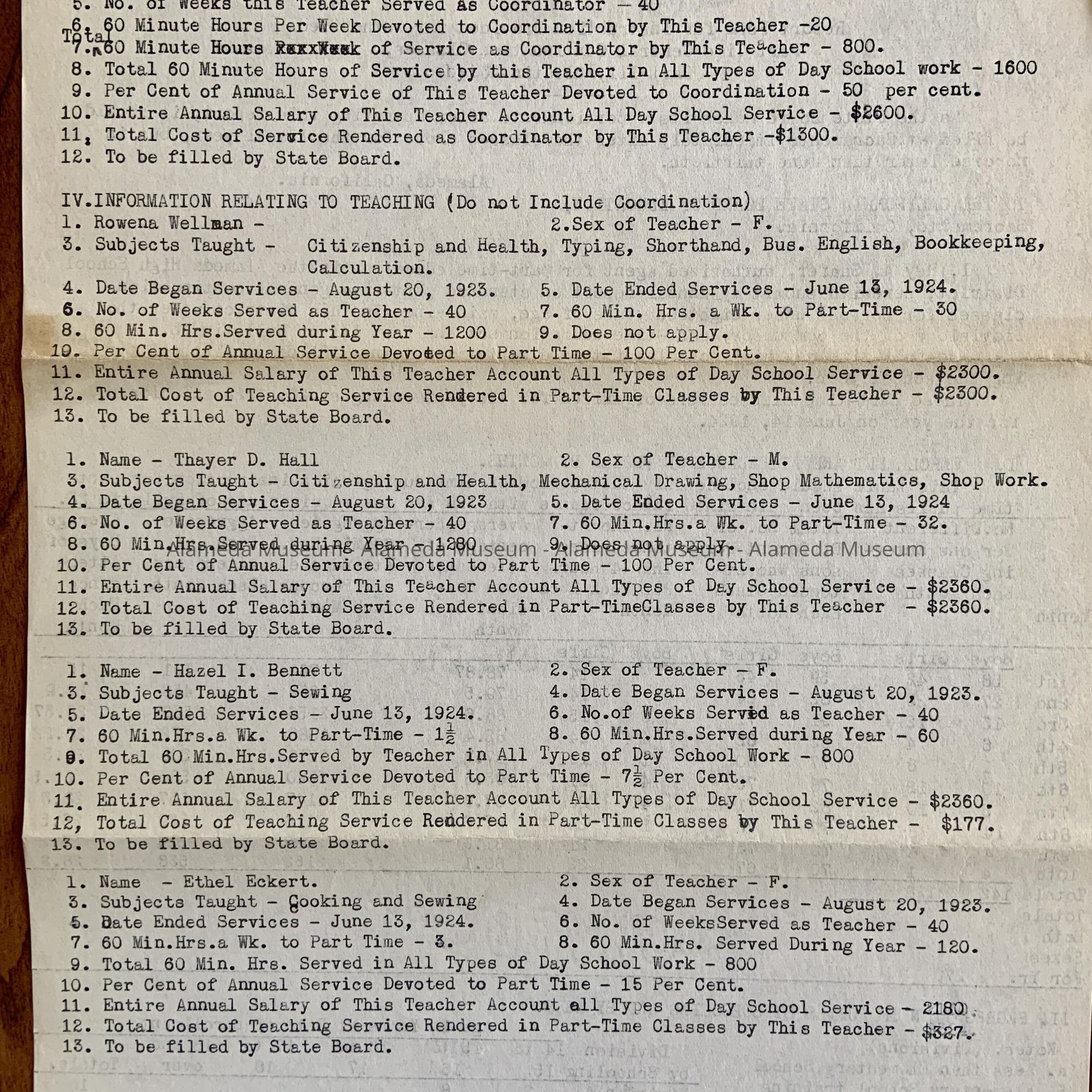 J. Typed reports of Teachers and Salaries, Evening High School or Evening Commercial School, between 1919 and 1921.