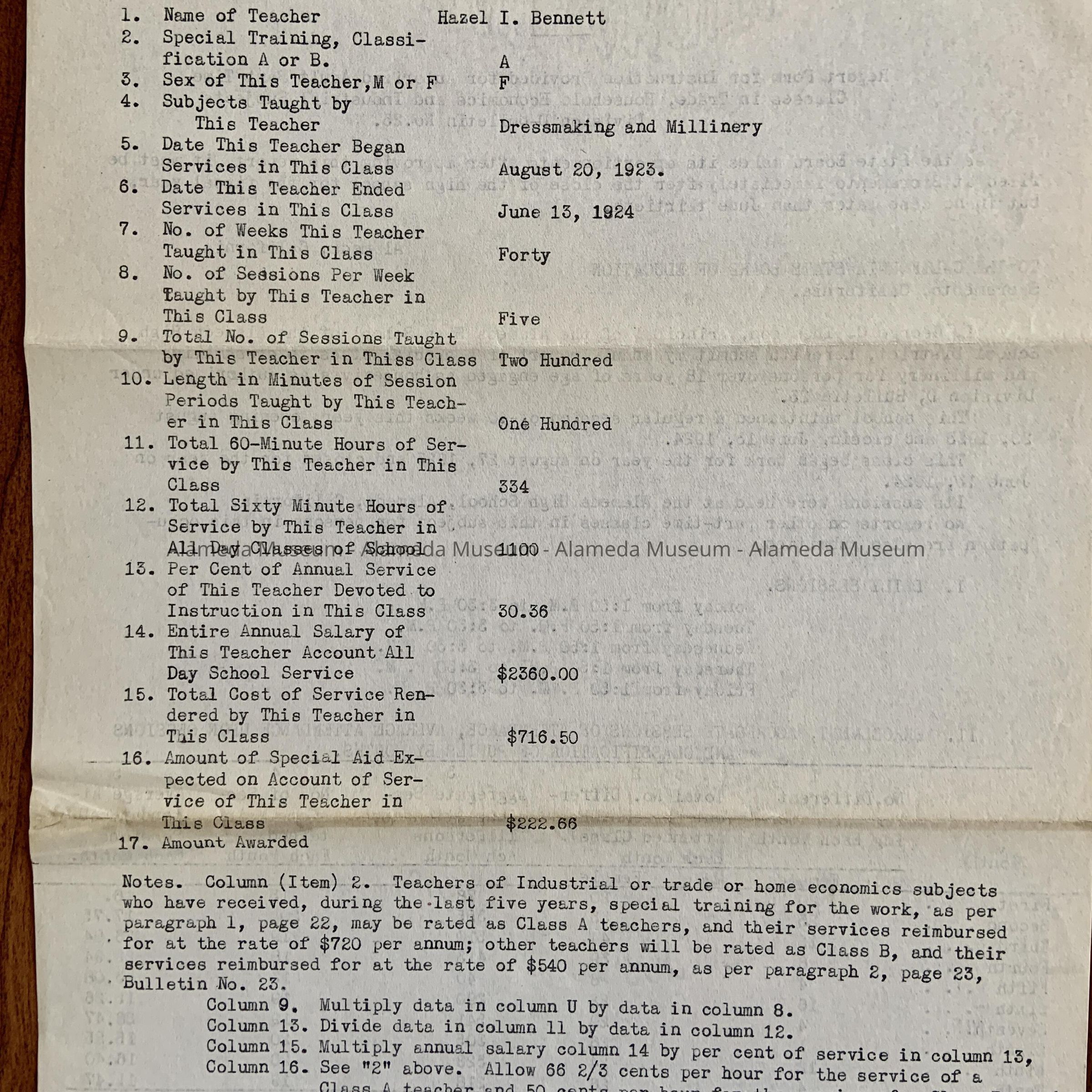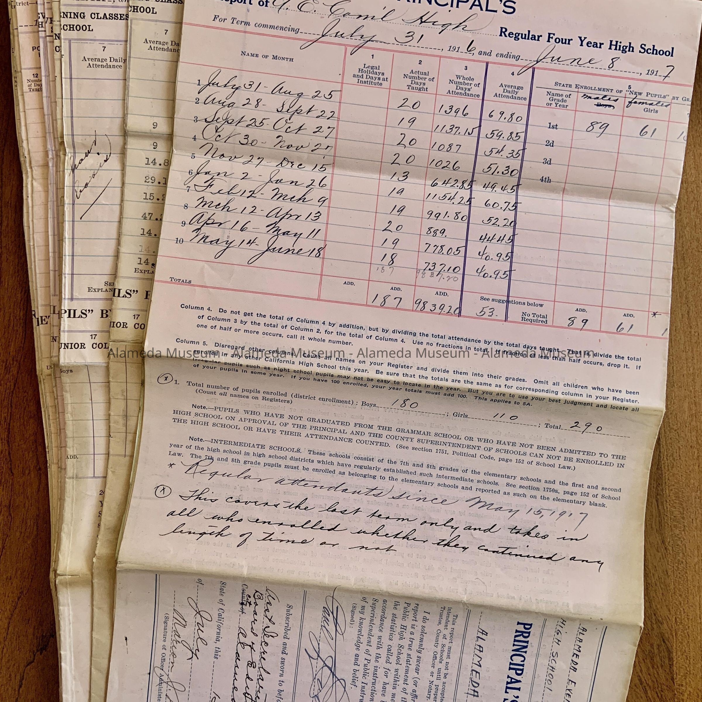 A: 14 Principals' Reports Alameda Evening Commercial High School, 1916-1921, forms on pink paper, with blue or black type; oldest ones filled in by hand in black ink, later ones filled in by typewriter. Some include sample Certificates, and/or lists of Teachers and their salaries.