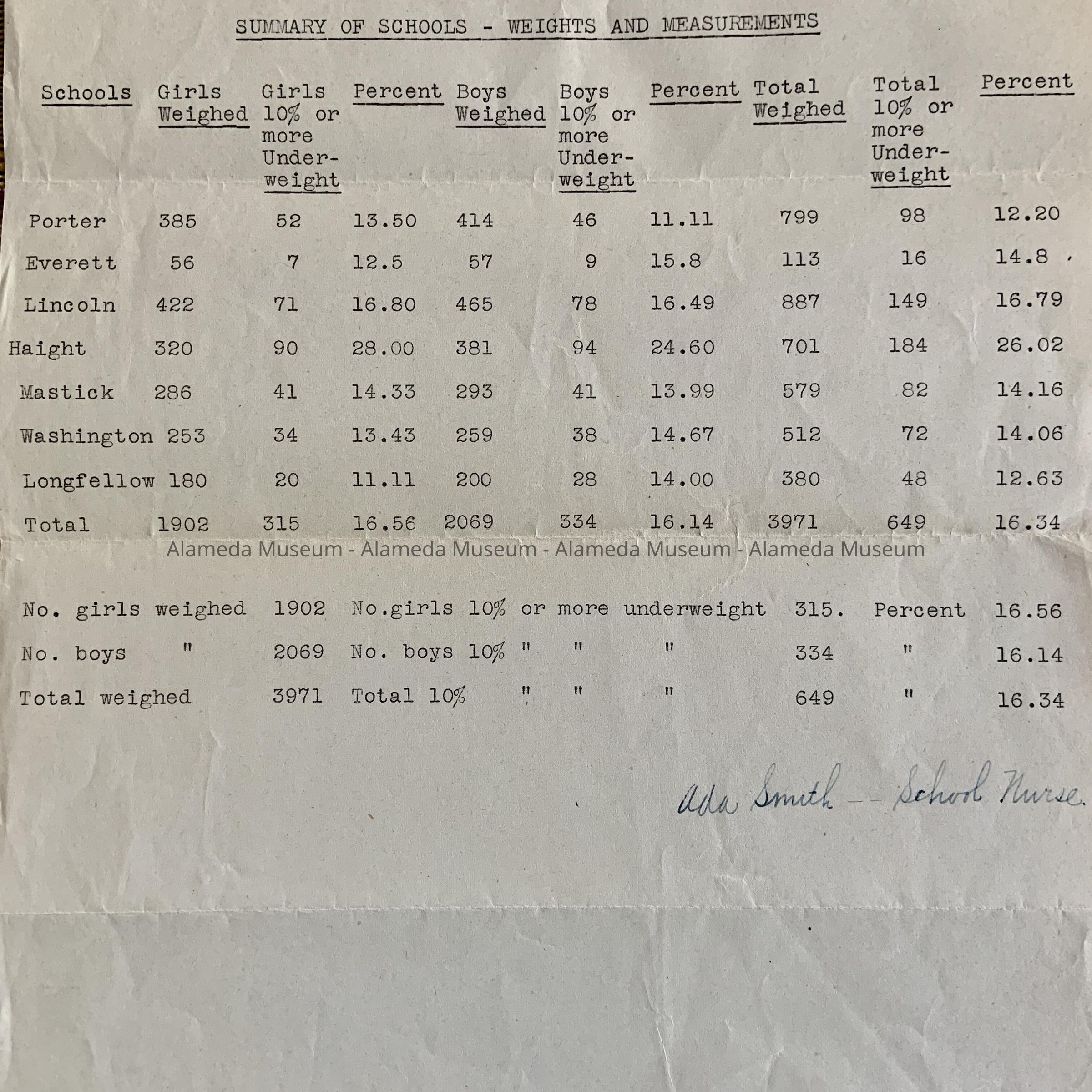 I. Single-sheet report, titled 'Summary of Schools - Weights And Measurements', dated Aug. 27-31, 1923, a report of the percentages of kids that were underweight, given per school and divided in boys and girls, submitted or weighed by Ada Smith, School Nurse.
