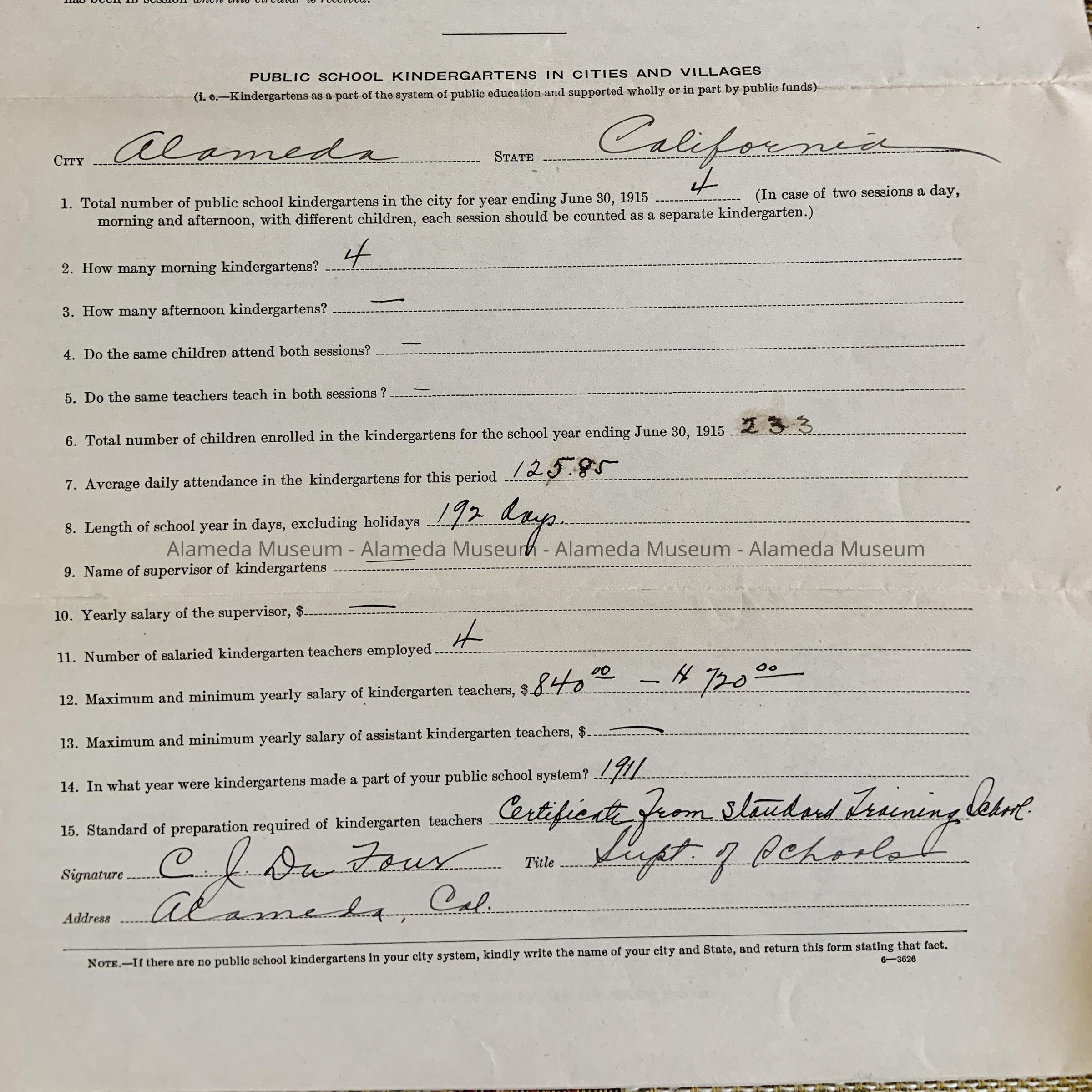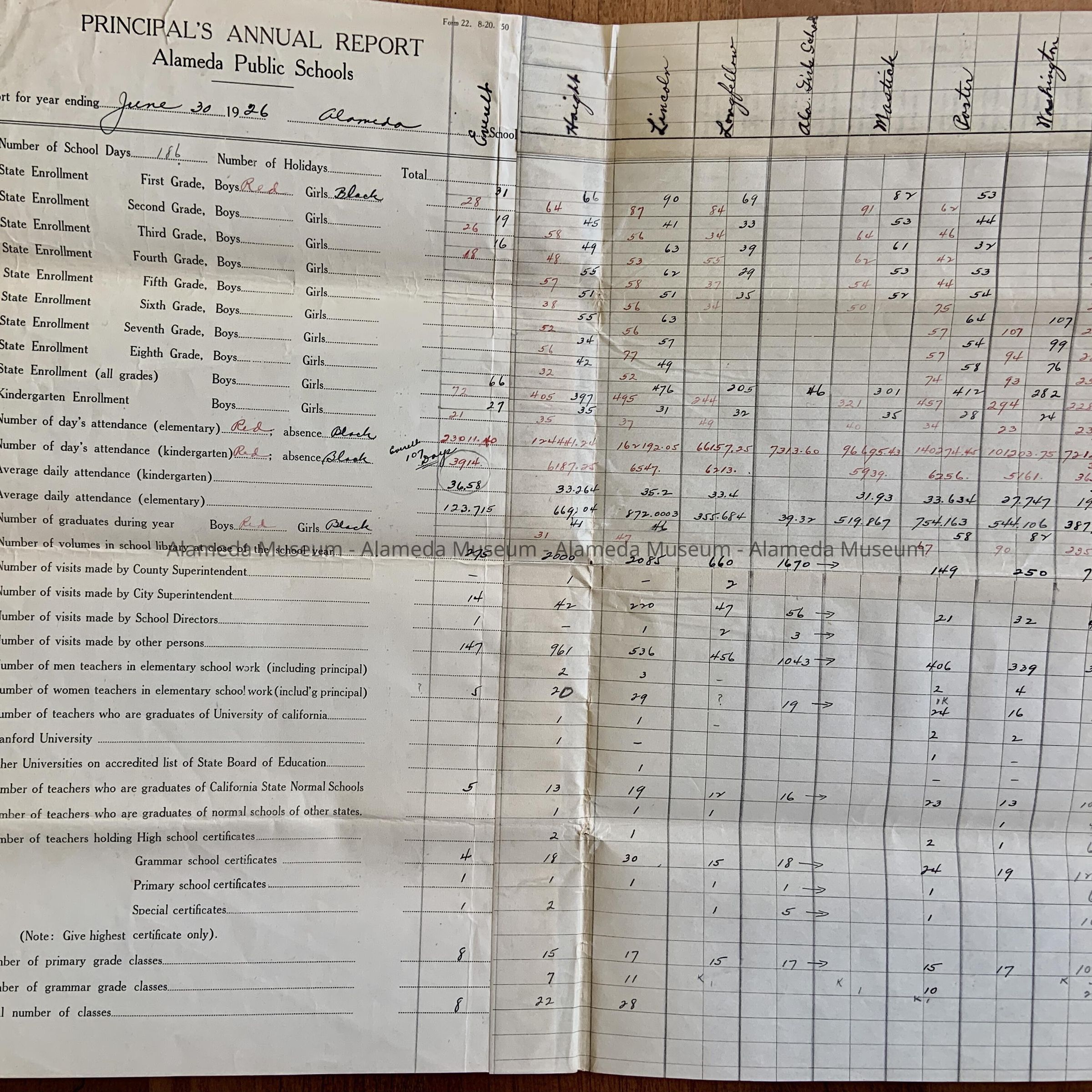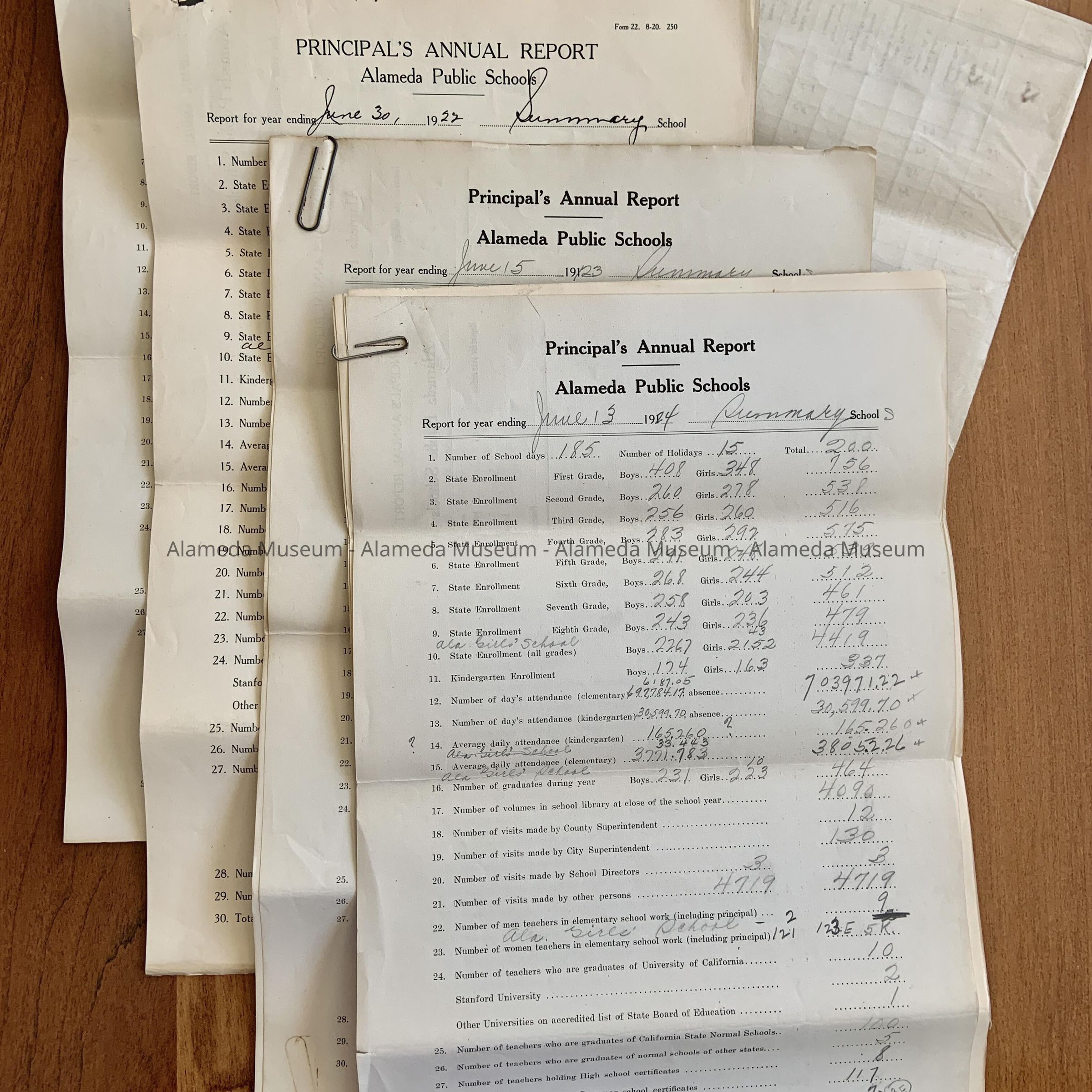 C. Legal size forms with blanks on white paper with black type, most filled in in ink by hand, some typewritten, titled 'Principal's Annual Report Alameda Public Schools, collected with staples and/or paperclips, most years reports for the various schools preceded by a summary form. Dating 1913-1926.