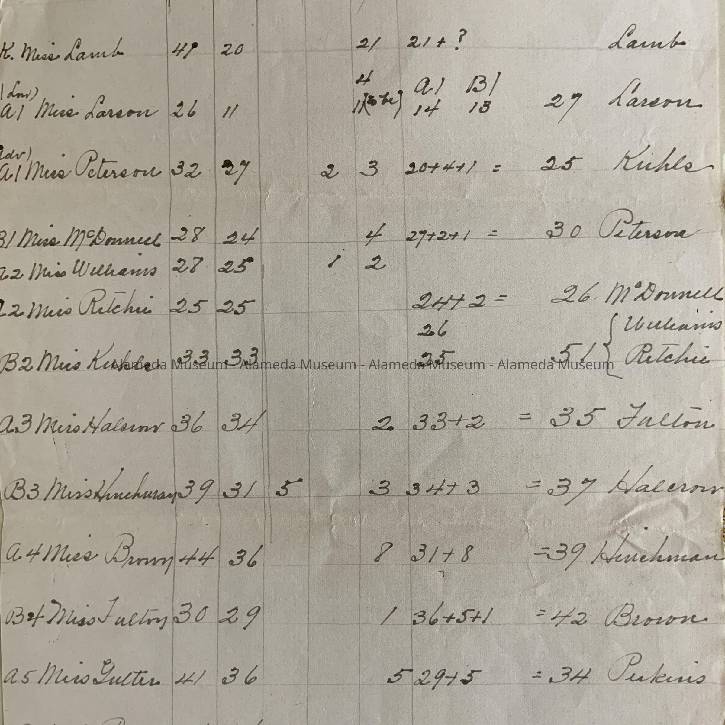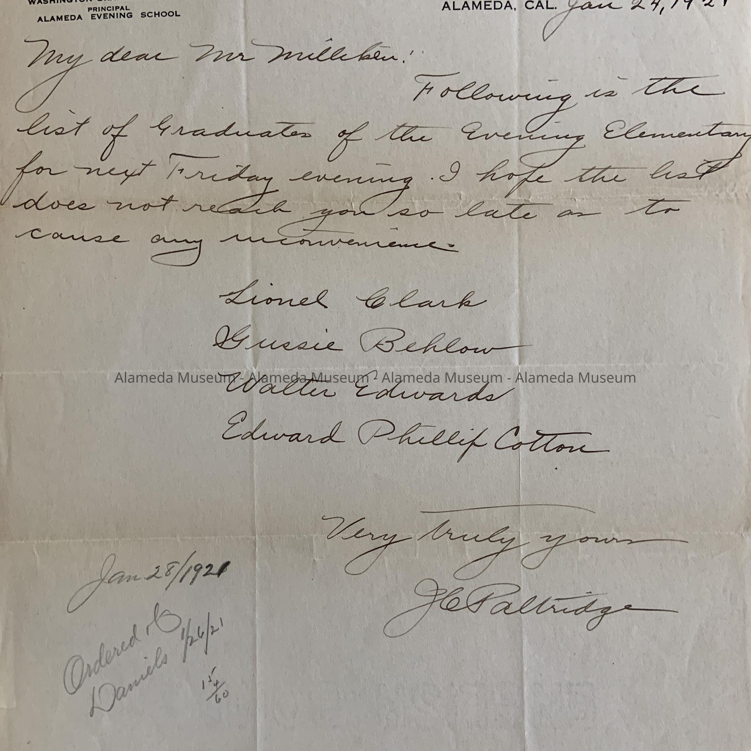 D. Letter, formerly folded in 12, on stationery and signed by John C. Paltridge, Alameda City Schools stationery, dated Jan 24, 1921, addressed to Mr. Milliken, handwritten in black ink, about 4 candidates to be added at the last moment to the list of graduates for the Evening Elementary School for the January (‘next Friday’) graduation ceremony (Lionel Clark, Gussie Behlow, Walter Edwards, Edward Phillip Cotton). Has penciled dates and calculation, presumably the receipt of the letter (28/1921) and the ordering of the printed certificates (‘Ordered of Daniels 1/26/21).