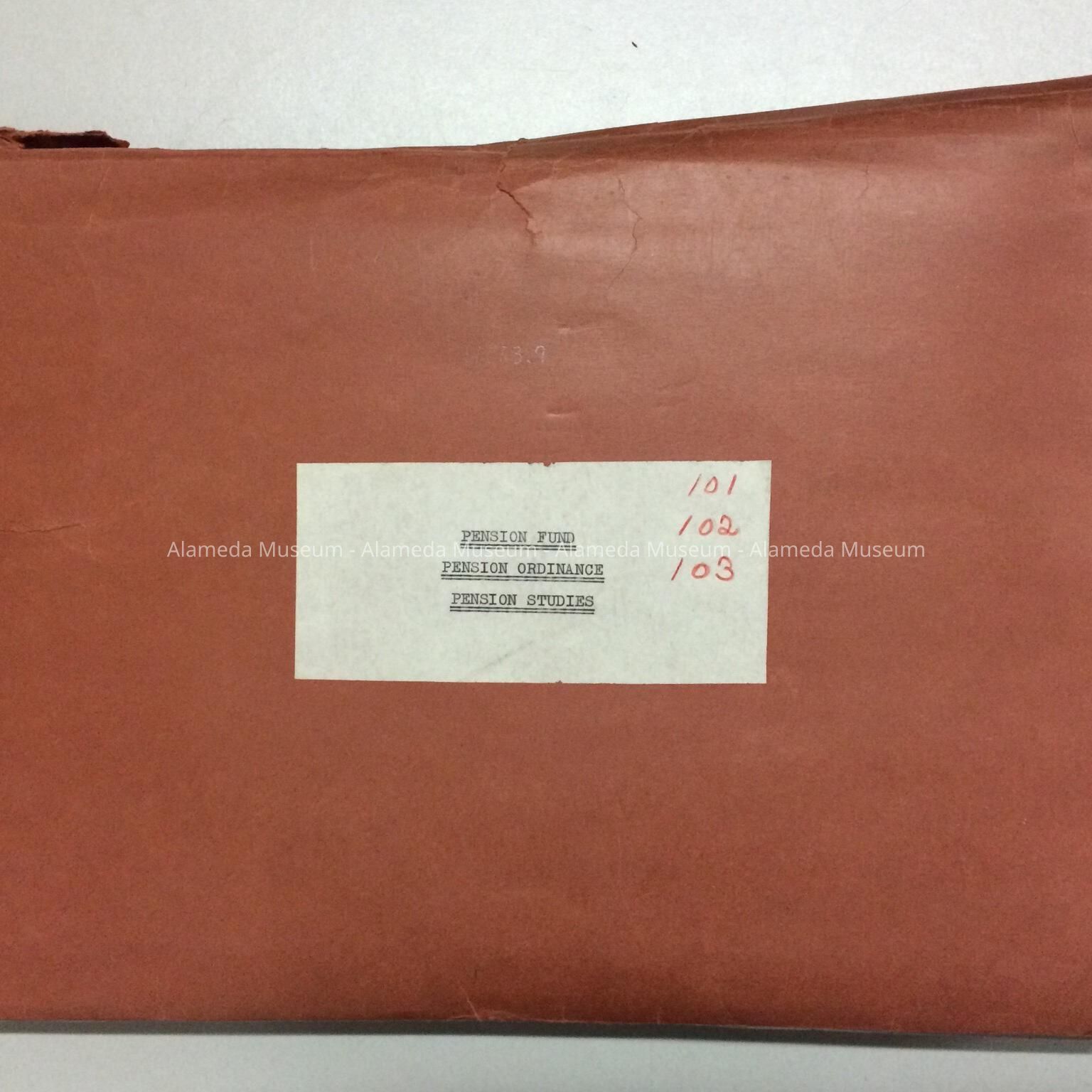 Description: Brick red expanding file folder marked with black marker: Bureau of Electricity, filled with documents. Verso has 'Pension Fund, Pension Ordinance, Pension Studies' and in red grease pencil '101, 102, 103'.