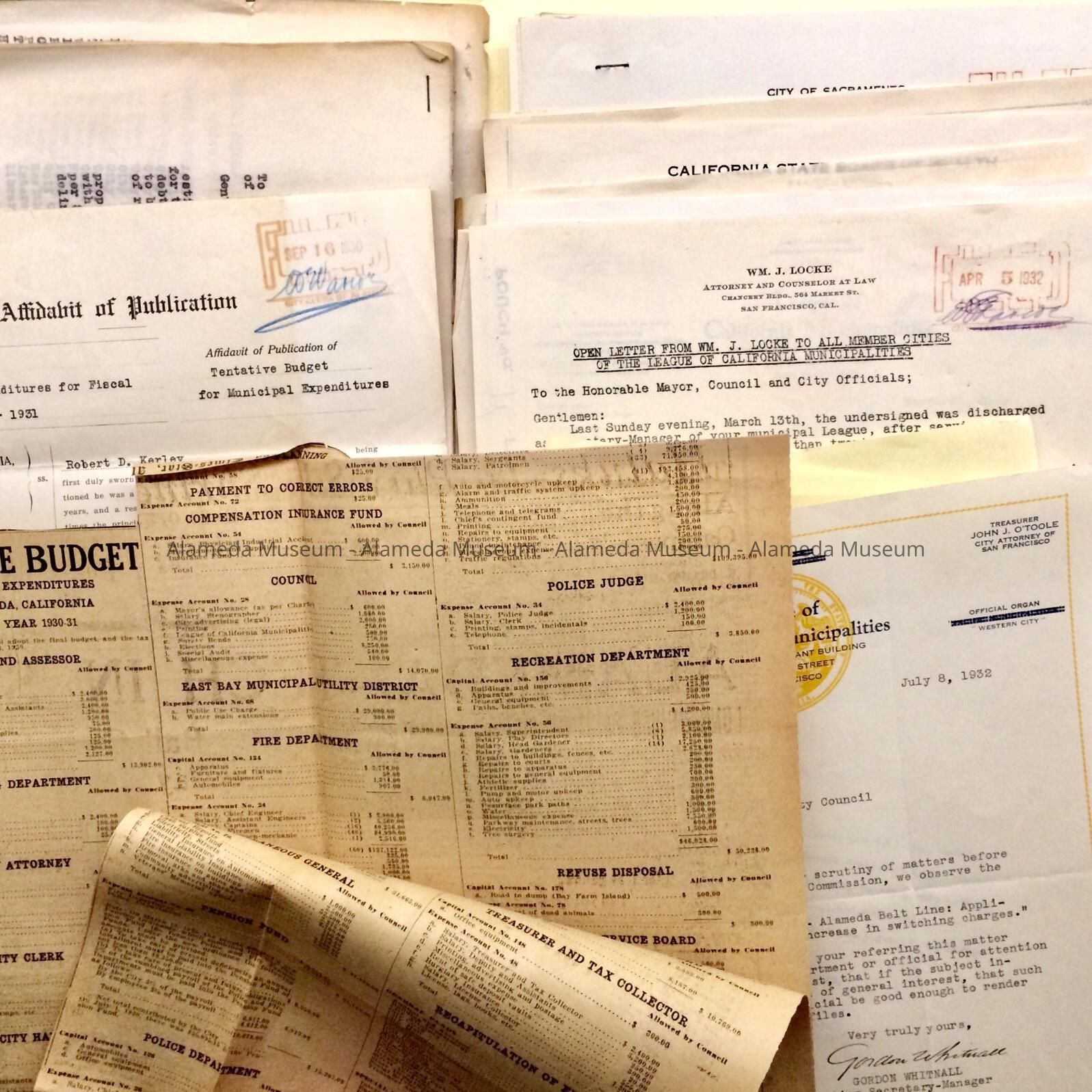 History of Object: Documents found in City Hall attic prior to renovations. Original tab had text: ‘Miscellaneous City Planning’, however, appears to be mostly holding documents relating to the League of California Municipalities, and Wm. J. Locke, previously City Attorney, was executive Secretary of the organization. According to 18-16, it was customary for the yearly convention to coincide with a conference of California Health Officers. Other topics discussed include a gasoline tax; and a legal protection against fraudulent injury lawsuits (18-32). 18-14 shows that Mr. Locke was summarily dismissed by the Board under - in his opinion - questionable circumstances. 18-15 describes correspondence relating to switching charges increase from the Alameda Belt Line.