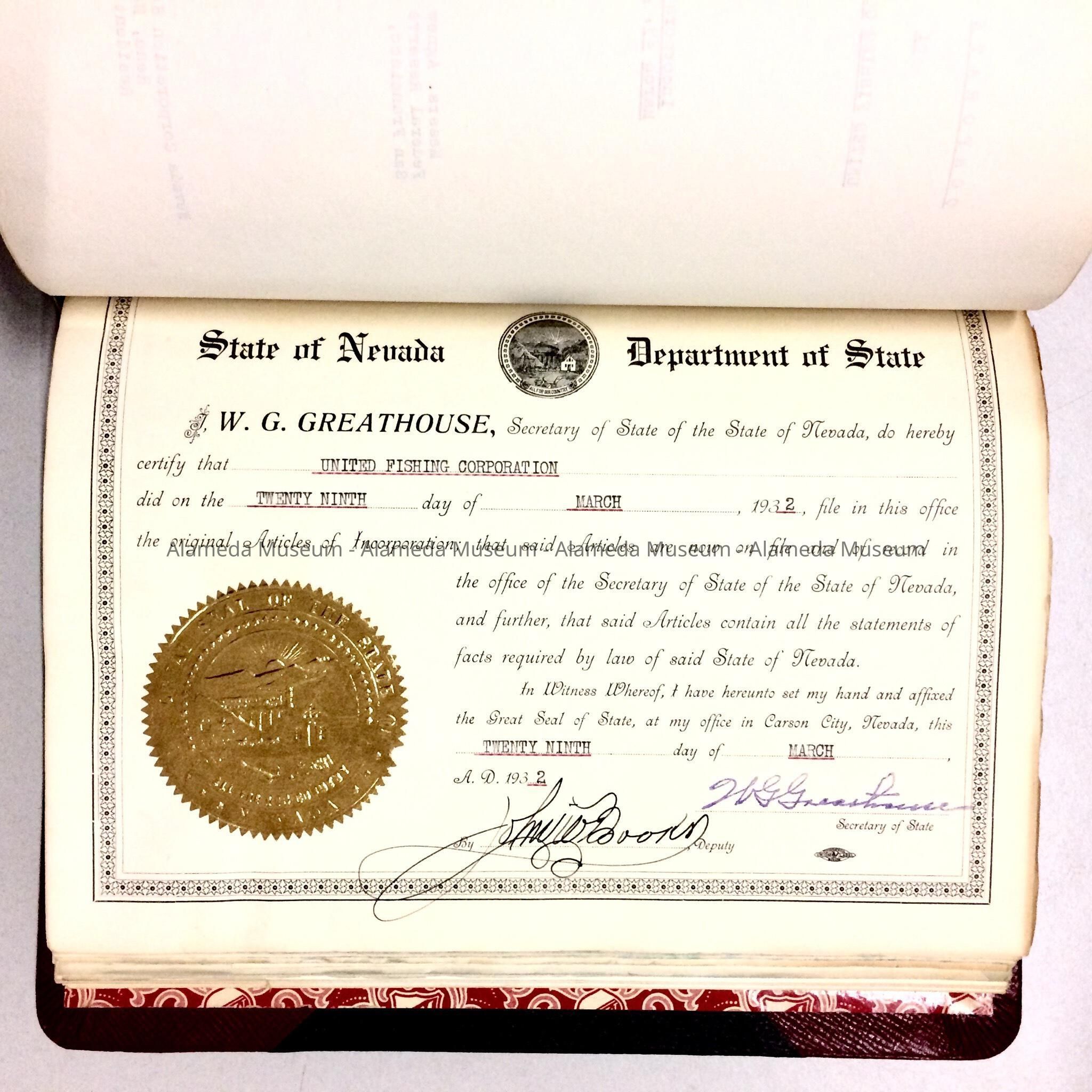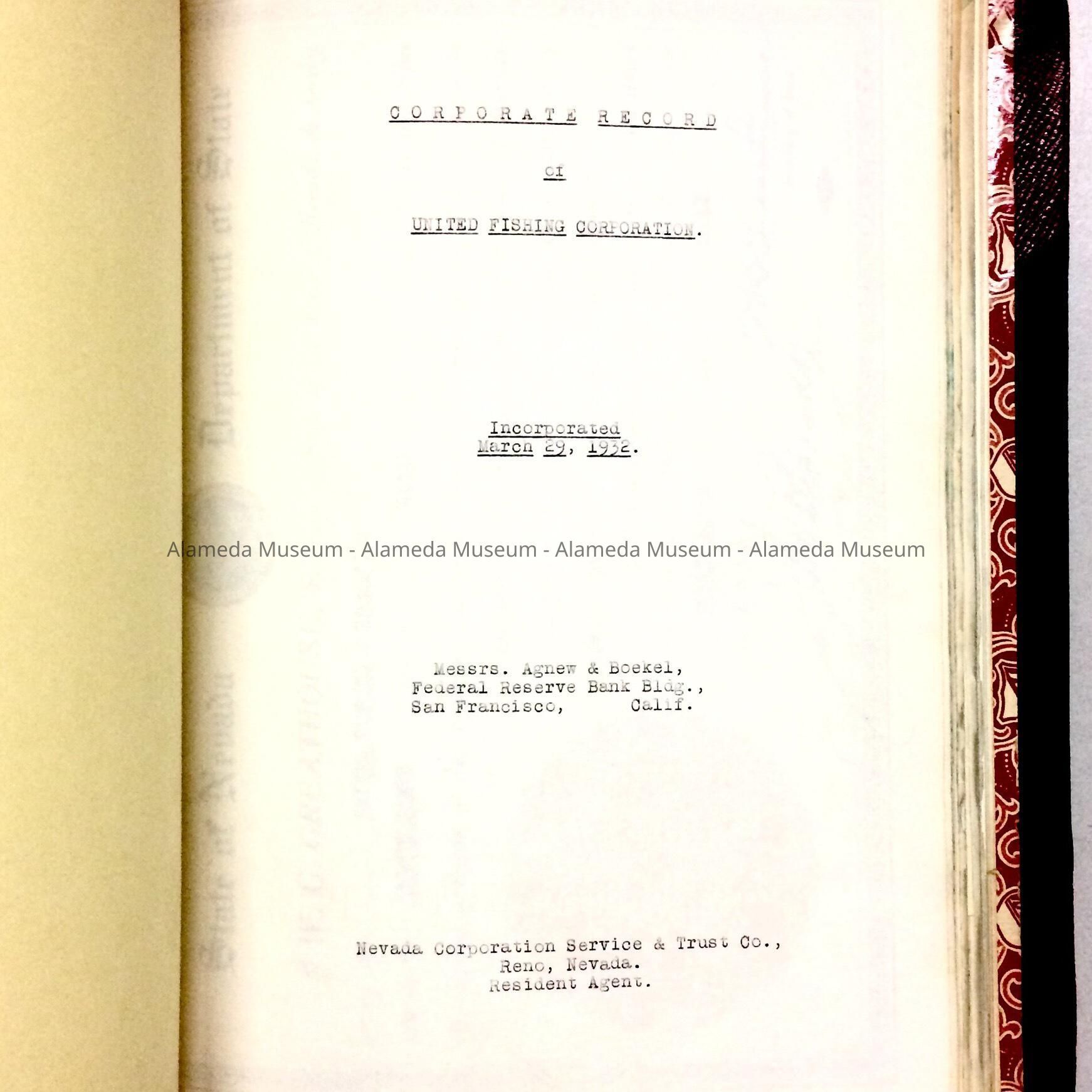 CORPORATE RECORD OF UNITED FISHING CORPORATION, INCORPORATED, MARCH 9, 1932. UNITED FISHING CORPORATION WAS LATER SUCCEEDED BY THE ALAMEDA SOUTH SHORE LAND COMPANY. THE REPORT ALSO INCLUDES A SAMPLE OF THEIR STOCK CERTIFICATES. THE VOLUME ALSO INCLUDES MINUTES OF THE ALAMEDA SOUTH SHORE COMPANY TO SEPTEMBER 14, 1950.