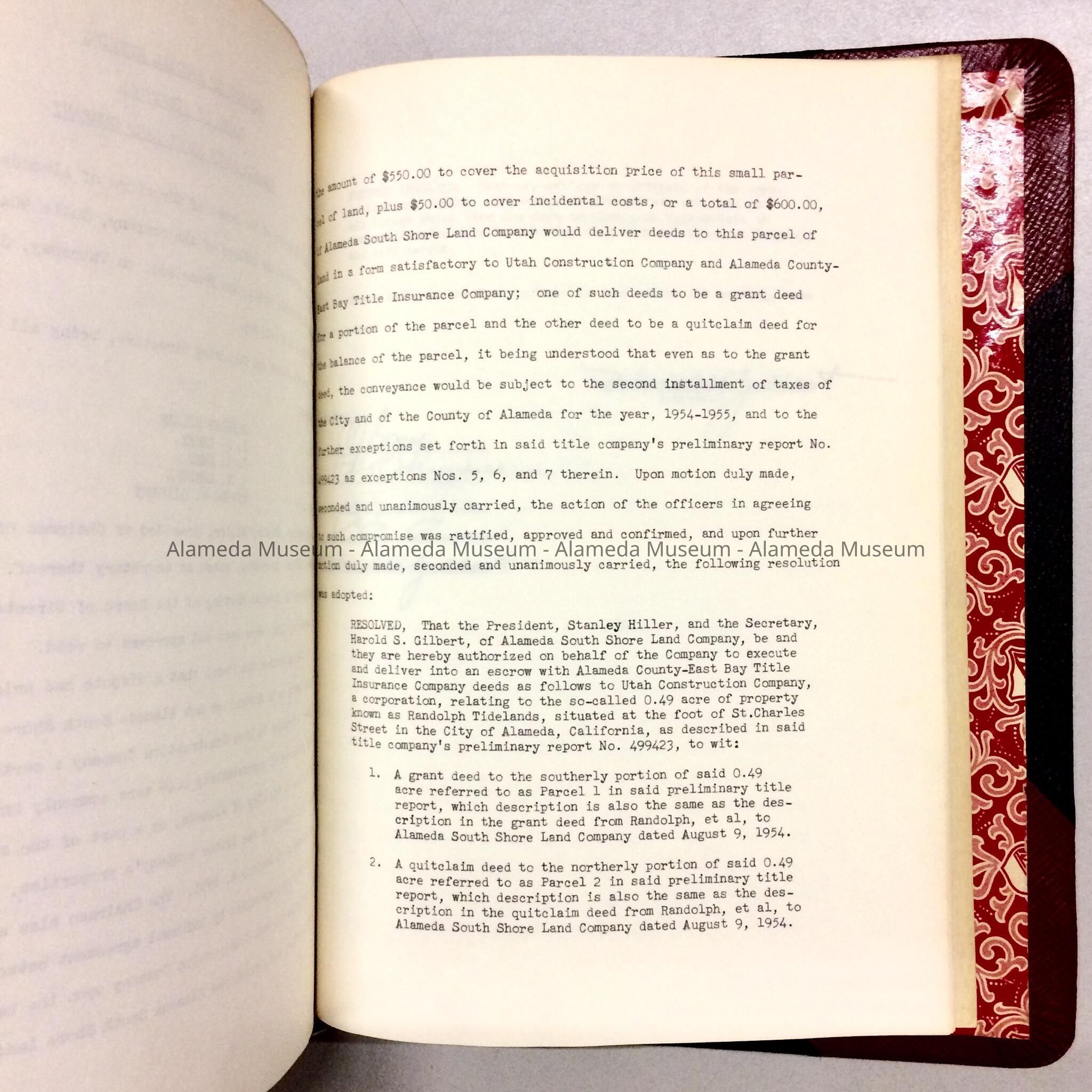 TYPEWRITTEN MINUTES IN LOOSE-LEAF HARD-BOUND BINDER OF IMITATION LEATHER (BLACK-COLORED), TRIMMED IN RED AND ACCENTUATED WITH GOLD. COVER CAPTION IN INCISED GOLD LETTERING STATES, "ALAMEDA SOUTH SHORE LAND COMPANY."