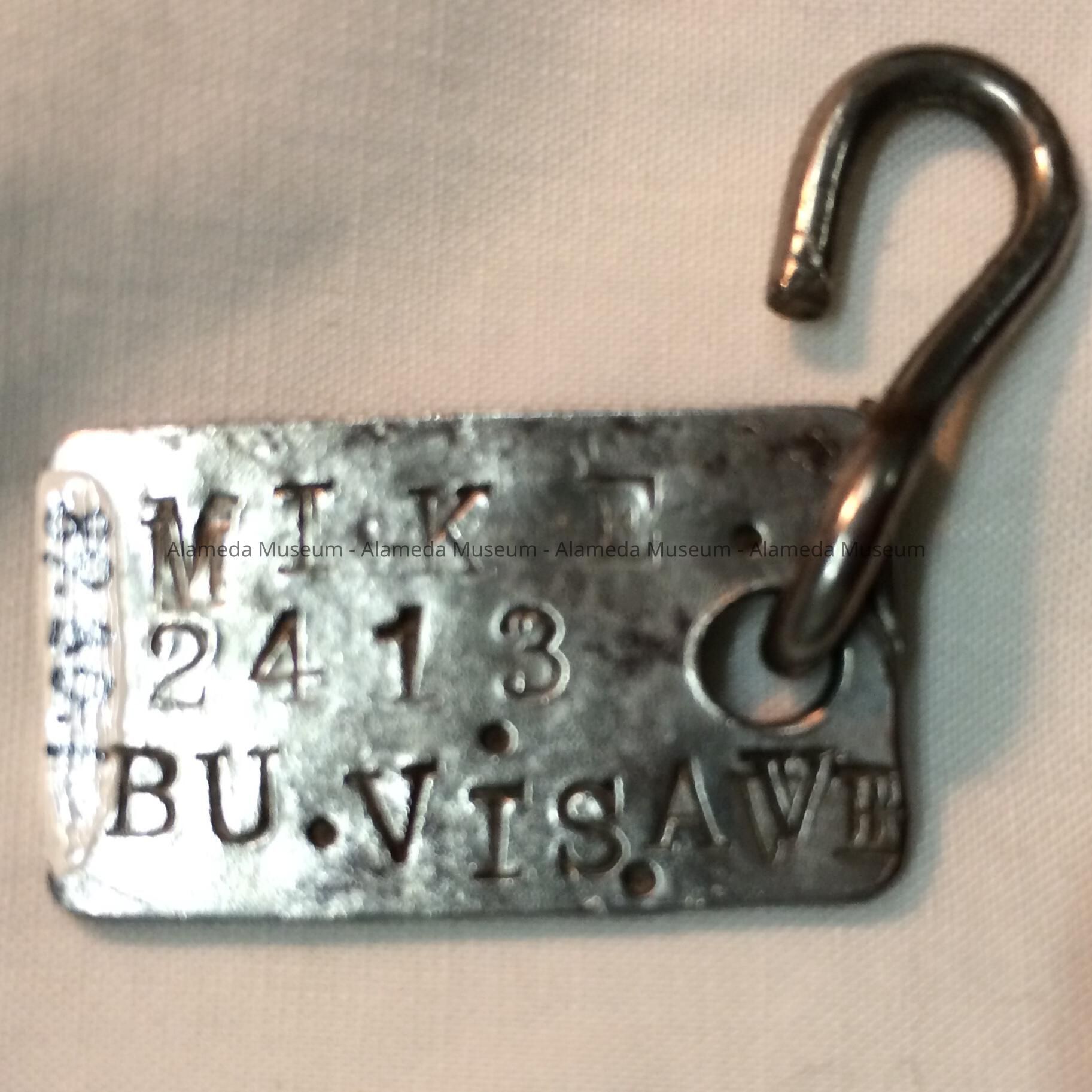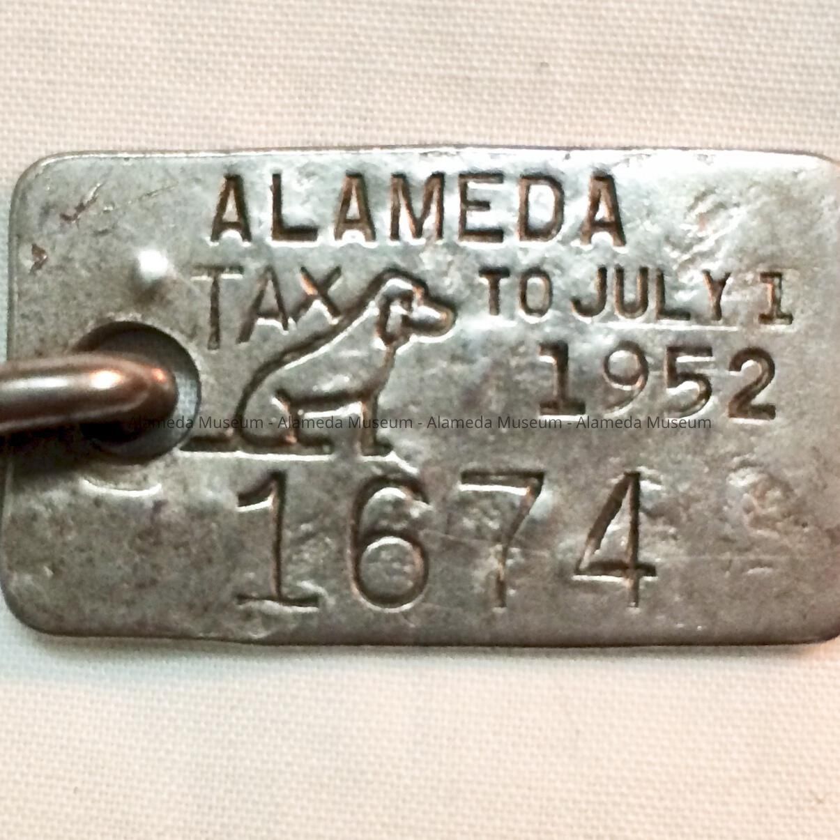 Description: Aluminum tag with incised lettering stating "Alameda Tax to July 1, 1952" "1674," on reverse side "Mike-2413 B.V. Ave." Pierced with a metal link for attaching to dog collar.