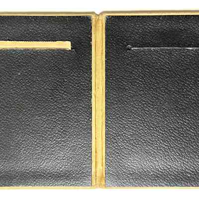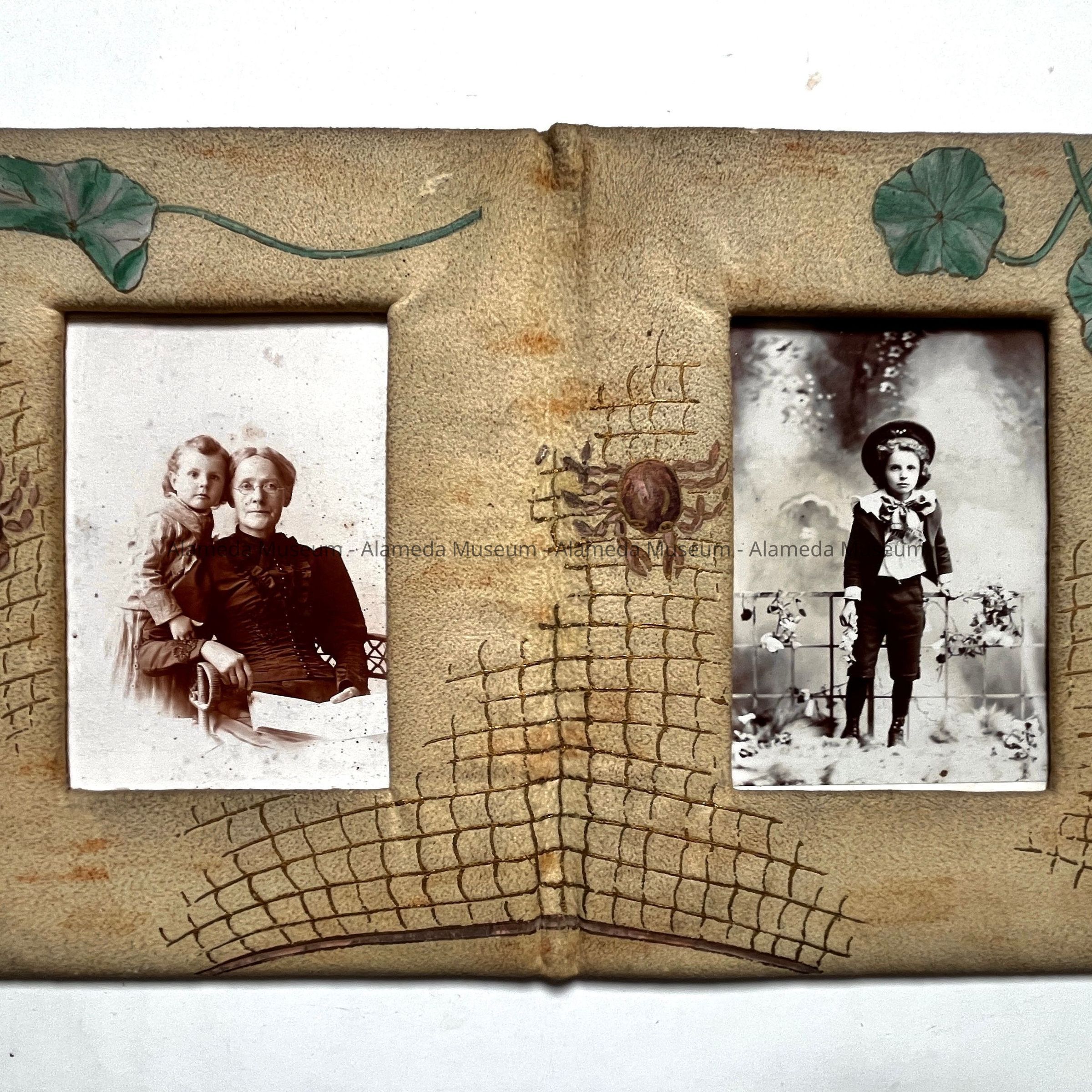 Unusual jacket-like frame of off-white colored kid, hand painted with decorative designs of leaves, crabs, and fishing nets. Frame contains 2 sepia-tinted photographs.