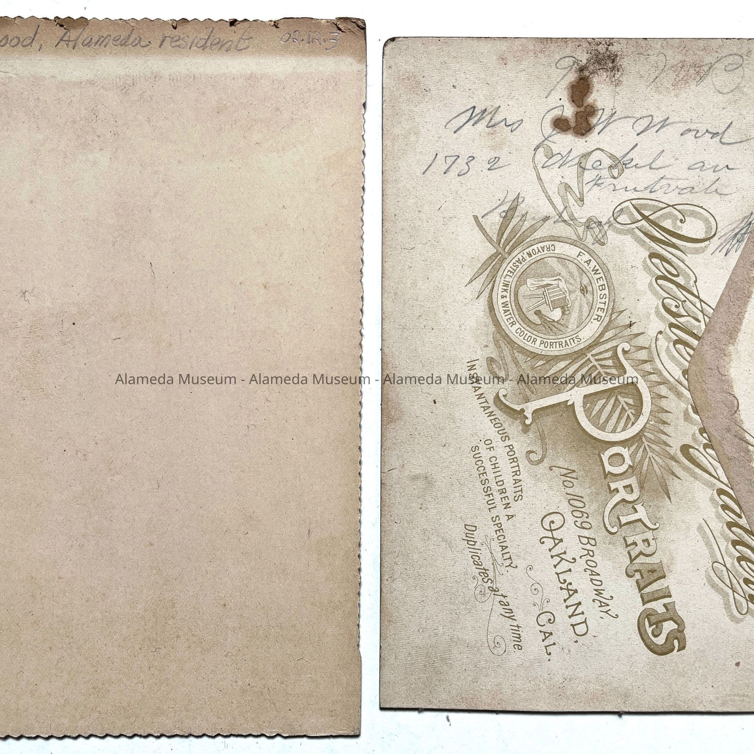 Left photograph unknown; right photograph of W.H. Wood, father of the donor and longtime resident of Alameda. The Wood Family came to Alameda following the 1906 earthquake in San Francisco,