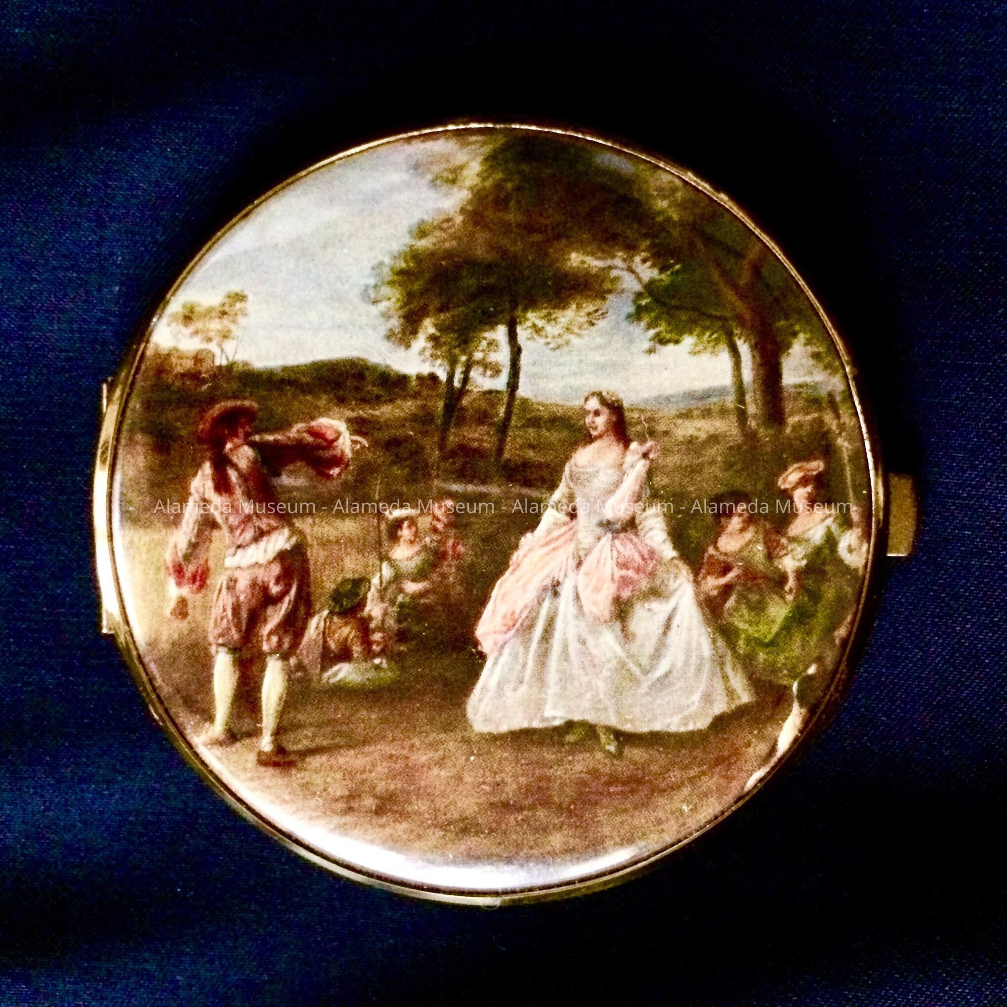 Description: hinged double pocket mirror in case, with plasticized cover over an image - same image on both sides - of people in 18th century clothing in an outside setting, with brass rim. Inside is one normal and one magnifying mirror. No maker's marks.