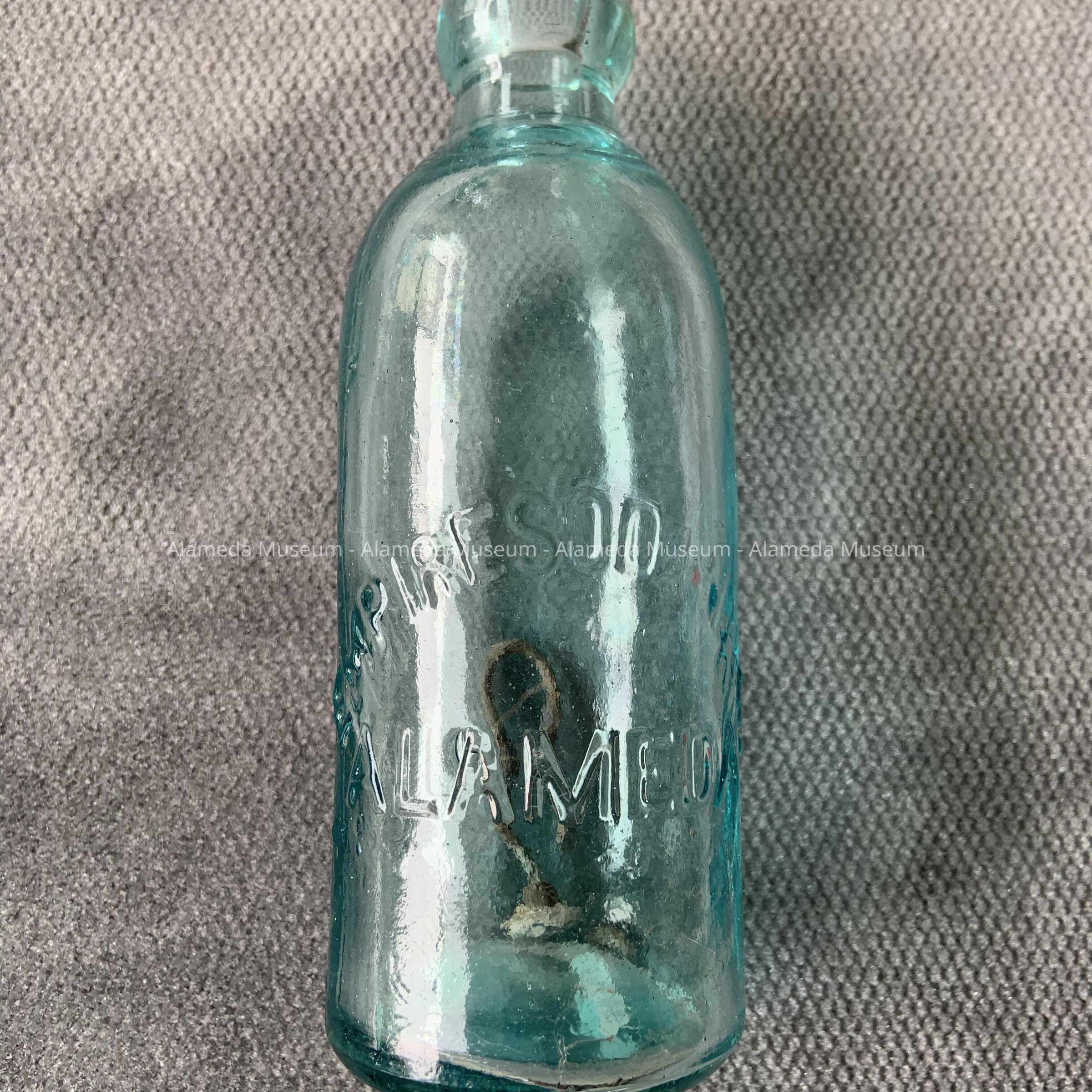 Double seamed aquamarine colored bottle with embossed lettering stating "Empire Soda Works-Alameda." Applied blob top. Original stopper (metal) at bottom of bottle.