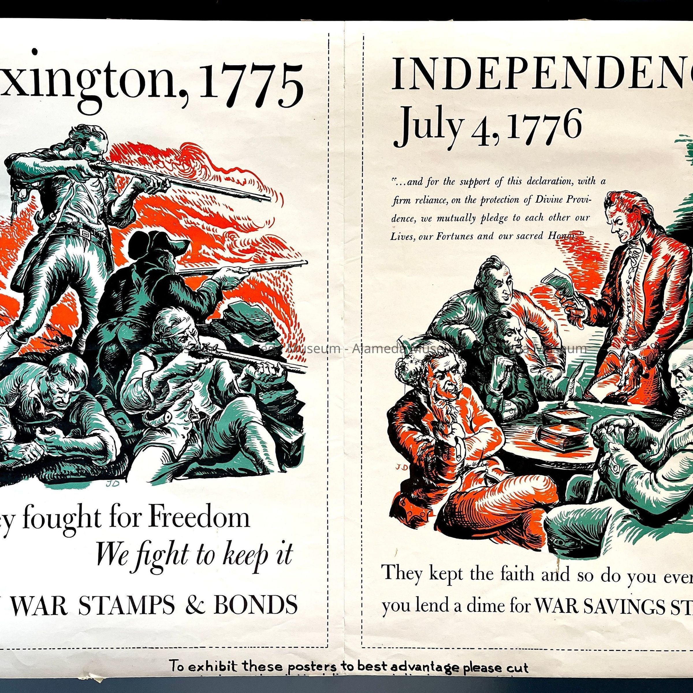 At right: Heading: ‘Independence / July 4, 1776’. Image shows Thomas Jefferson reading the Declaration of Independence while 4 other signers of it are seated around a table listening. Text under image: ‘They kept the faith and so do you every time / you lend a dime for WAR SAVINGS STAMPS.’