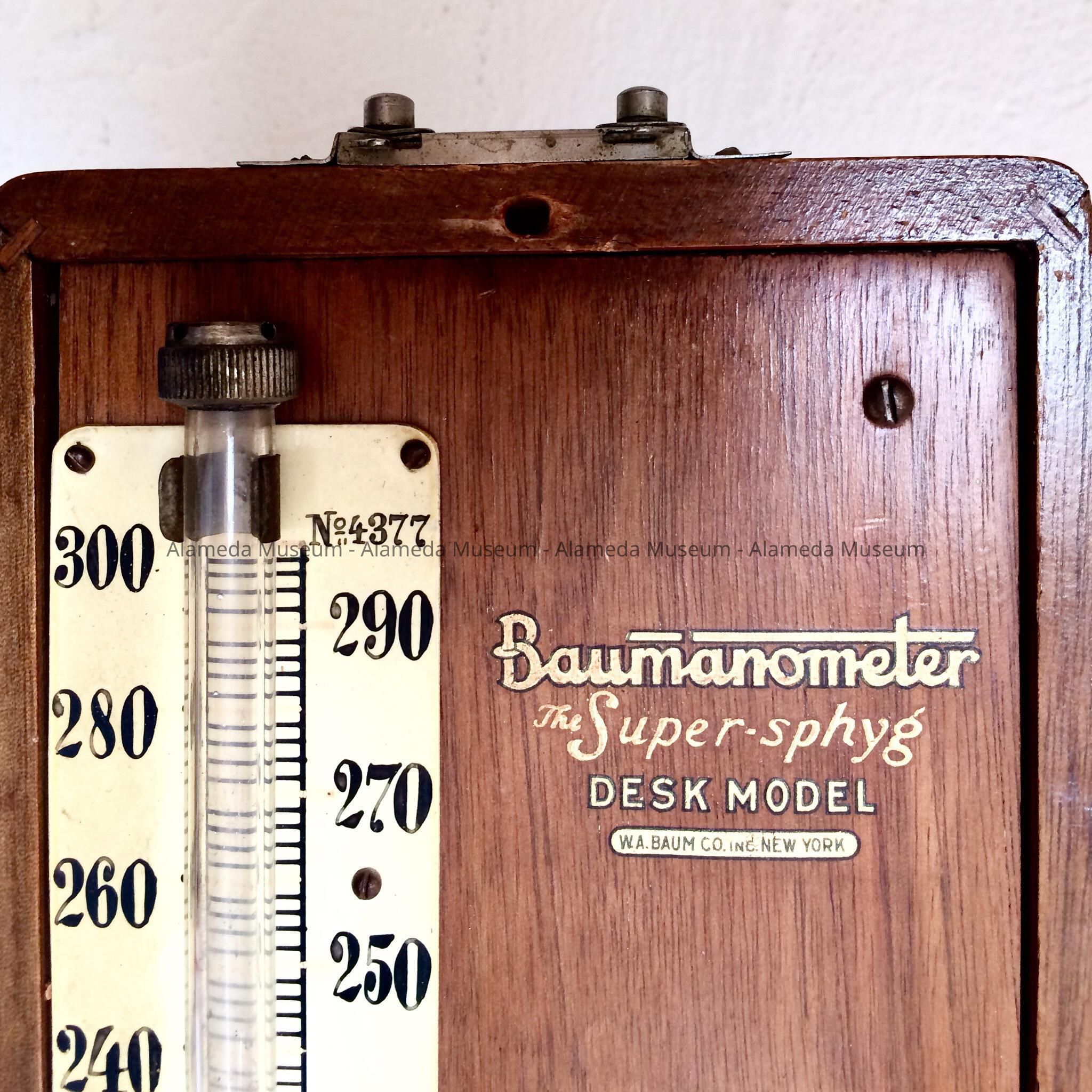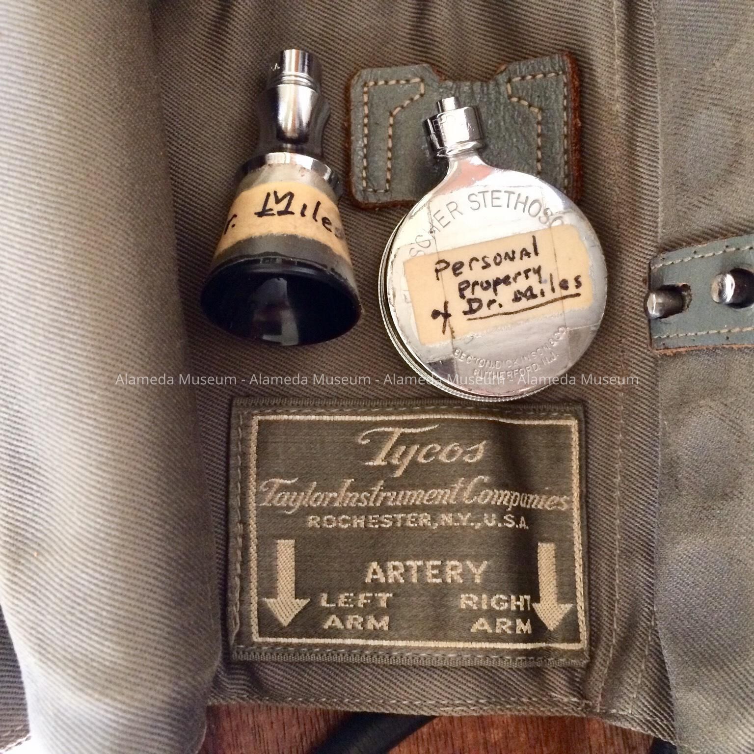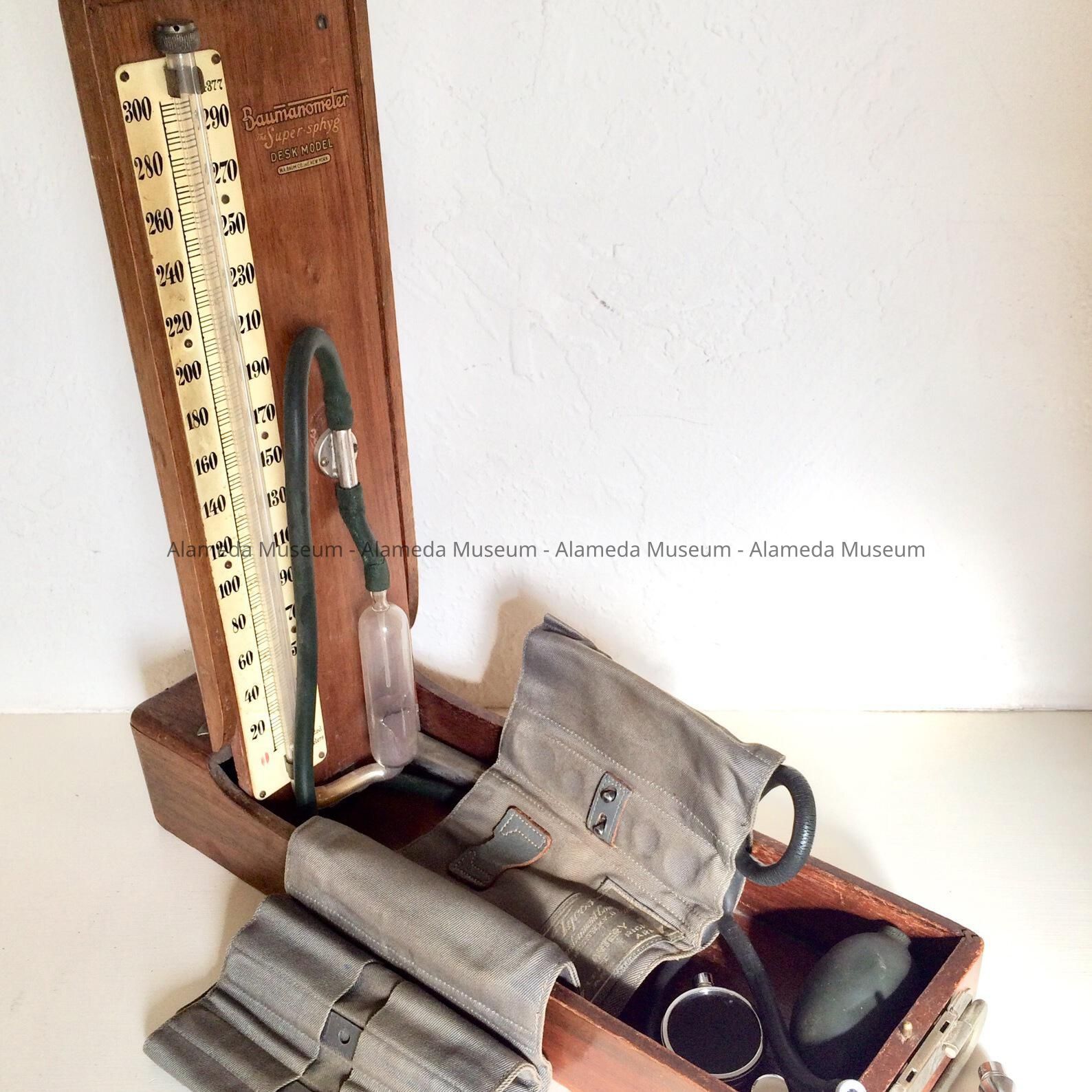 History of Object: A blood pressure measuring instrument that belonged to Dr. Robert H. Miles, long-time Alameda doctor. He was Jack Lalanne’s doctor for many years. Jack Lalanne, born in France, is dubbed the godfather of fitness. He got his doctor, the father of the donor, to start jogging. The donor's mother, Lola Miles, was a nurse at Alameda Hospital and she met Dr. Miles, then First ER intern, as they were wheeling in a gurney with a patient on it. She later was instrumental as a sales person and then manager at “Dorothy’s” sport shop in Alameda.